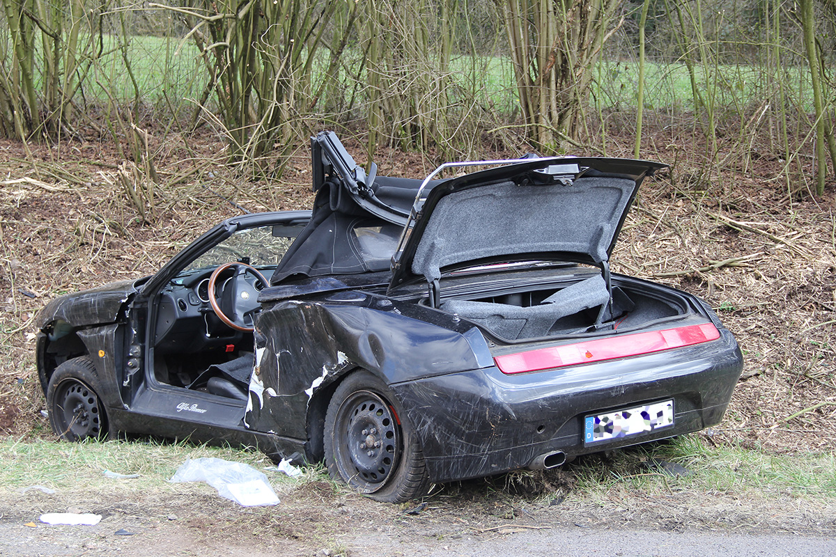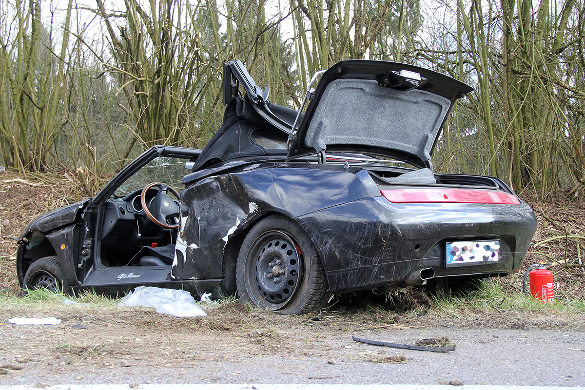 Der Fahrer wurde vom Notarzt vor Ort erstversorgt und zu weiteren Untersuchungen in ein Krankenhaus gebracht. Er erlitt bei dem Unfall schwere Verletzungen. An dem Alfa Romeo enstand Totalschaden. Als Unfallursache vermutet die Polizei zu hohe Geschwindigkeit.
