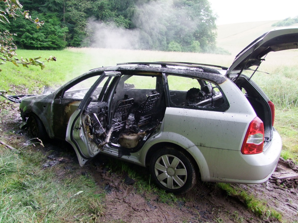 Komplett ausgebrannt ist ein Pkw am Abend des 28.06.2016 auf einem Feldweg in der Nähe…