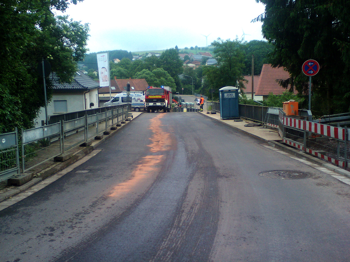 Ein Unbekannter hat am Morgen des 04. Juni 2016 in der Calmesweiler Straße im Ortsteil Bubach-Calmesweiler eine größere Ölspur verursacht. Verkehrsteilnehmer, die die Verschmutzung bemerkt hatten, informierten den Löschbezirksführer des Löschbezirks Bubach-Calmesweiler, der daraufhin mit einige Kameraden zur angegebenen Einsatzstelle ausrückten. In der Calmesweiler Straße und am Brunnenplatz zog sich die Spur stellenweise massiv über eine Fahrbahnhälfte. Die Einsatzkräfte sicherten die Einsatzstelle zusammen mit der Polizei und streuten die Verschmutzung mit Bindemitteln ab. Laut Polizei war der Verursacher der Ölspur nicht festzustellen. Der Einsatz war für die Feuerwehr nach rund einer Stunden beendet.