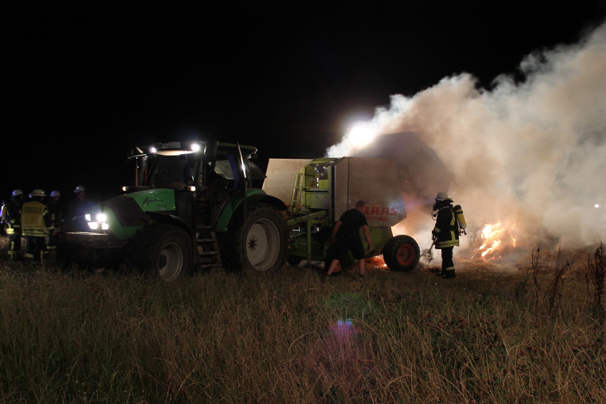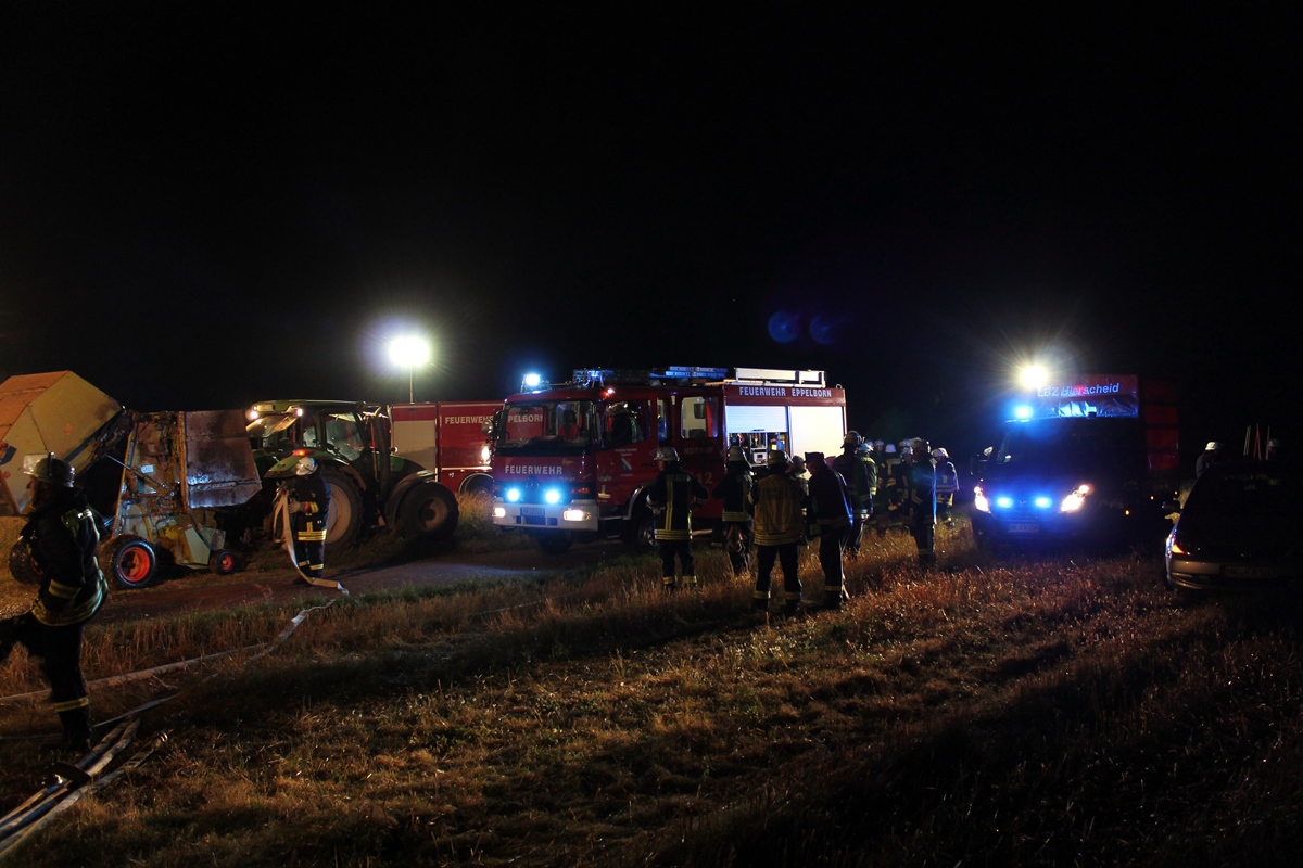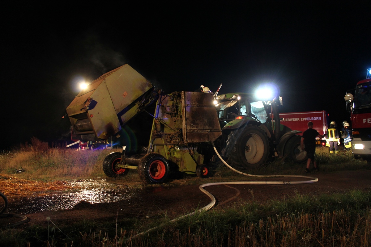 Wegen vorhergesagtem Regen für die kommenden Tage musste ein in der Umgebung ansässiger Landwirt eine Nachtschicht einlegen, um sein Futter trocken einlagern zu können. Als er gegen 00:20 Uhr mit dem Pressen von Strohballen auf dem großen Elmersberg in Hierscheid zugegen war, bemerkte der 24 jährige Führer der landwirtschaftlichen Maschine, der selbst aktives Mitglied der Freiwilligen Feuerwehr Eppelborn ist, dass in der angehangenen Rundballenpresse ein Feuer ausgebrochen war. Er zögerte nicht lange, brachte die brennende Maschine vom trockenen Feld auf eine Wiese und alarmierte sofort die Einsatzkräfte der Feuerwehr über den Notruf. Sofort wurden durch die Rettungsleitstelle mit dem Stichwort "Brand Fahrzeug groß" die Löschbezirke Hierscheid, Humes sowie Eppelborn auf die abgelegene Stelle auf dem großen Elmersberg alarmiert. Bei Ankunft der ersten Einheiten brannte das in der Presse befindliche Stroh im vollen Umfang. Da die Maschine noch funktionsfähig war, öffnete der Landwirt die Maschine und warf das darin befindliche, brennende Stroh aus. Mit Mistgabeln und einem weiteren Traktor mit Frontlader konnte das brennende Stroh auseinander gezogen und abgelöscht werden. Auch die Ballenpresse musste abgelöscht werden. Wegen der enormen Rauchentwicklung mussten die Arbeiten teilweise unter Atemschutz erfolgen. Da sich die Einsatzstelle abgelegen von der Bebauung uns somit auch weit entfern vom örtlichen Hydrantennetz befand, musste auf das Löschwasser der beiden wasserführenden Fahrzeuge der Löschbezirke Humes und Eppelborn zurückgegriffen werden. Das Tanklöschfahrzeug des Löschbezirk Eppelborn, das 2800 Liter Löschwasser mit sich führt, musste nochmals in den Ort um seinen Wassertank aufzufüllen. Das Feuer samt Glutnester konnte binnen 30 Minuten durch die Einsatzkräfte gelöscht werden. An der landwirtschaftlichen Maschine entstand erheblicher Sachschaden. Wodurch das Feuer ausbrach ist bisher unklar. Es ist von einem technischen Defekt auszugehen. Der Einsatz war nach rund einer Stunde für die Feuerwehr beendet.