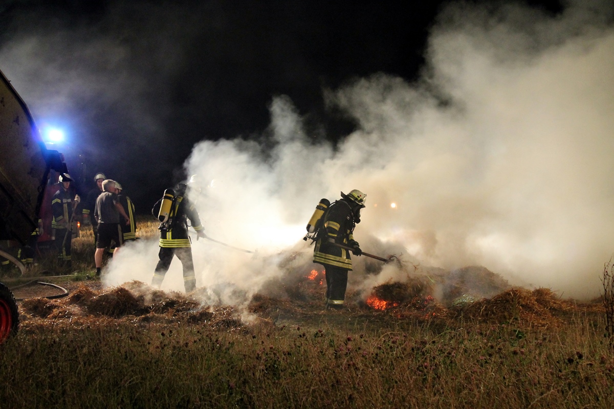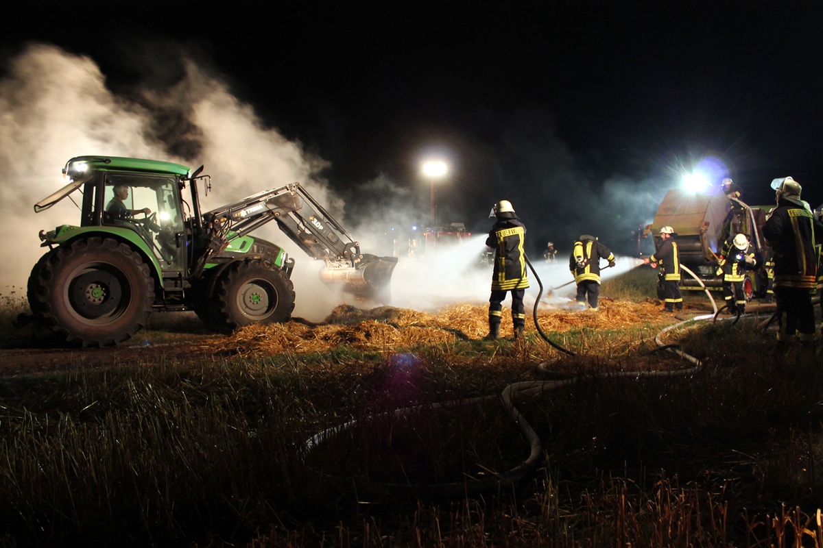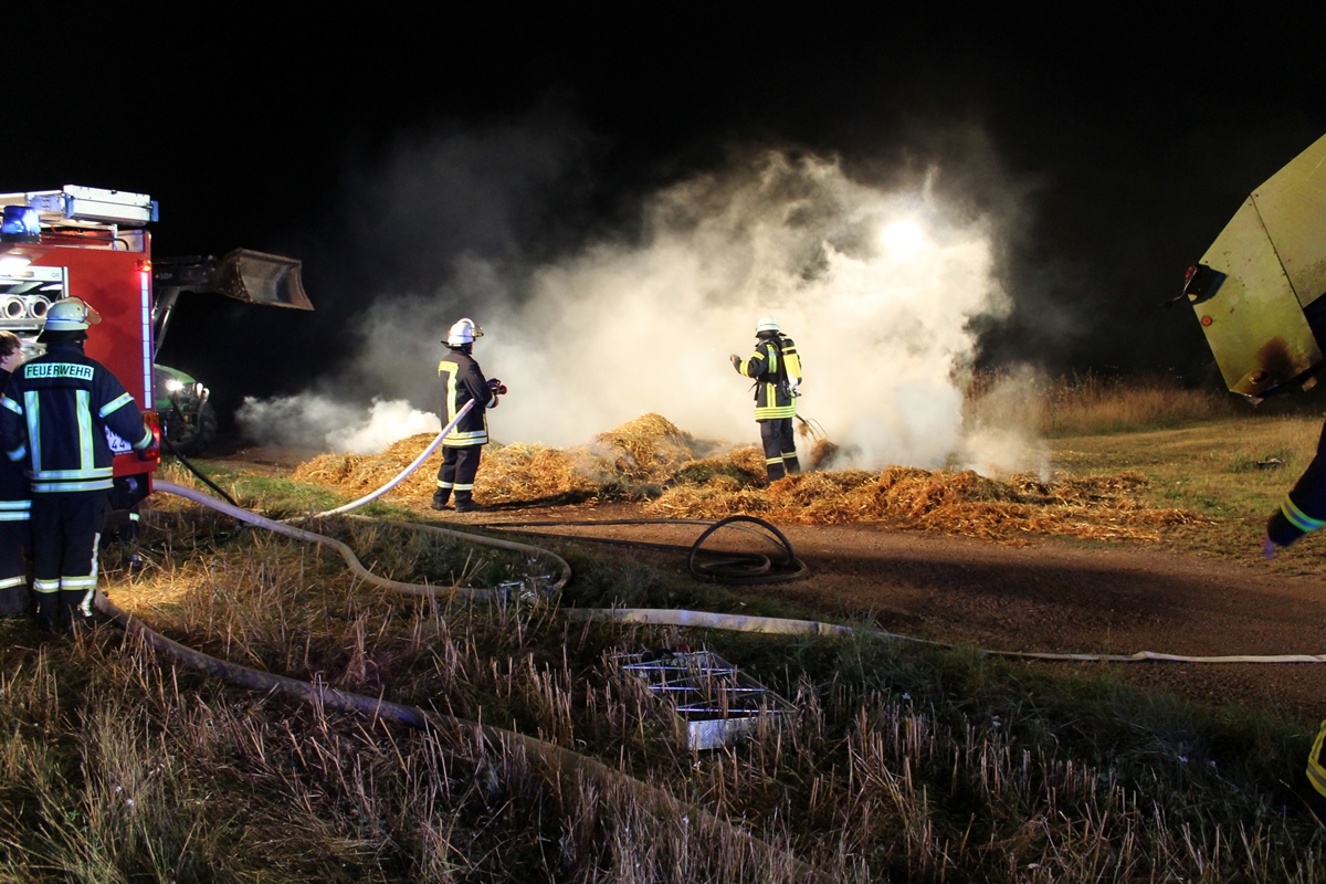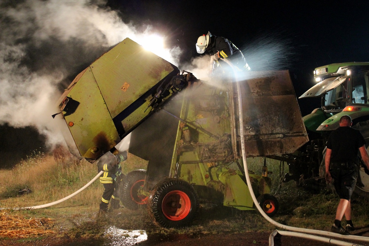 Wegen vorhergesagtem Regen für die kommenden Tage musste ein in der Umgebung ansässiger Landwirt eine Nachtschicht einlegen, um sein Futter trocken einlagern zu können. Als er gegen 00:20 Uhr mit dem Pressen von Strohballen auf dem großen Elmersberg in Hierscheid zugegen war, bemerkte der 24 jährige Führer der landwirtschaftlichen Maschine, der selbst aktives Mitglied der Freiwilligen Feuerwehr Eppelborn ist, dass in der angehangenen Rundballenpresse ein Feuer ausgebrochen war. Er zögerte nicht lange, brachte die brennende Maschine vom trockenen Feld auf eine Wiese und alarmierte sofort die Einsatzkräfte der Feuerwehr über den Notruf. Sofort wurden durch die Rettungsleitstelle mit dem Stichwort "Brand Fahrzeug groß" die Löschbezirke Hierscheid, Humes sowie Eppelborn auf die abgelegene Stelle auf dem großen Elmersberg alarmiert. Bei Ankunft der ersten Einheiten brannte das in der Presse befindliche Stroh im vollen Umfang. Da die Maschine noch funktionsfähig war, öffnete der Landwirt die Maschine und warf das darin befindliche, brennende Stroh aus. Mit Mistgabeln und einem weiteren Traktor mit Frontlader konnte das brennende Stroh auseinander gezogen und abgelöscht werden. Auch die Ballenpresse musste abgelöscht werden. Wegen der enormen Rauchentwicklung mussten die Arbeiten teilweise unter Atemschutz erfolgen. Da sich die Einsatzstelle abgelegen von der Bebauung uns somit auch weit entfern vom örtlichen Hydrantennetz befand, musste auf das Löschwasser der beiden wasserführenden Fahrzeuge der Löschbezirke Humes und Eppelborn zurückgegriffen werden. Das Tanklöschfahrzeug des Löschbezirk Eppelborn, das 2800 Liter Löschwasser mit sich führt, musste nochmals in den Ort um seinen Wassertank aufzufüllen. Das Feuer samt Glutnester konnte binnen 30 Minuten durch die Einsatzkräfte gelöscht werden. An der landwirtschaftlichen Maschine entstand erheblicher Sachschaden. Wodurch das Feuer ausbrach ist bisher unklar. Es ist von einem technischen Defekt auszugehen. Der Einsatz war nach rund einer Stunde für die Feuerwehr beendet.