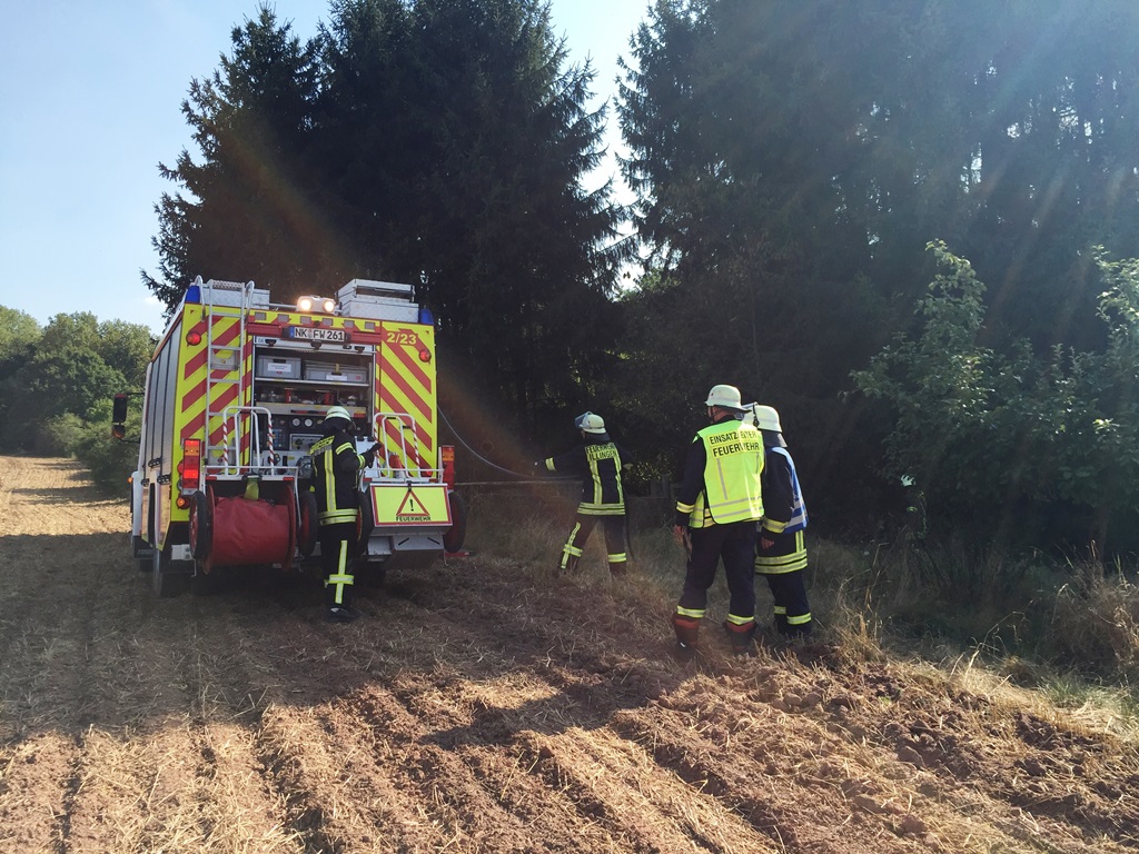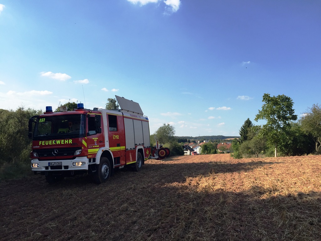 Das zuerst eingetroffene Tanklöschfahrzeug TLF 20/30 aus dem Löschbezirk Uchtelfangen, welches über ein Allradfahrgestell verfügt, konnte sofort über das gegrubberte Stoppelfeld zum abgelegenen Brandherd vordringen.
