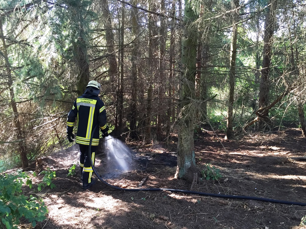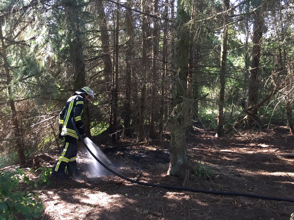 Vor Ort konnte in einem kleinen Tannenwäldchen ein Flächenbrand auf dem trockenen und dürren Waldboden vorgefunden werden, welcher glücklicherweise bereits bei Ankunft nur noch vor sich hin glühte. Die noch vorhandenen Glutnester wurden mit der Schnellangriffseinrichtung des Tanklöschfahrzeugs gelöscht, sodass keine Gefahr des Wiederentzündens besteht.