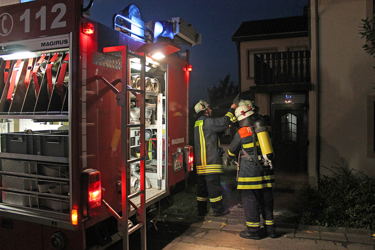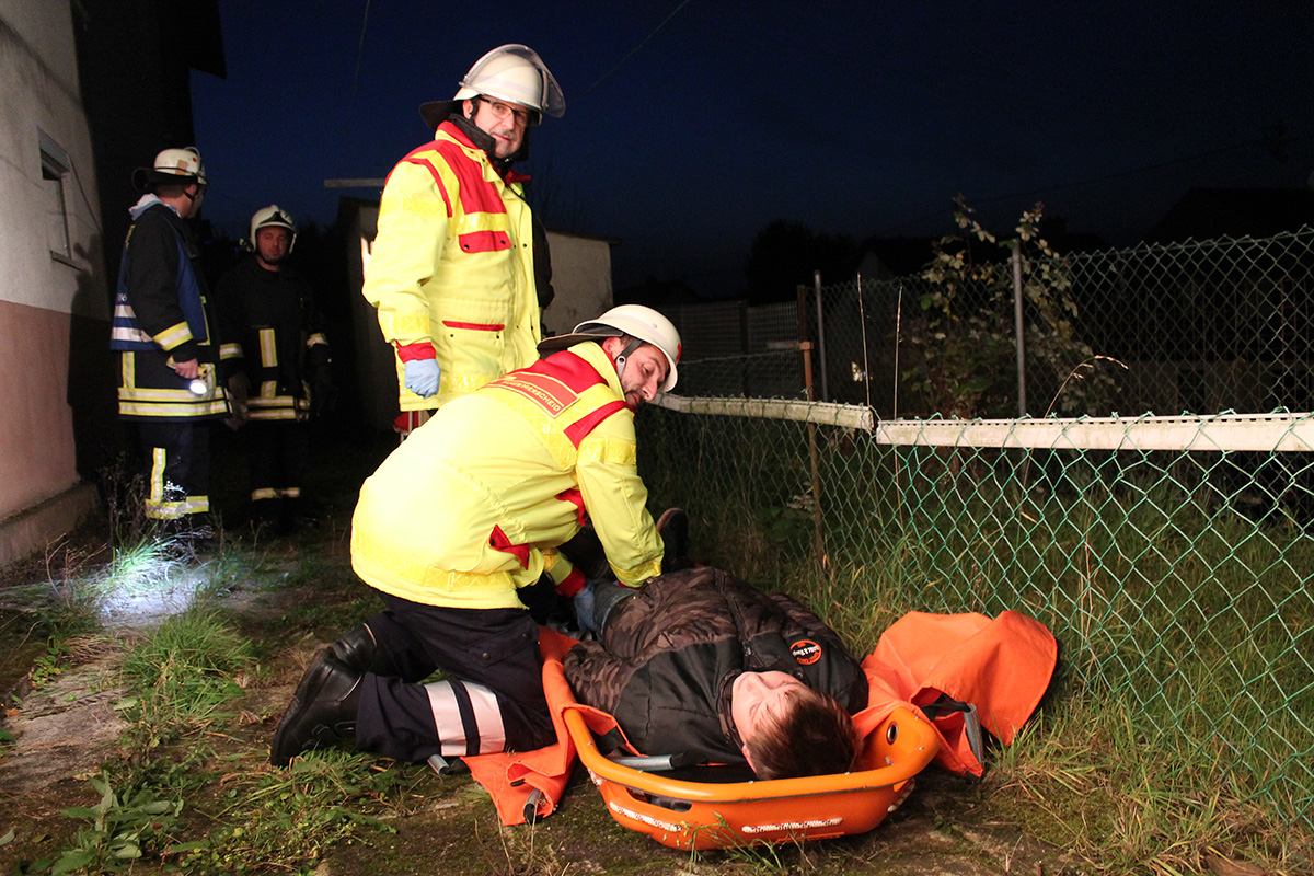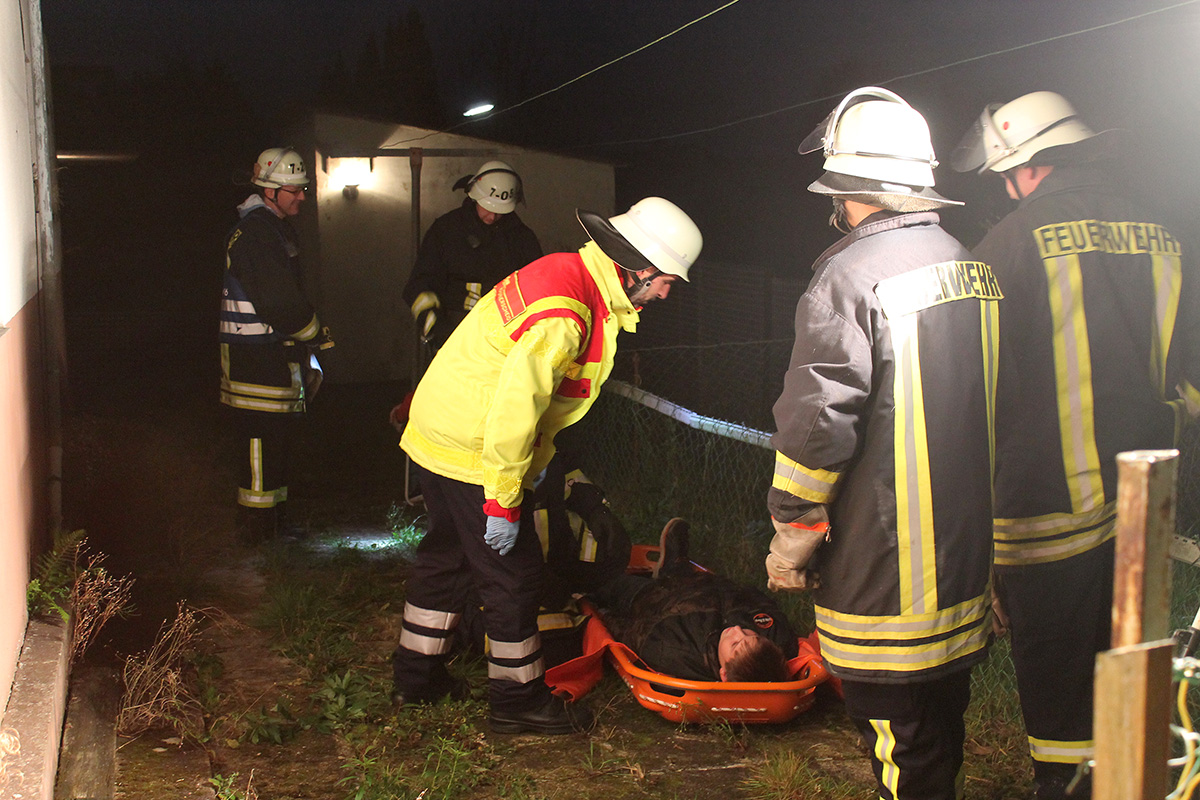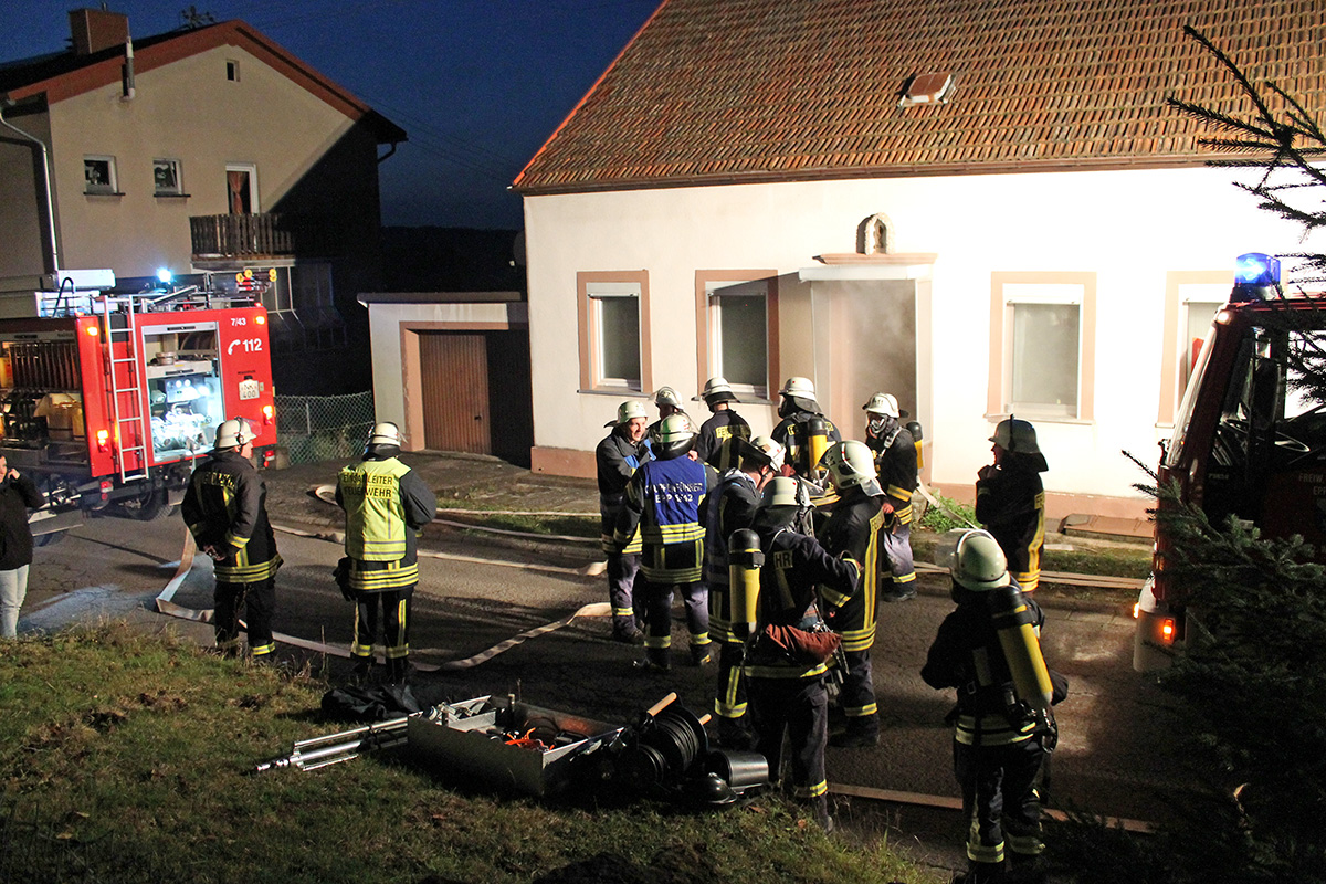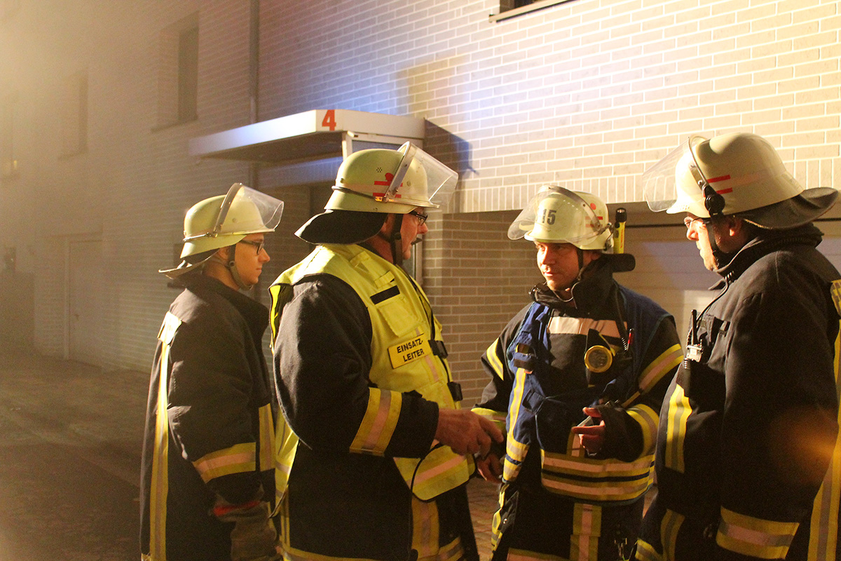 Der Brand war im Heizungsraum im Keller ausgebrochen und konnte sich durch einen Versorgungsschacht schnell bis zum Badezimmer im Erdgeschoss ausbreiten. Vier Personen mussten in dem komplett verrauchten Gebäude gefunden und der Brand bekämpft werden. Mit Atemschutzgeräten ausgerüstet wurde die Räume von mehreren Trupps abgesucht und die vermissten Bewohner schnell gerettet. Die Helfer der First-Responder-Gruppe übernahmen dann vor dem Gebäude die weitere Betreuung und Versorgung.