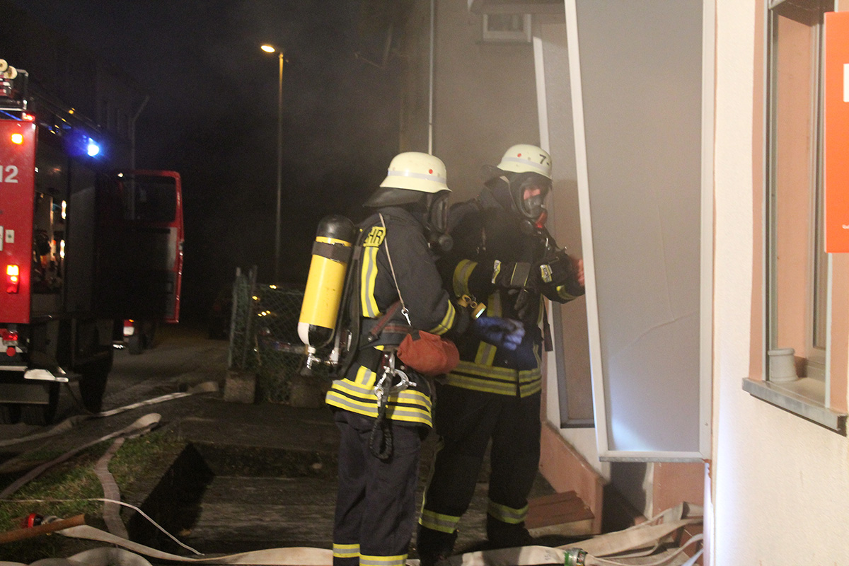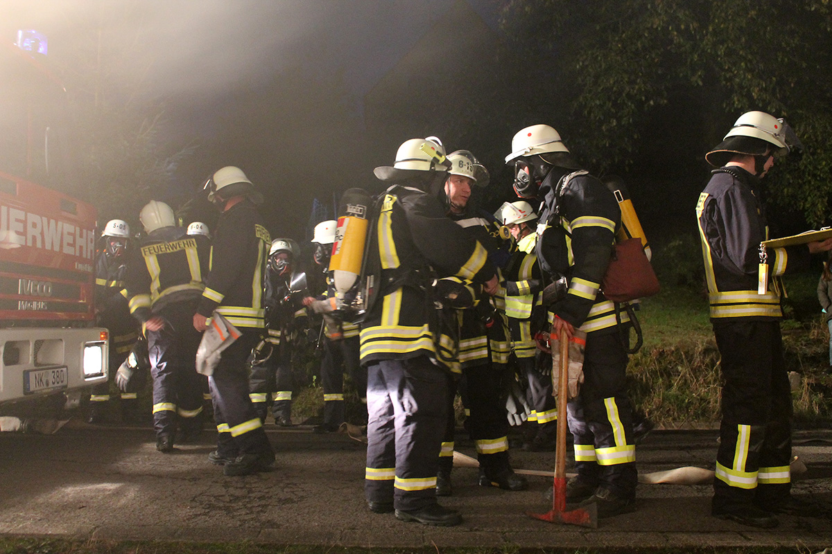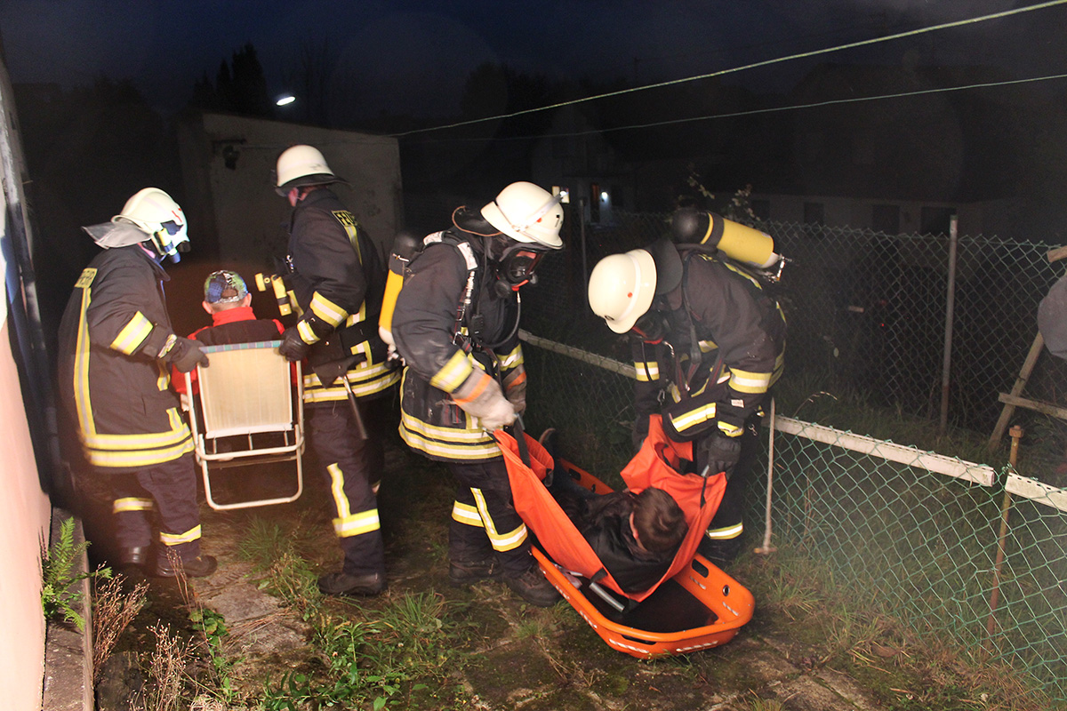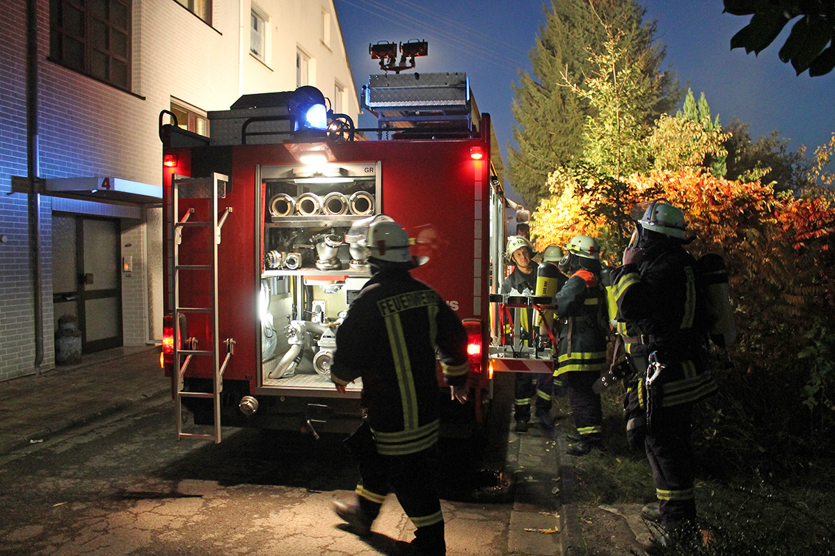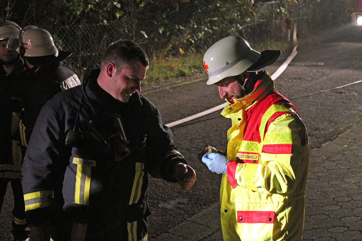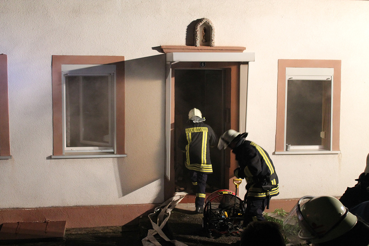 Der Brand war im Heizungsraum im Keller ausgebrochen und konnte sich durch einen Versorgungsschacht schnell bis zum Badezimmer im Erdgeschoss ausbreiten. Vier Personen mussten in dem komplett verrauchten Gebäude gefunden und der Brand bekämpft werden. Mit Atemschutzgeräten ausgerüstet wurde die Räume von mehreren Trupps abgesucht und die vermissten Bewohner schnell gerettet. Die Helfer der First-Responder-Gruppe übernahmen dann vor dem Gebäude die weitere Betreuung und Versorgung.