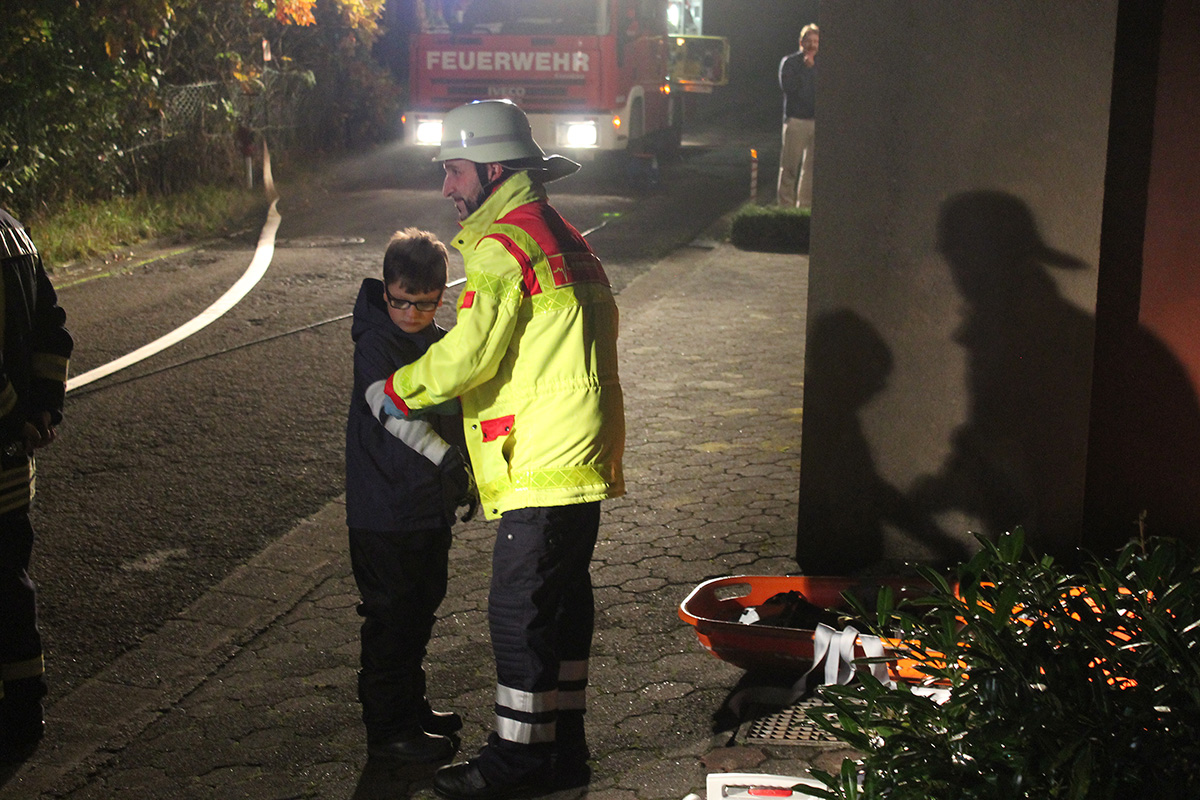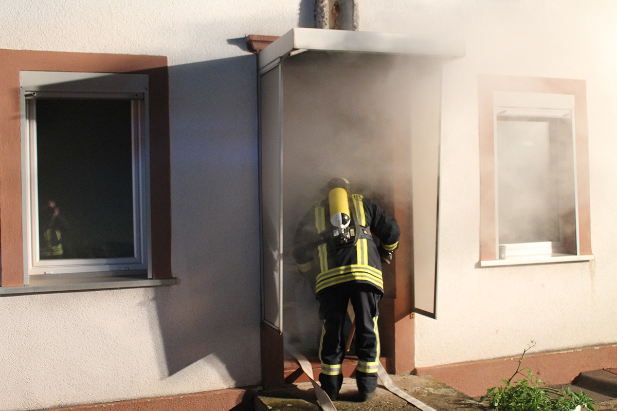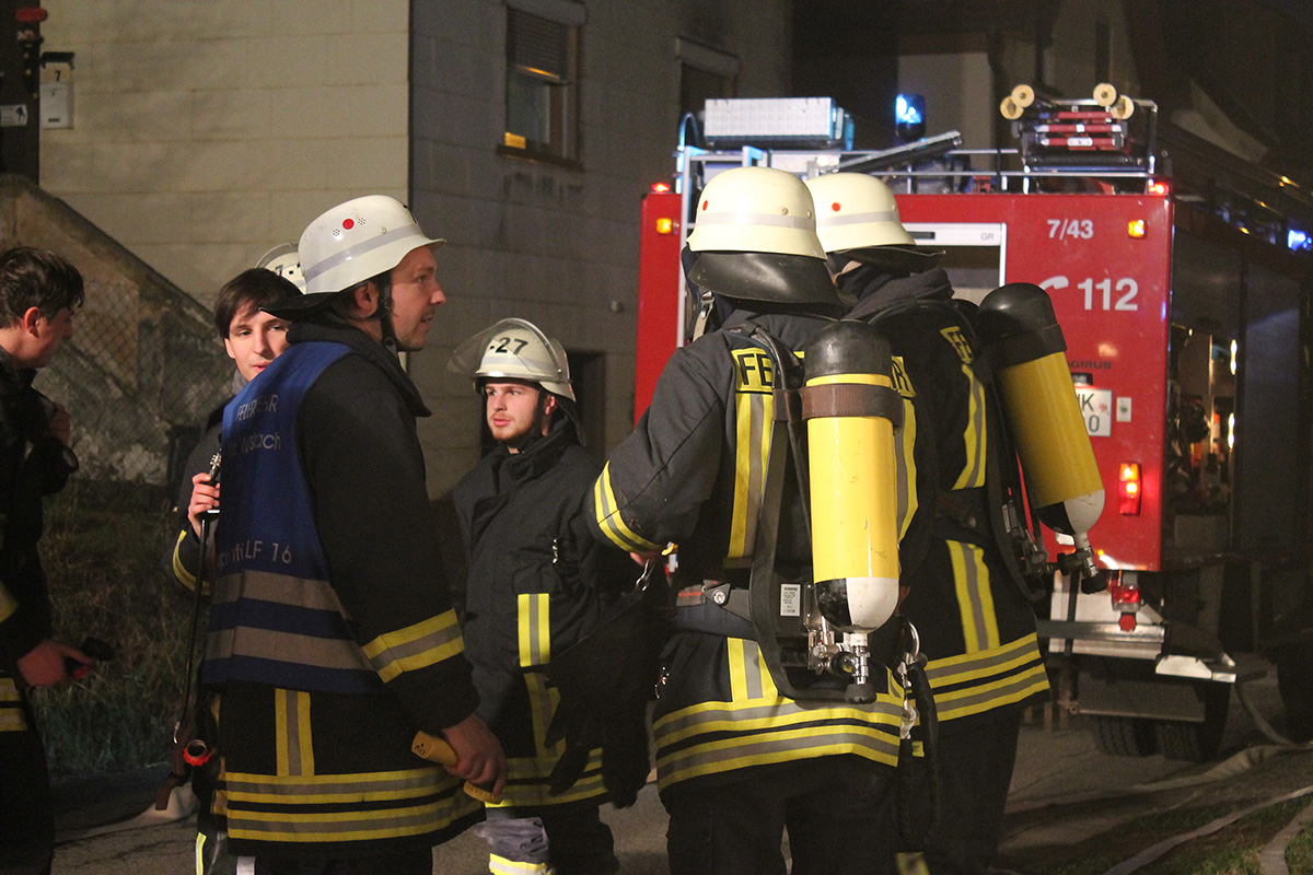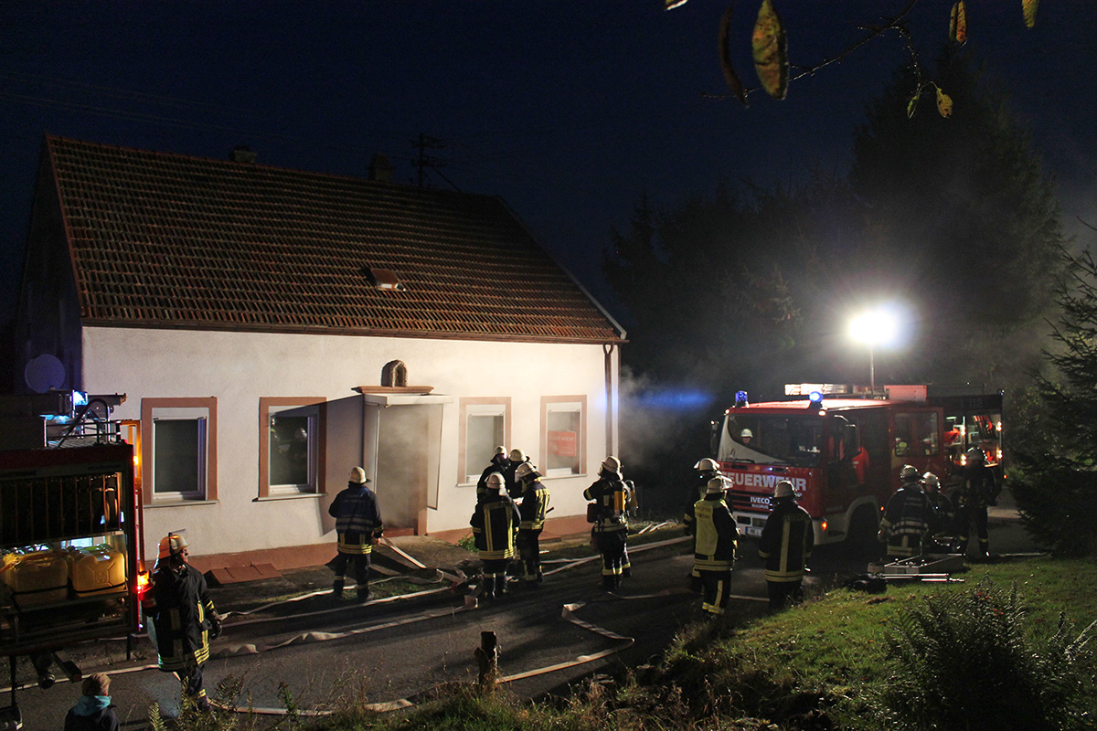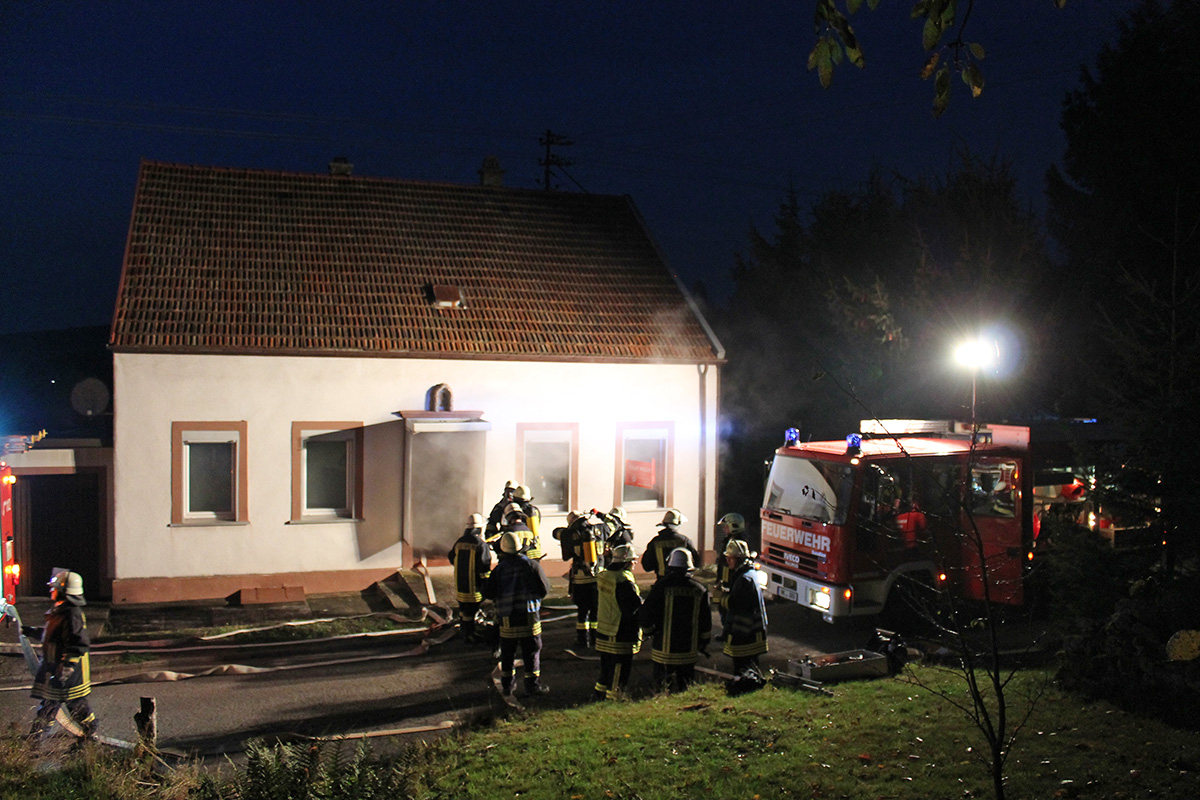 Der Brand war im Heizungsraum im Keller ausgebrochen und konnte sich durch einen Versorgungsschacht schnell bis zum Badezimmer im Erdgeschoss ausbreiten. Vier Personen mussten in dem komplett verrauchten Gebäude gefunden und der Brand bekämpft werden. Mit Atemschutzgeräten ausgerüstet wurde die Räume von mehreren Trupps abgesucht und die vermissten Bewohner schnell gerettet. Die Helfer der First-Responder-Gruppe übernahmen dann vor dem Gebäude die weitere Betreuung und Versorgung.