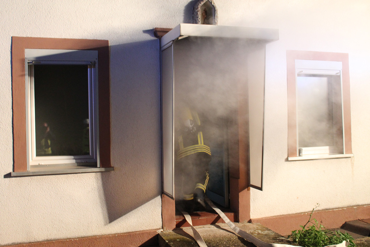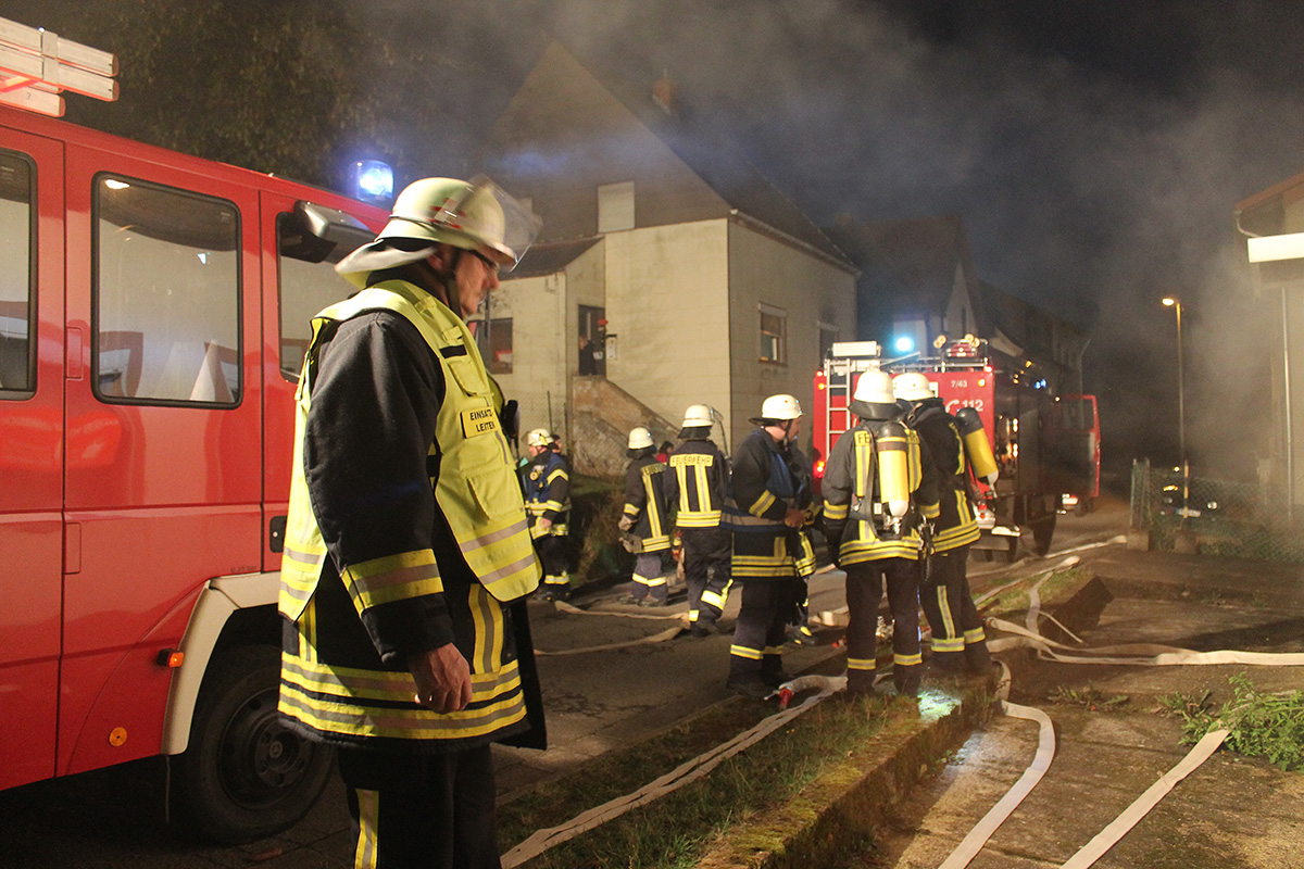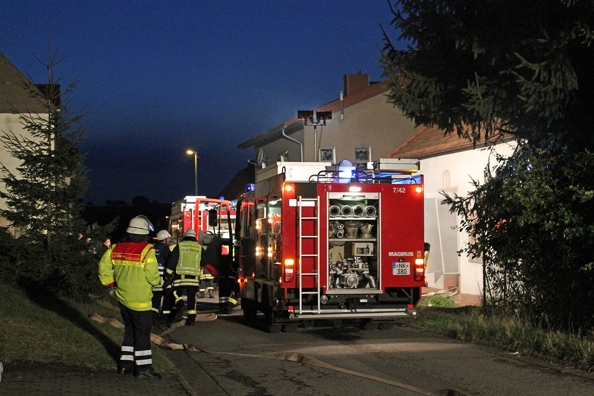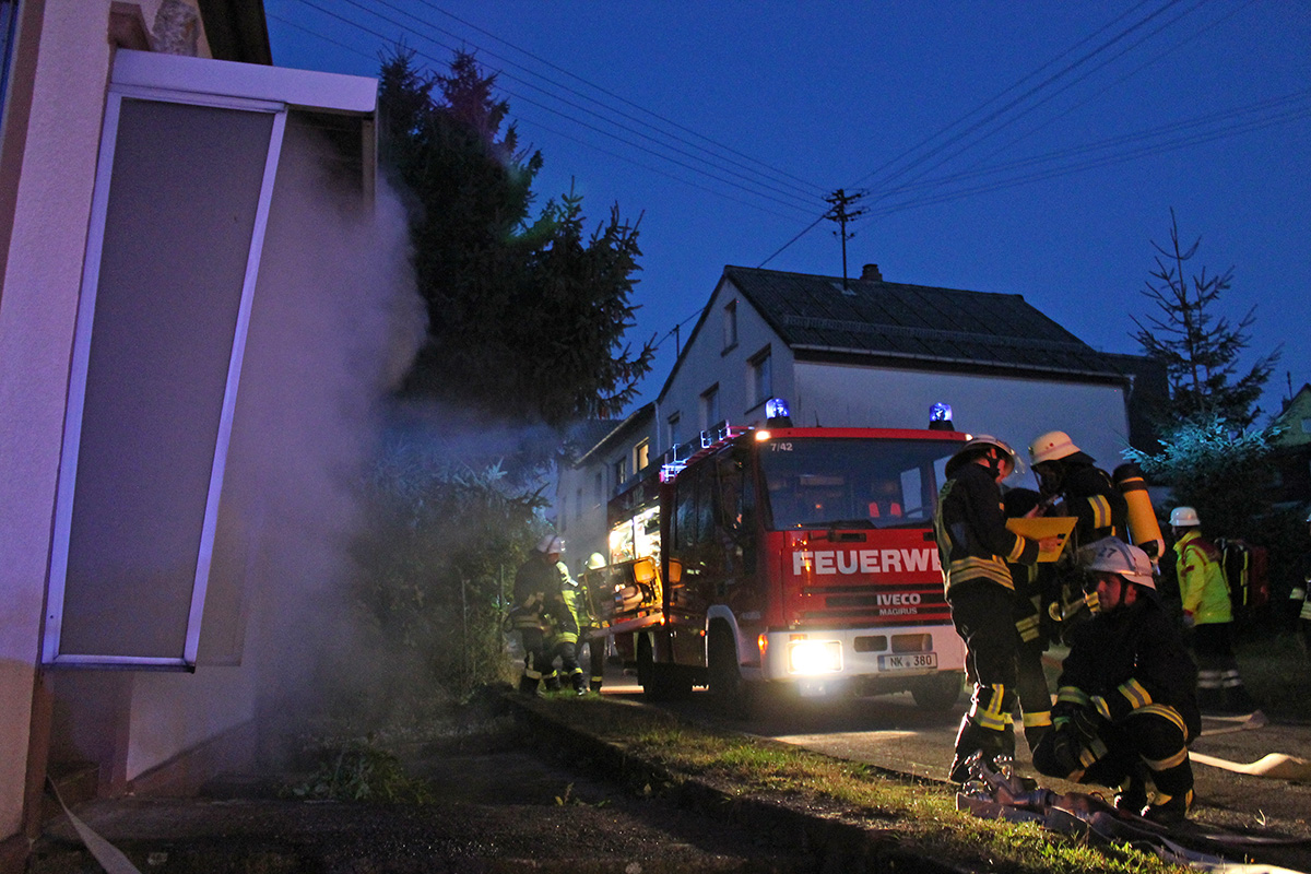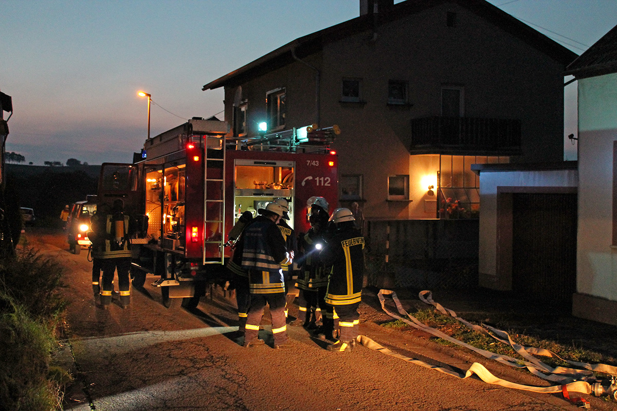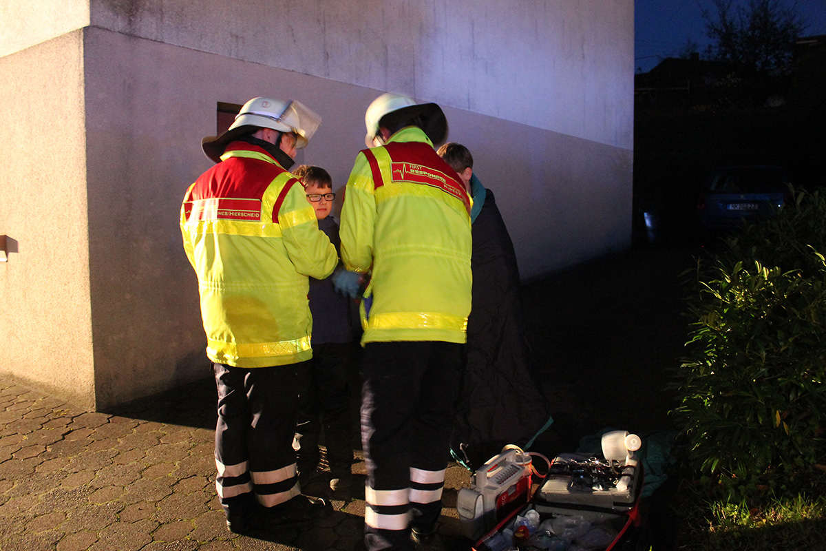 Der Brand war im Heizungsraum im Keller ausgebrochen und konnte sich durch einen Versorgungsschacht schnell bis zum Badezimmer im Erdgeschoss ausbreiten. Vier Personen mussten in dem komplett verrauchten Gebäude gefunden und der Brand bekämpft werden. Mit Atemschutzgeräten ausgerüstet wurde die Räume von mehreren Trupps abgesucht und die vermissten Bewohner schnell gerettet. Die Helfer der First-Responder-Gruppe übernahmen dann vor dem Gebäude die weitere Betreuung und Versorgung.
