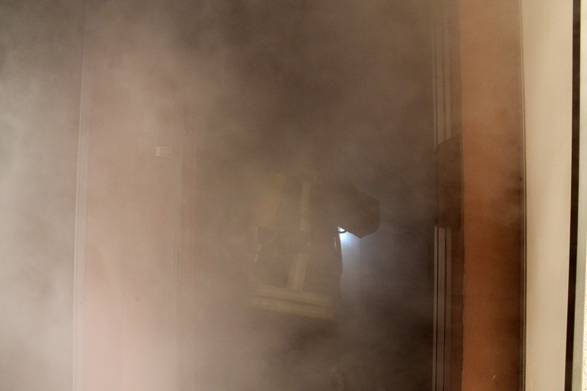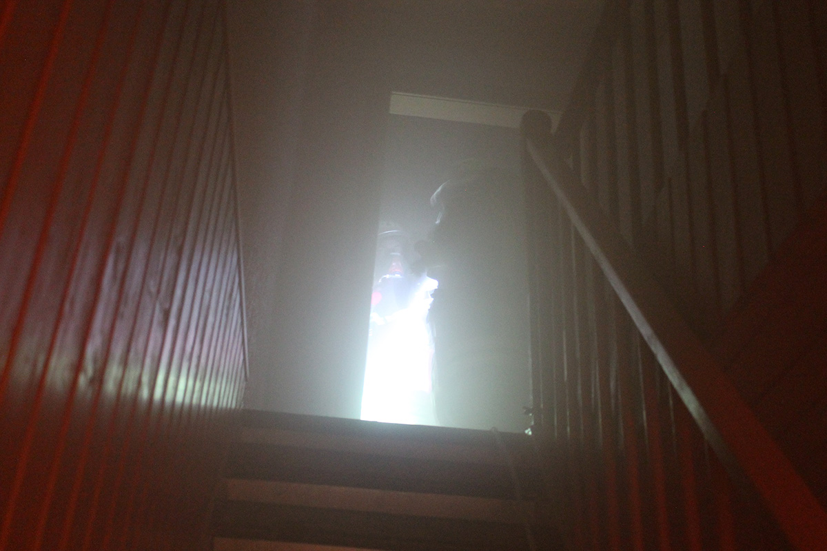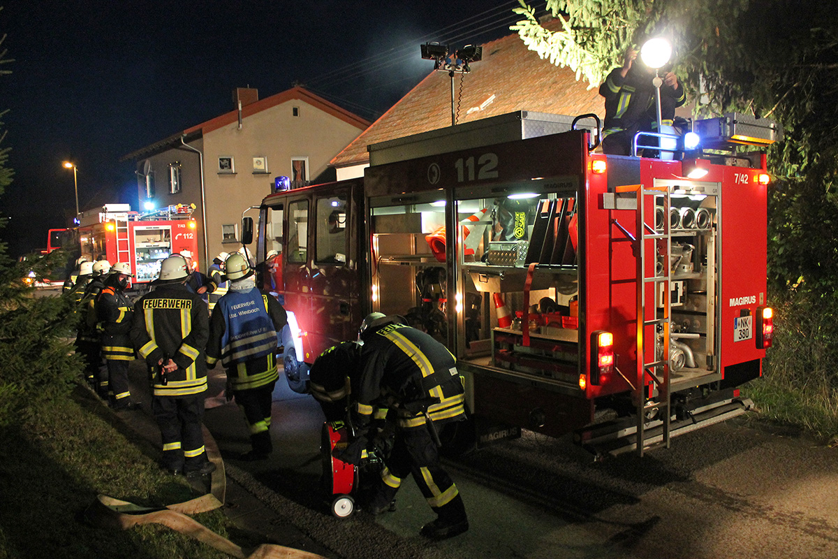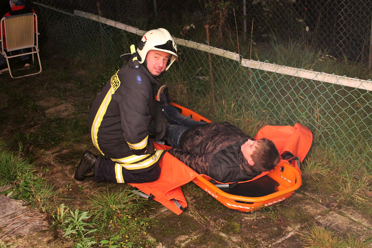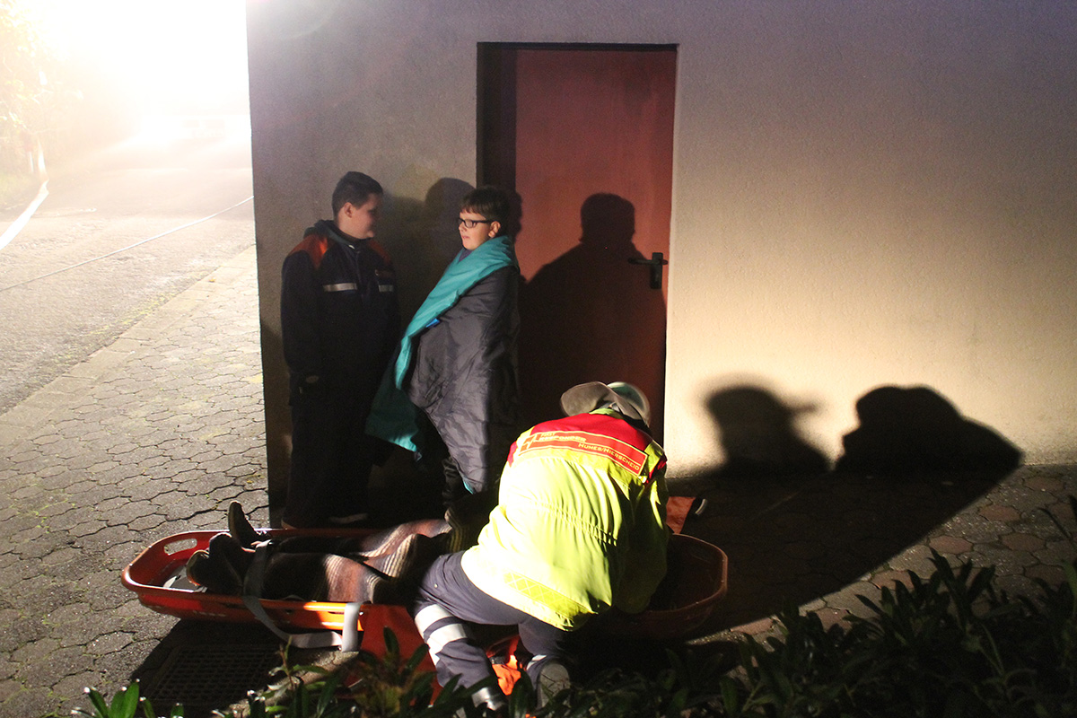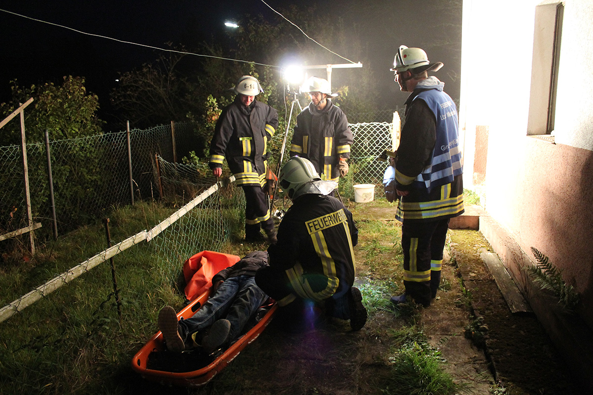 Aufgrund der Dunkelheit musste die Einsatzstelle ausgeleuchtet werden. Die beiden Brände im Keller und im Erdgeschoss konnten ebenfalls schnell gelöscht werden. Mit einem Überdrucklüfter konnte dann der Brandrauch, der in diesem Fall aus einer Nebelmaschine kam, aus den Räumen geblasen werden.