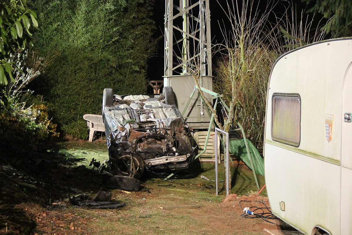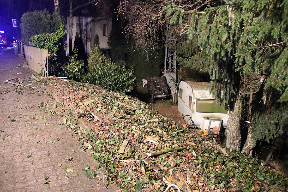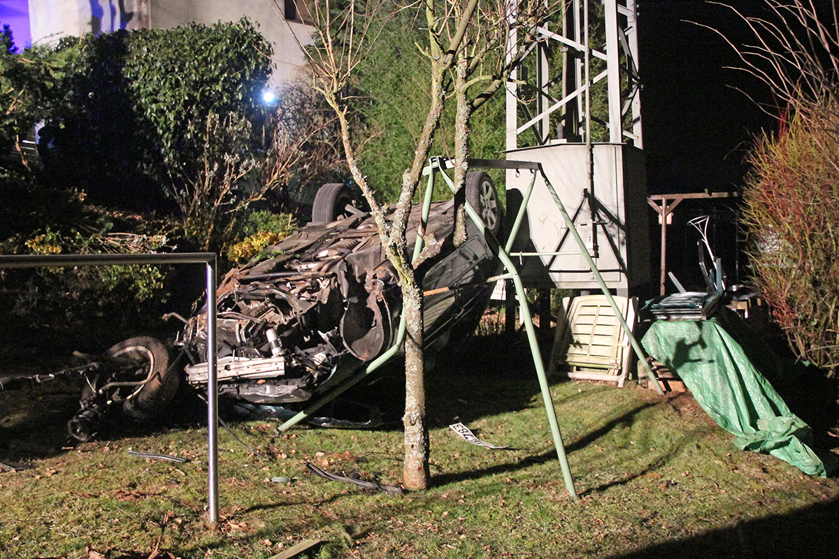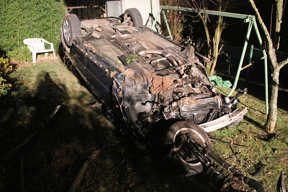 Ein schwerer aber kurioser Verkehrsunfall ereignete sich am Morgen des 26. Januar 2017 in der Ortsstraße in Hierscheid: Ein Pkw war dort um kurz nach 5:00 Uhr in einer Linkskurve nach rechts von der Fahrbahn abgekommen, durchbrach einen Zaun, kollidierte mit einem Baum und blieb dann nach einem Überschlag kopfüber 3 Meter tiefer neben einem Strommasten liegen.