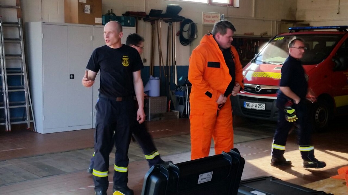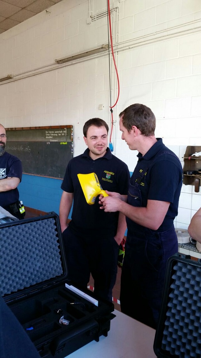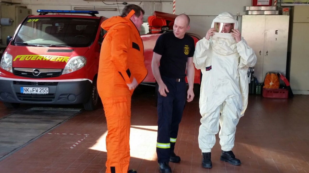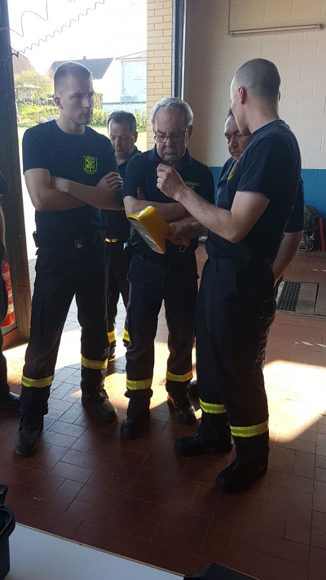 Ebenso wurde die erforderliche Schutzausrüstung, wie z.B. der Kontaminationsschutzanzug, vorgestellt und das Anlegen geübt. Des Weiteren konnten die Kameraden beider Löschbezirke die neuen Messgeräte zur Erkennung einer Kontamination mit Gefahrstoffen in praxisnahen Beispielen ausprobieren.