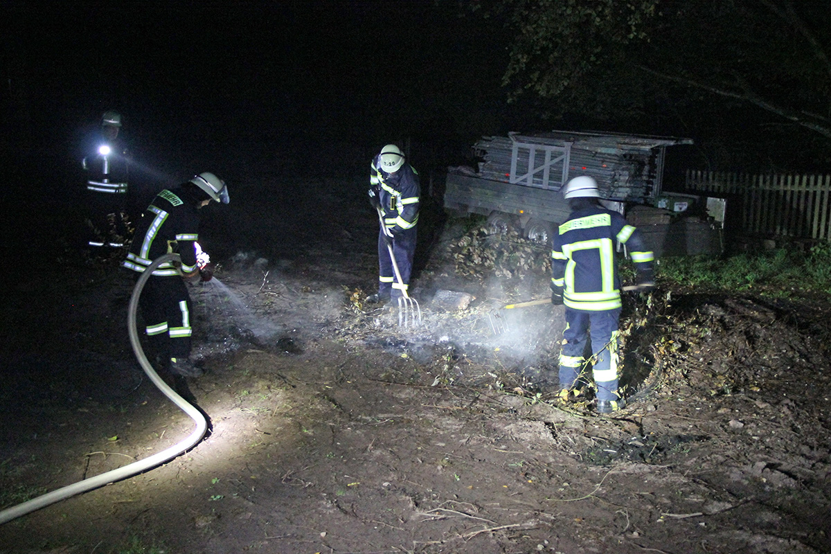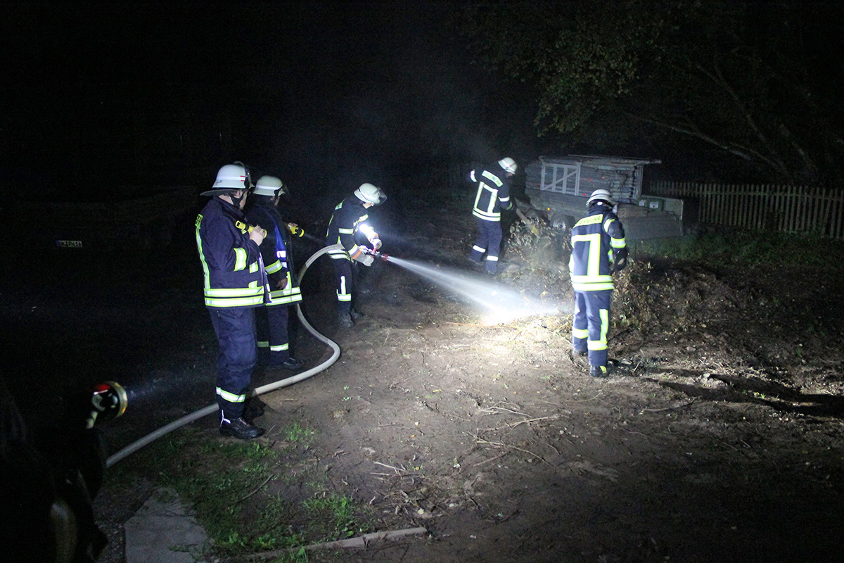 Hinter dem Anwesen, das gerade renoviert wird, fanden die angerückten Einsatzkräfte einen kleineren Haufen mit Unrat vor, der in Brand geraten war. Mit einem C-Rohr war das Feuer schnell gelöscht. Sachschaden entstand keiner, die Brandursache ist ungeklärt.