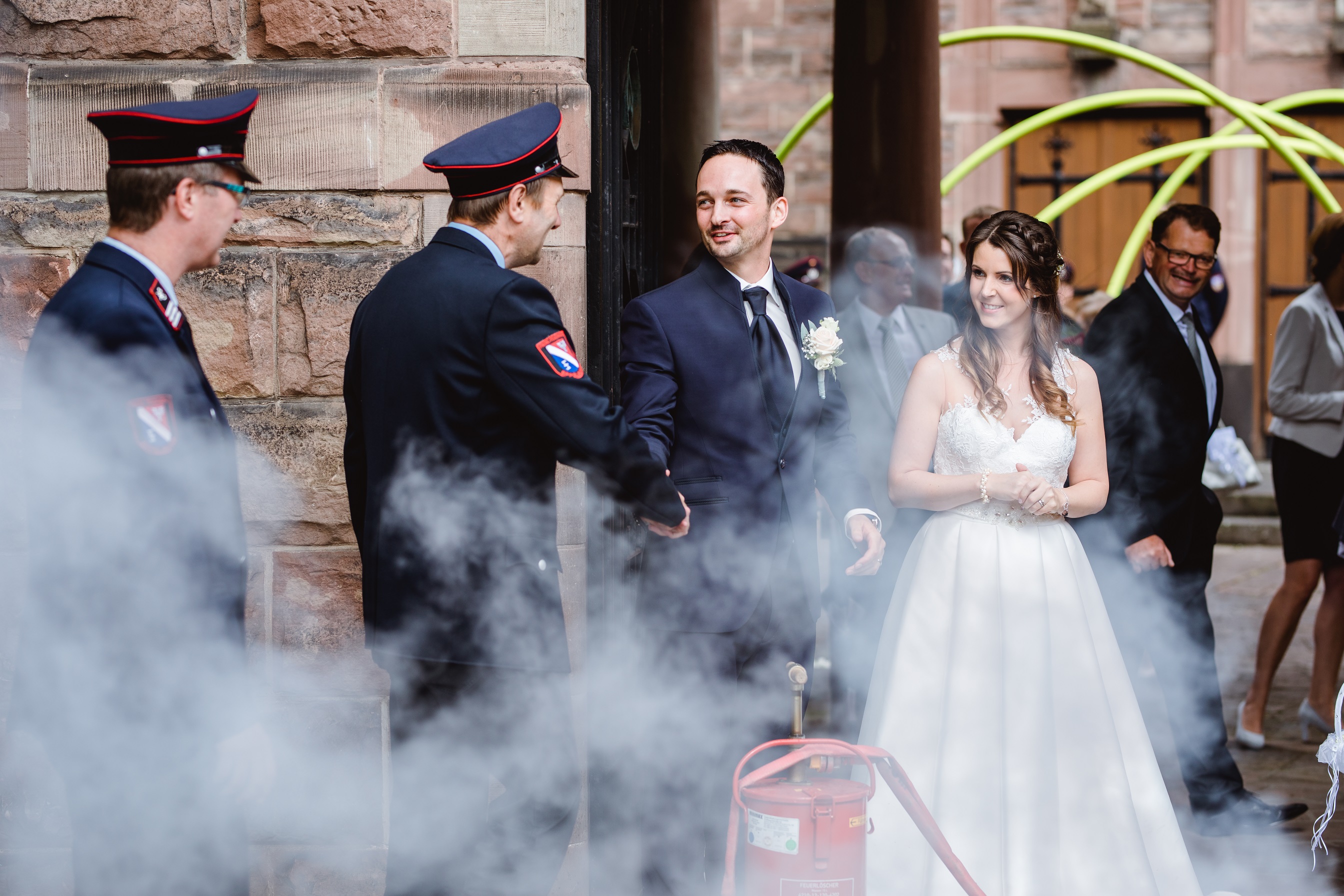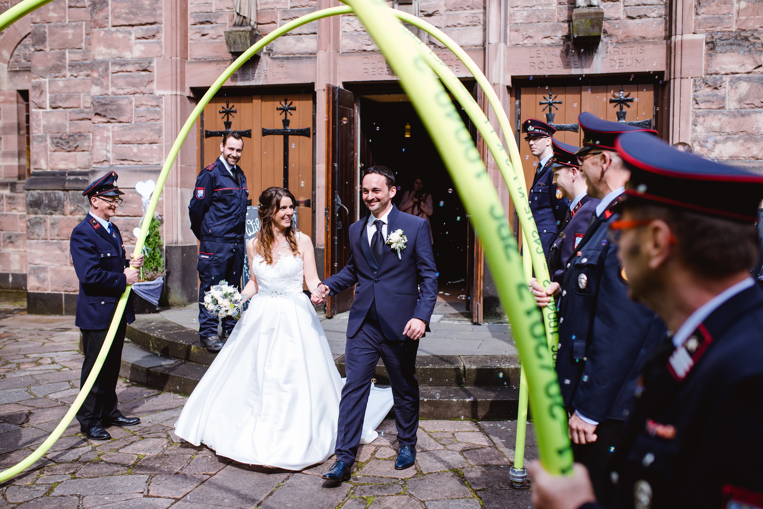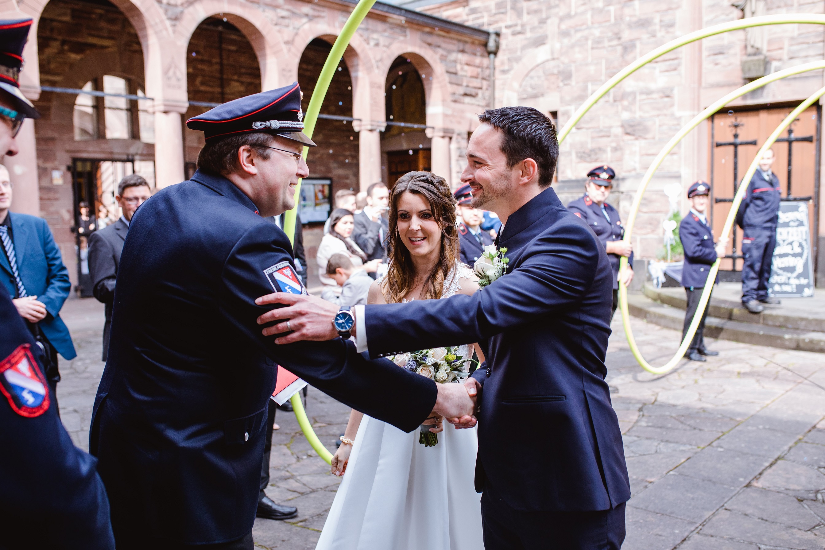 Am 02. September gaben sich das aktive Mitglied des Löschbezirks Wiesbach und Atemschutzwart Henning Steil und seine Janine in Saarbrücken das Ja-Wort. Natürlich lies es sich eine Abordnung des Löschbezirk Wiesbach nicht nehmen und scheute auch den langen Anfahrtweg nicht, um den beiden im Anschluss an die Trauung, spalier zu stehen und das frisch vermählte Brautpaar gebührend in Empfang zu nehmen. Henning und Janine konnten im Anschluss auch noch zeigen, dass sie mit der Kübelspritze ein gutes Team bilden und ein Feuer zu löschen wissen. Auch an dieser Stelle noch die allerbesten Wünsche auf dem gemeinsamen Lebensweg. Danke auch an Annika und Gabriel Fotografie zur Verfügungstellung der Bilder.
