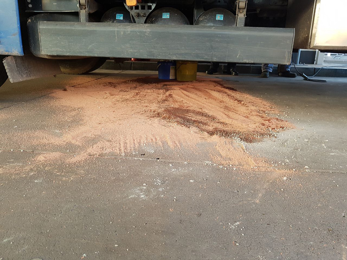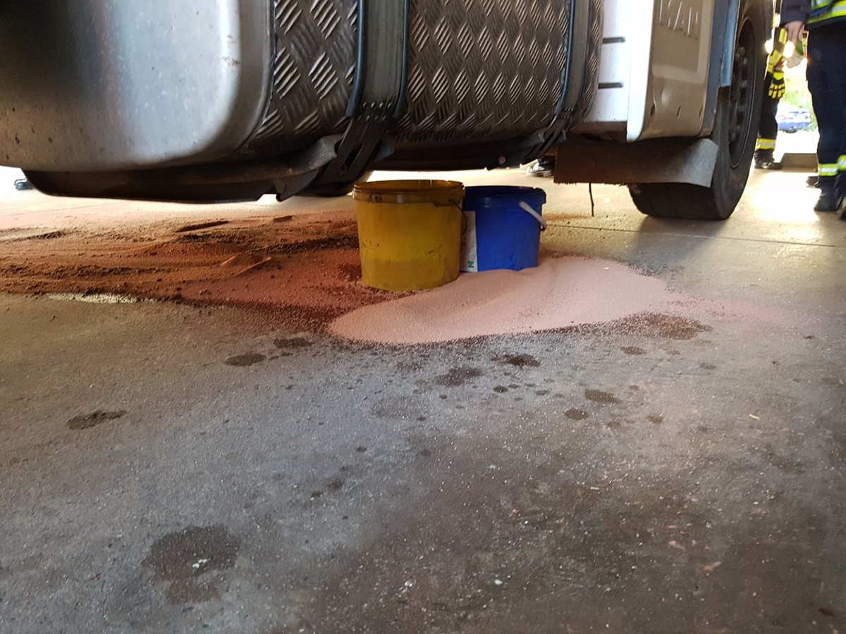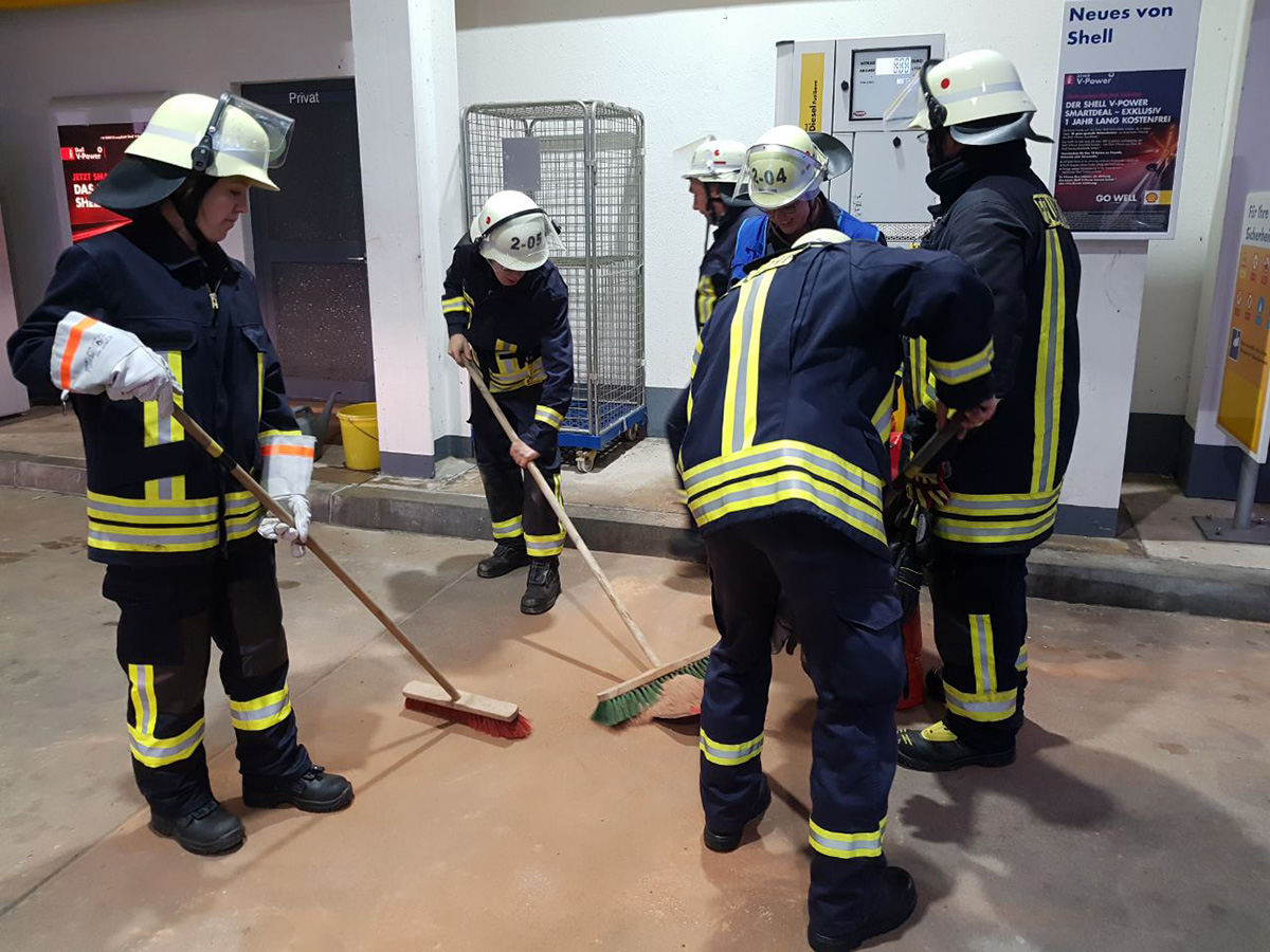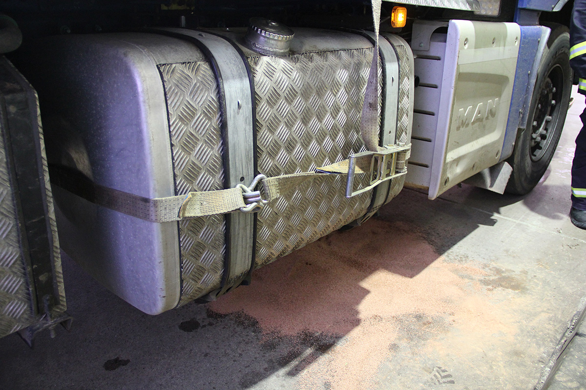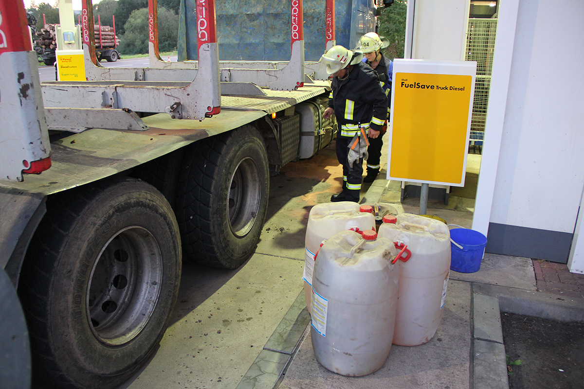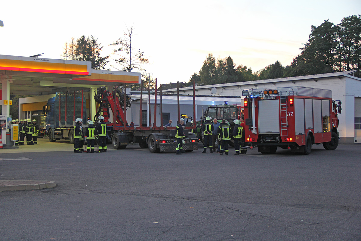 Beim Betanken seines Holztransporters bemerkte der Fahrer am Abend des 20. September 2017 an einer Tankstelle in Neububach, dass eine größere Menge Dieselkraftstoff austrat. Er stoppte sofort den Tankvorgang und informierte Feuerwehr und Tankstellenpersonal. Noch vor dem Eintreffen der Einsatzkräfte aus dem Löschbezirk Bubach-Calmesweiler hatte der Fahrer mit einem untergestellten Eimer dafür gesorgt, dass der austretende Kraftstoff aufgefangen wird. Mit einem Spanngurt und einem Holzklotz sowie einem Stück Feuerwehrschlauch konnte die kleine Schadstelle notdürftig verschlossen werden. Dann konnte der Kraftstoff in dem Tank mit einer speziellen Dieselpumpe in bereitgestellte Fässer umgepumpt werden. Ein weiteres Austreten von Kraftstoff konnte durch diese Maßnahmen verhindert werden. Die Verkehrsfläche unter dem beschädigten Tank wurde mit Bindemitteln abgestreut. Die ebenfalls alarmierten Einheiten aus den Löschbezirken Eppelborn und Macherbach konnten den Einsatz noch auf der Anfahrt abbrechen. Der Rüstwagen Gefahrgut (RW-G) der Feuerwehr Neunkirchen war ebenfalls vor Ort, wurde jedoch auch nicht eingesetzt. Ursache für den Schaden war vermutlich ein hochgewirbelter oder in die Fahrbahn ragender Gegenstand auf einem Waldweg, wo der Holztransporter noch kurz zuvor im Einsatz war. Die Einsatzstelle konnte an die Polizei übergeben werden.