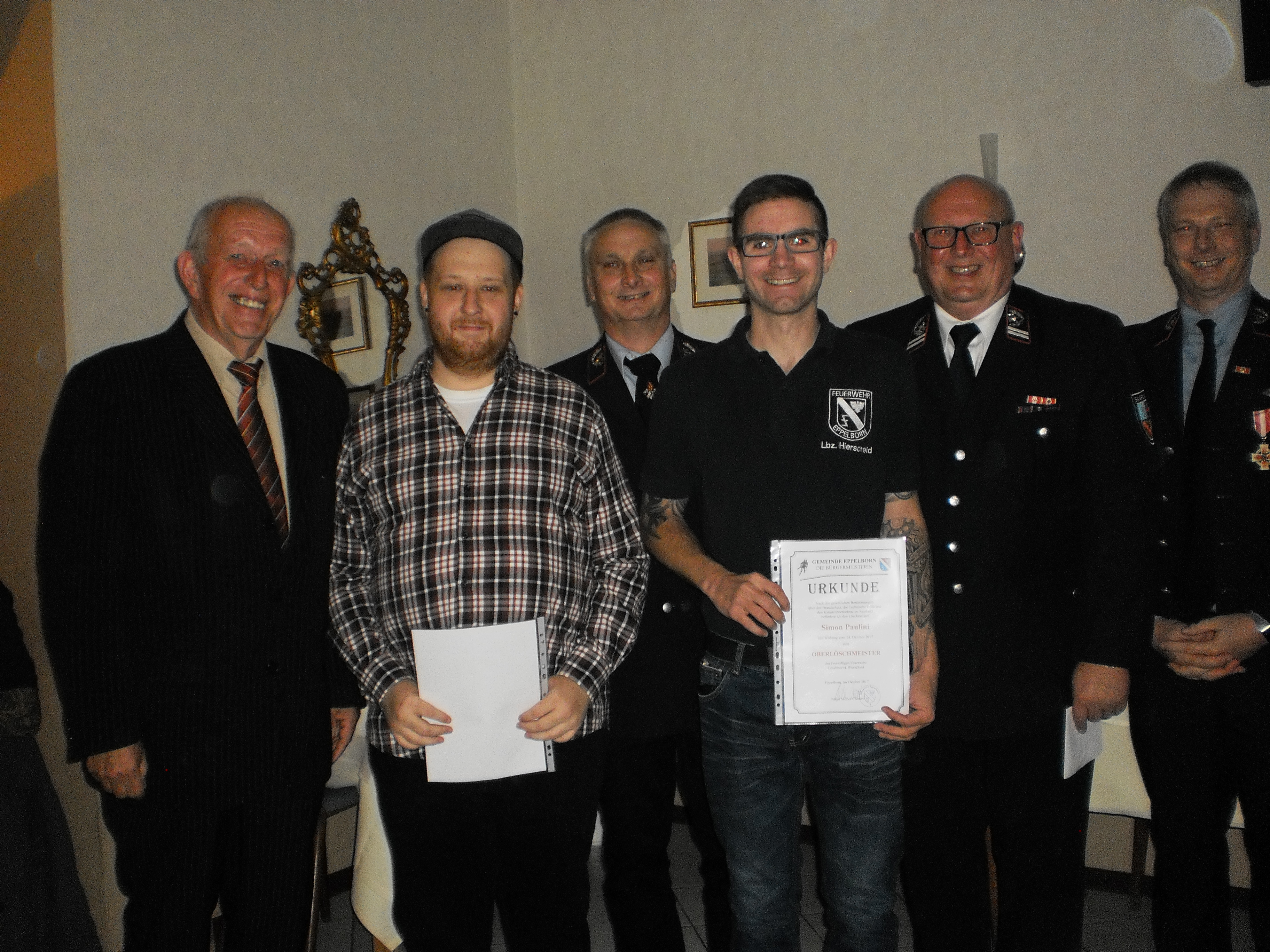 Im Laufe des Abends wurden auch Beförderungen ausgesprochen. Stefan Dörr und Simon Paulini sind zum Oberlöschmeister befördert worden und erhielten ihre Ernennungsurkunden.