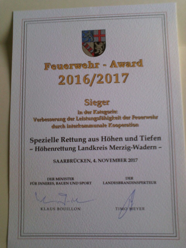 Im Rahmen eines Verbandstages des Feuerwehrverbandes des Saarlandes erhielt die Höhenrettung des Landkreises Merzig – Wadern den Feuerwehr Award 2016/17 des Saarlandes.