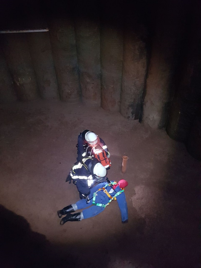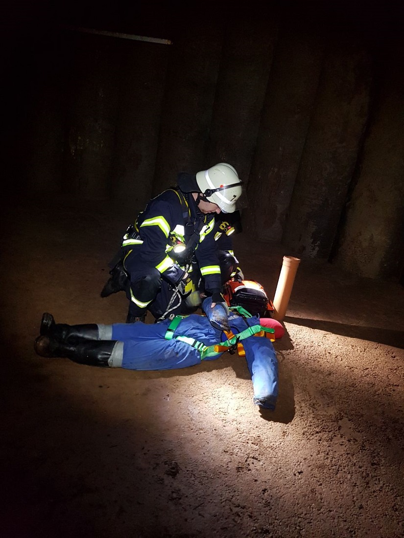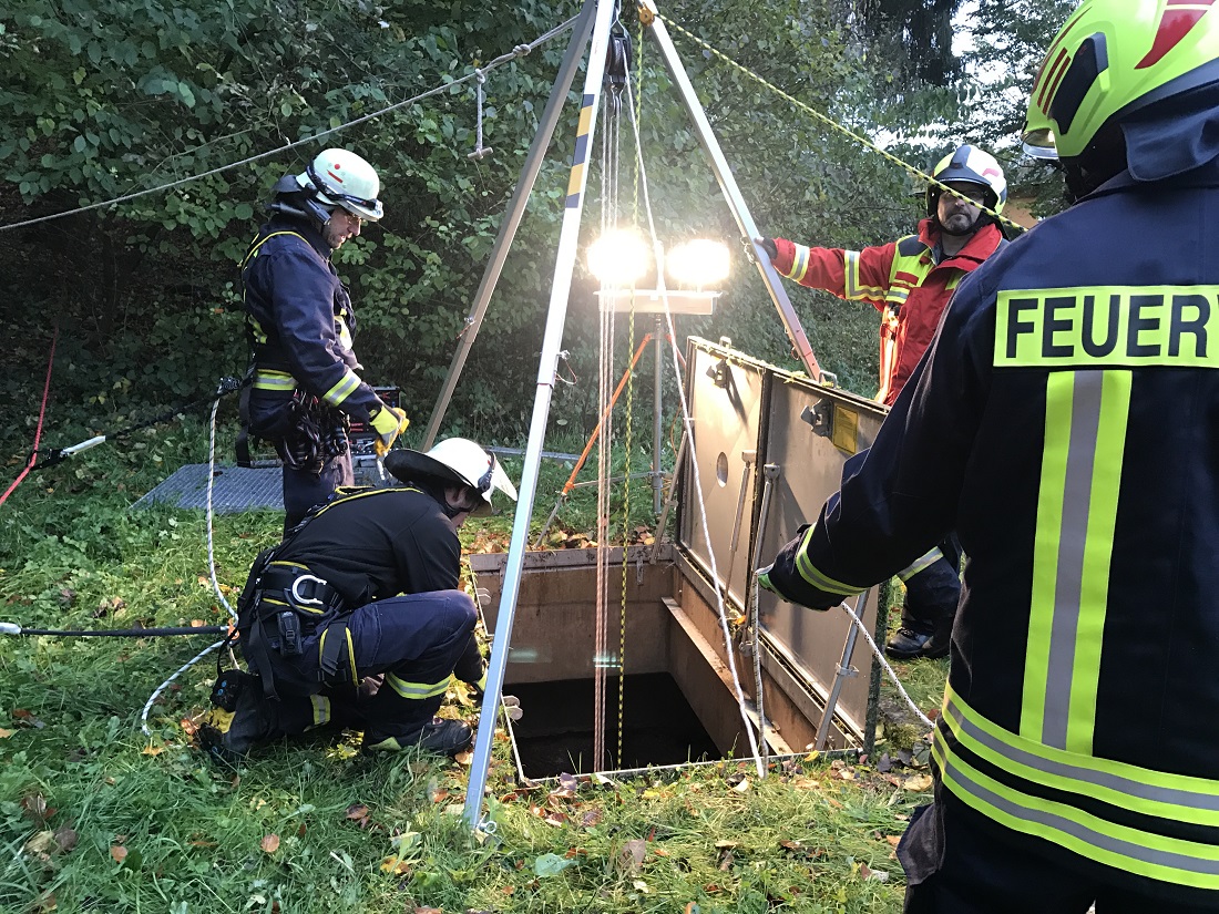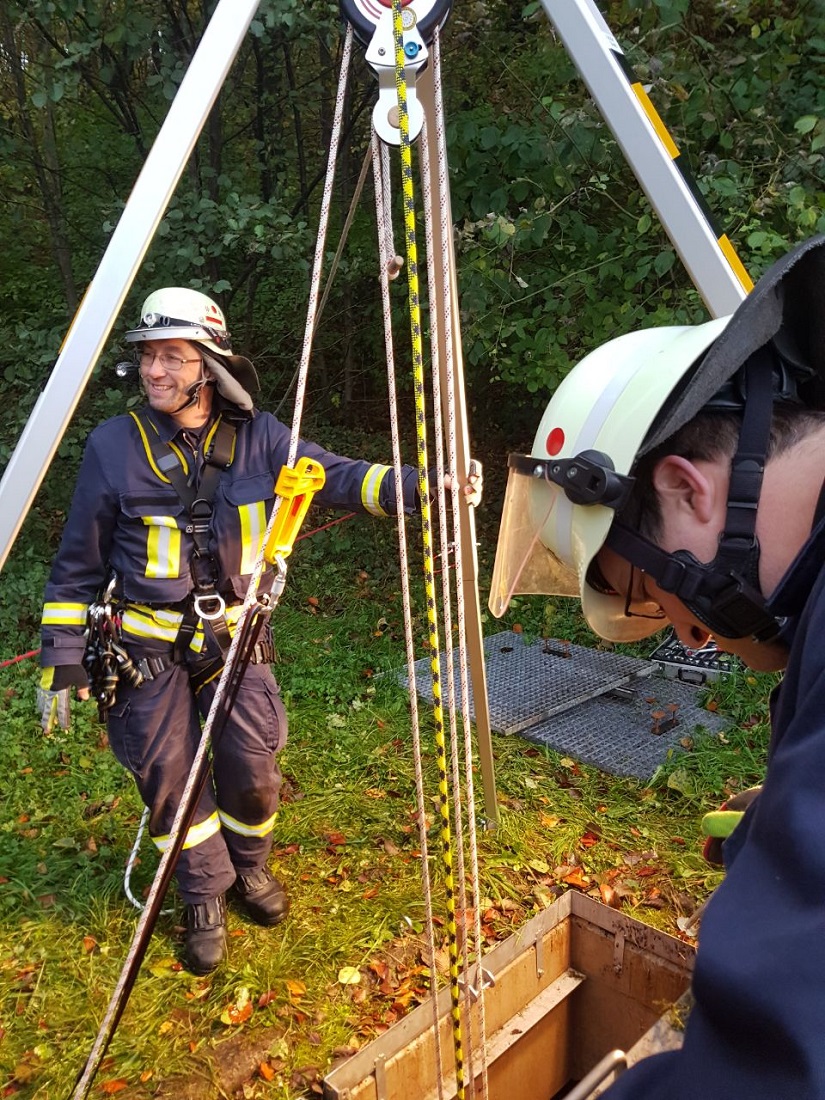 Hier übten die Helfer aus den verschiedenen Feuerwehren die Rettung einer „abgestürzten Person“ in einen Schacht.