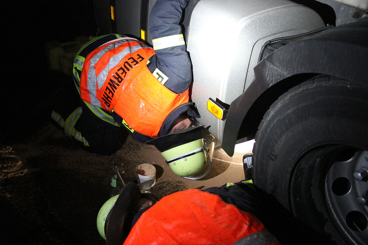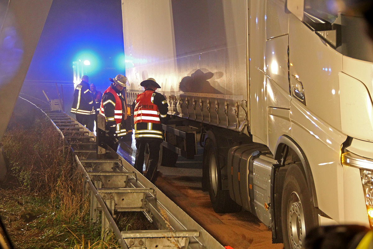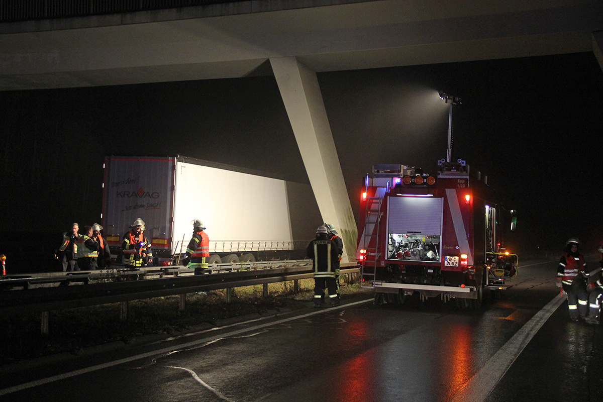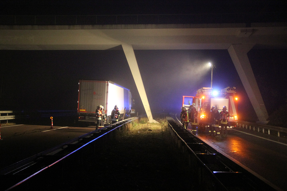 Bei dem Unfall wurden an dem unbeladenen Sattelzug der Kraftstofftank sowie die Ölwanne beschädigt, so dass Betriebsstoffe auf die Fahrbahn liefen. Die Einsatzkräfte der Feuerwehr sicherten zusammen mit der Polizei die Unfallstelle gegen den fließenden Verkehr, leuchteten die Unfallstelle aus und fingen die auslaufenden Stoffe auf. Ausserdem mussten Trümmerteile von der Fahrbahn entfernt werden.