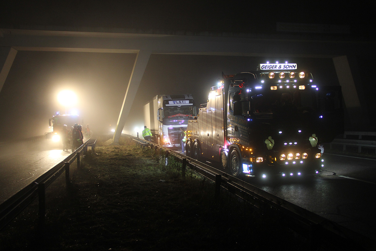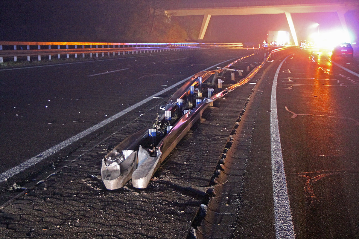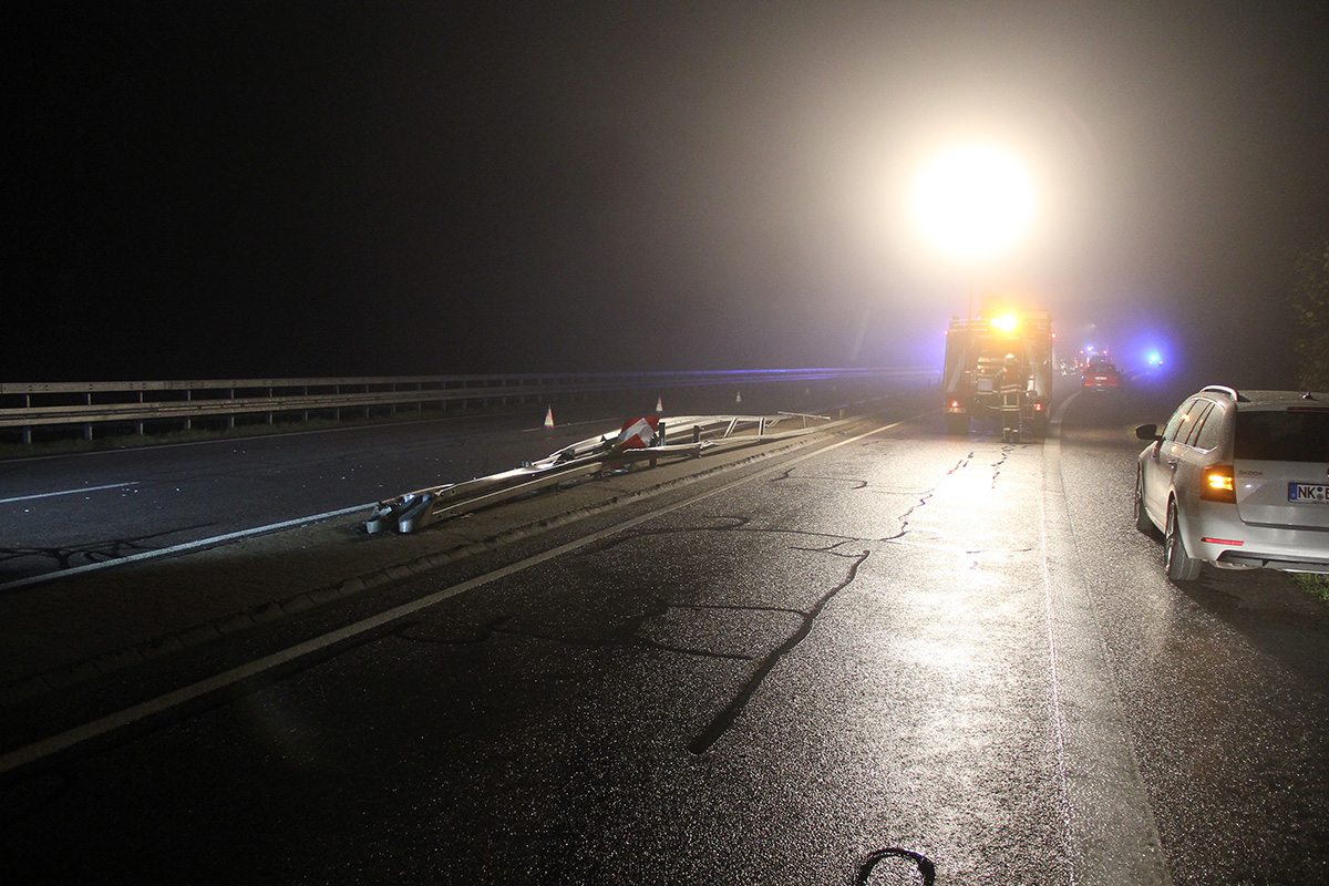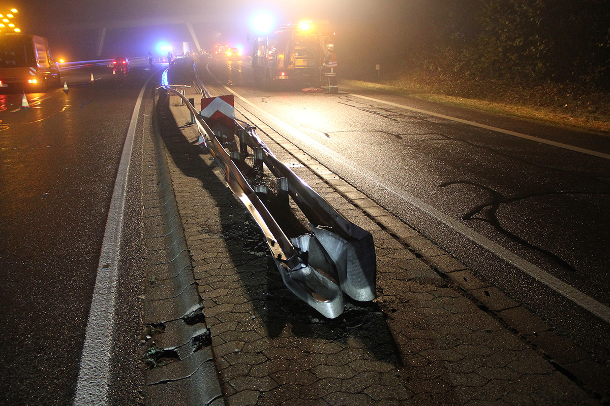 Der Fahrer blieb bei dem Unfall glücklicherweise unverletzt, an den Leitplanken entstand erheblicher Sachschaden. Die weitere Absicherung übernahmen Mitarbeiter des Landesbetriebs für Straßenbau. Der Verkehr musste während der Bergungsarbeiten einspurig an der Unfallstelle vorbeigeführt werden. Aufgrund der frühen Morgenstunden kam es dabei aber zu keinen nennenswerten Verkehrsbehinderungen. Die Unfallursache ist ungeklärt.