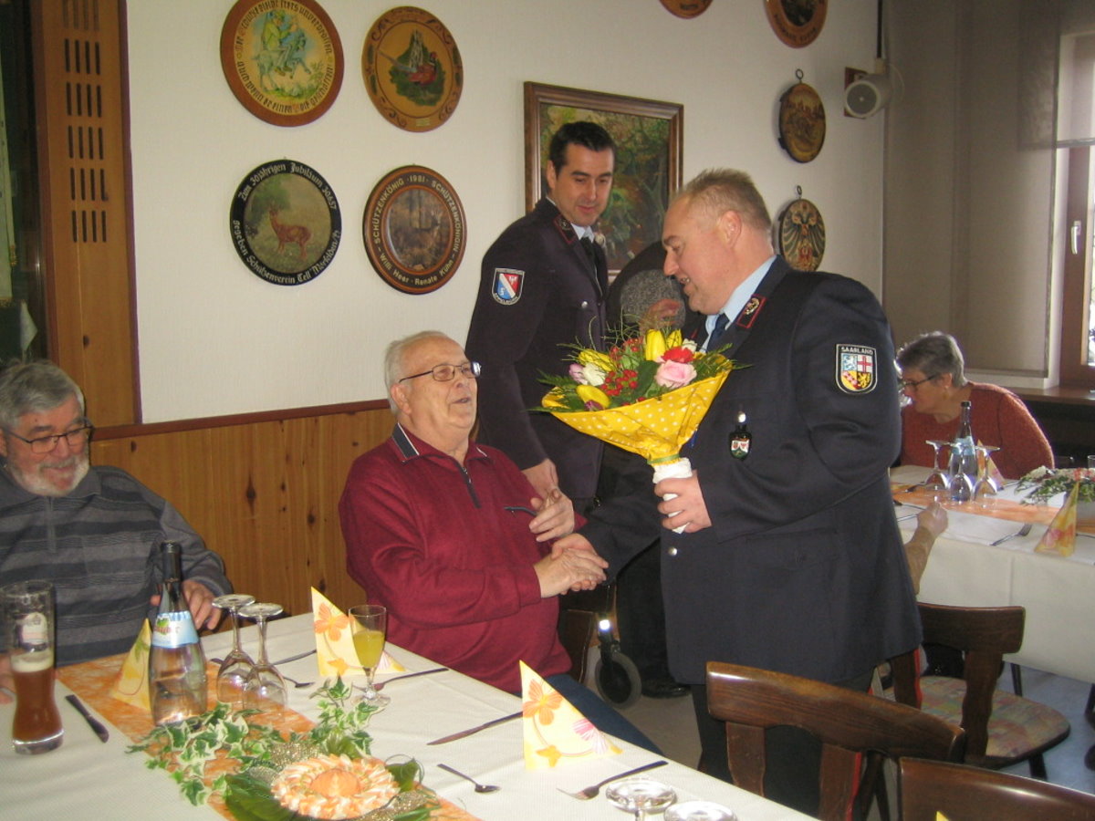 Nun lud Günter Braun seine Kameraden der Alterswehr und eine Abordnung der Aktivwehr am 26.02.2018 nach Eppelborn in’s Schützenhaus ein, um gemeinsam seinen 80. Geburtstag zu feiern. Gerne kamen die Kameraden und überbrachten auch Geschenke im Namen der Feuerwehr. Seine Frau Lore erhielt ebenfalls einen schönen Blumenstrauß, als Dankeschön für Ihre langjährige Unterstützung des Löschbezirk Dirmingen.