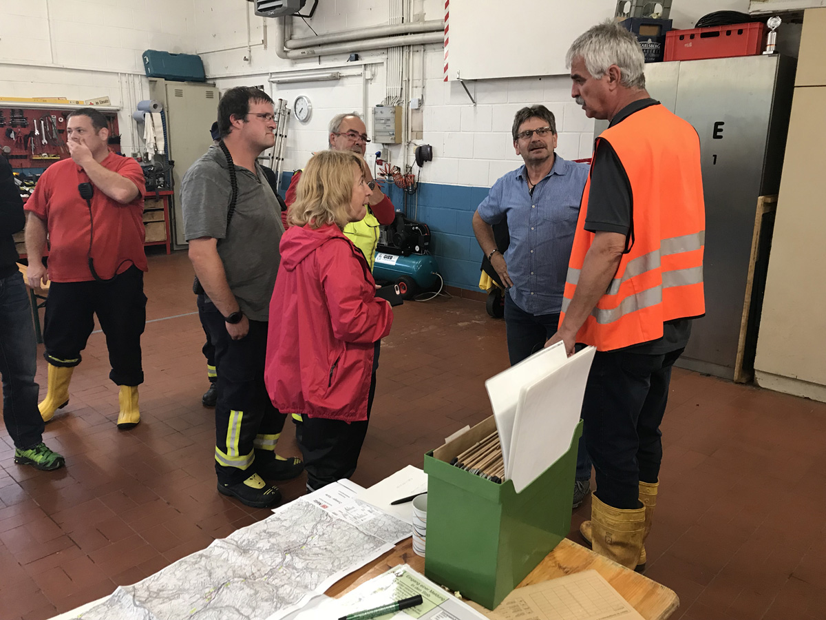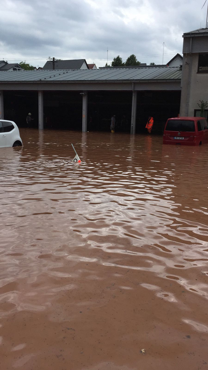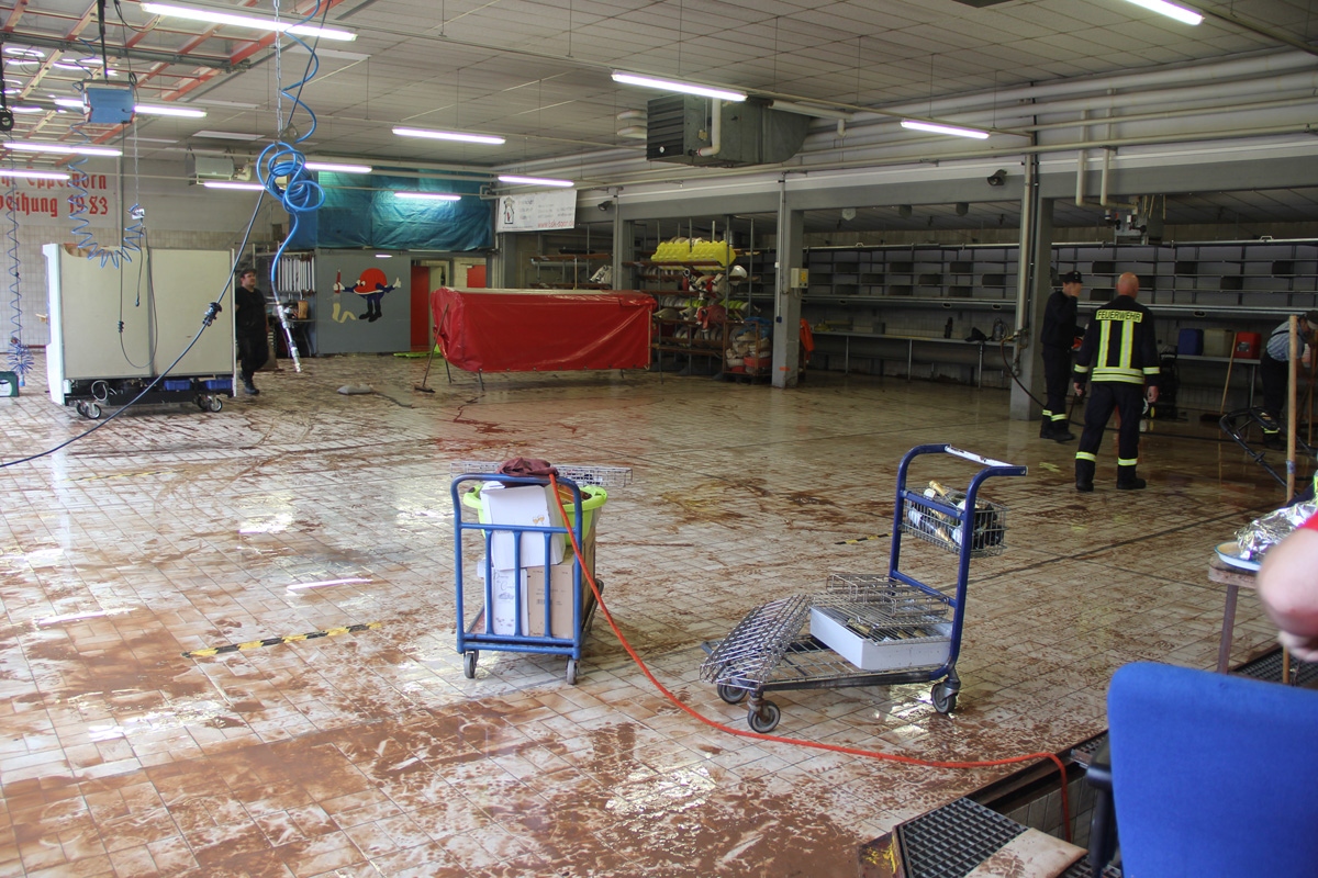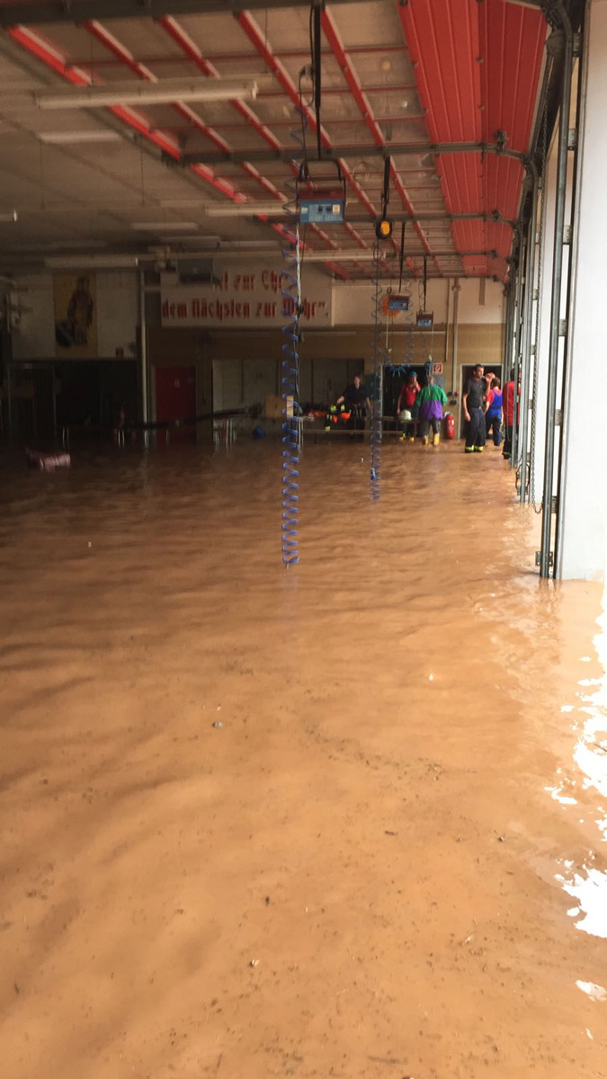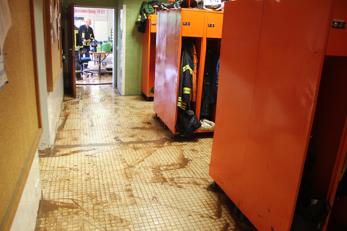 Ein heftiges Unwetter mit sintflutartigen Regenfällen zog am Nachmittag des 11. Juni 2018 über die Gemeinde Eppelborn hinweg. Innerhalb weniger Minuten liefen Keller voll, ganze Straßenzüge verwandelten sich in reißende Bäche. Im Sekundentakt liefen über den Notruf 112 die Meldungen über Schäden und Hilfegesuche auf der Leitstelle ein. Schnell wurde das ganze Ausmaß klar und Vollalarm für alle Löschbezirke der Gemeinde Eppelborn ausgelöst. In allen Ortsteilen bot sich das gleiche Bild: Straßen waren durch Geröll und Wasser nicht mehr passierbar, Gärten und Wiesen hatten sich in Seen verwandelt und ein Keller nach dem anderen lief voll. Wie schnell sich das Wasser seinen Weg suchte, mussten die Feuerwehrleute im Gerätehaus in Eppelborn am eigenen Leib erleben: Noch während die Einsatzkräfte zu den ersten Einsätzen ausrückten, schossen die braunen Fluten auch ins Feuerwehrgerätehaus in der Schleidstraße. Kniehoch stand das Wasser in der Fahrzeughalle, in den Umkleiden, den Sanitär- und Lagerräumen und dem Jugendfeuerwehrraum. Die Funkzentrale, von der aus die ganzen Einsätze koordiniert wurden, musste aufgegeben und die Einsatzleitung nach Bubach-Calmesweiler verlegt werden. [left][cmsimg]9123[/cmsimg][/left] Parallel zu den Arbeiten "vor Ort" musste nun auch das eigene Equipment gerettet werden. Dabei erlebten die Feuerwehrleute eine unglaubliche Solidarität und Hilfsbereitschaft. Zahlreiche Frauen und Freundinnen aktiver Kameraden und Helfer aus der Nachbarschaft kamen spontan zum Gerätehaus, um Schmutz und Wasser zu beseitigen. Auch aus den anderen Löschbezirken und ganz besonders aus dem Löschbezirk Macherbach kamen Angehörige von Feuerwehrkameraden zur Hilfe. Nachbarn der Feuerwehr stellten spontan Pavillions und Schirme bereit und packten tatkräftig beim Füllen von Sandsäcken mit an. Und diese Hilfsbereitschaft und Solidarität zeigte sich überall im Gemeindegebiet. Die Kameraden wurden mit Getränken und Essen versorgt, und überall halfen Mitbürgerinnen und Mitbürger, die vom Wasser verschont geblieben waren, mit Schaufeln und Besen ihren Nachbarn, die weniger Glück hatten. [right][cmsimg]9153[/cmsimg][/right] Mit Sandsäcken versuchten die Ladenbesitzer im Ortskern von Eppelborn, noch größeren Schaden zu verhindern. Doch nicht überall gelang dies: Der gerade erst umgebaute und renovierte Wasgau-Markt wurde komplett überflutet. Auch hier kam das Wasser so schnell, dass sich die Mitarbeiter nicht mehr in Sicherheit bringen konnten. Mit watfähigen Fahrzeugen mussten sie von der Feuerwehr gerettet und in Sicherheit gebracht werden. Weit mehr als 100 Einsatzstellen mussten durch die Kameraden abgearbeitet werden. Besonders betroffen waren dabei die Ortsteile Eppelborn, Wiesbach und Habach. Aus den umliegenden Kommunen Illingen, Lebach, Merchweiler, Ottweiler, Schiffweiler und sogar aus Püttlingen kamen Einsatzkräfte von Feuerwehr, DLRG, DRK und THW zu Hilfe. Zu Spitzenzeiten waren rund 250 Kräfte gleichzeitig im Einsatz. Bürgermeisterin Birgit Müller-Closset und Landrat Sören Meng verschafften sich persönlich ein Bild der Lage. Landtagsmitglied Alwin Theobald war bis spät in die Nacht im Gerätehaus in Eppelborn und hatte ein offenes Ohr für die Sorgen der Einsatzkräfte, die nach stundenlangem Einsatz am Ende ihrer Kräfte waren. [left][cmsimg]9163[/cmsimg][/left] Aufgerissene Straßen, mitgerissene Wege, verwüstete Grundstücke, Gärten und in Mitleidenschaft genommene Häuser machten einen Tag nach der Katastrophe noch immer das Ortsbild von Eppelborn aus. Ernsthaft verletzt wurde zum Glück niemand. Erst nach Abschluss der Aufräumarbeiten kann der genaue Umfang der Schäden durch das Starkregenereignis beurteilt werden. Nach einer ersten Einschätzung der Verwaltung werden die Schäden die Millionengrenze überschreiten. Die Schadensbeseitigung wird wohl einige Zeit dauern. Viele Menschen haben durch die Ereignisse Hab und Gut und teilweise auch ihre Existenz, Mut und Lebensinhalt verloren. Getränkehandel, Metzgereien, Baufirmen – von allen Seiten wurde die Feuerwehr unterstützt. Auch wenn man immer wieder von der zunehmenden sozialen Kälte spricht: Die Eppelborner haben bei dieser Katastrophe gezeigt, dass die Einwohner zusammenhalten. Ohne diese Hilfe wäre es der Feuerwehr alleine nicht möglich gewesen, die Situation so schnell wieder unter Kontrolle zu bekommen. [right][cmsimg]9130[/cmsimg][/right] Der Einsatz hat die Notwendigkeit eines Einsatzleitwagens wieder einmal gezeigt. Zum Glück konnte wieder einmal auf ein Fahrzeug aus einer Nachbarkommune zurückgegriffen werden. Doch gerade bei solchen Flächenlagen werden diese in der Regel in ihrem Heimatstandort selbst gebraucht. [b]Die Feuerwehr Eppelborn bedankt sich bei all den unermüdlichen Helfern, die am vergangenen Montag Hilfe angeboten und tatkräftig unterstützt haben![/b] [Infobox title="Hilfe für Betroffene"] Im Rathaus wurde ein Sorgentelefon für Geschädigte eingerichtet, das unter der Telefon-Nummer [b]06881/969-123[/b] oder [b]06881-969-119[/b] erreichbar ist. Auf der Internetseite [URL="http://www.eppelborn.de"]www.eppelborn.de[/url] finden Sie ein Formular zur Schadensmeldung aufgrund der Unwetterereignisse, das bei der Gemeindeverwaltung eingereicht werden kann. [/Infobox]