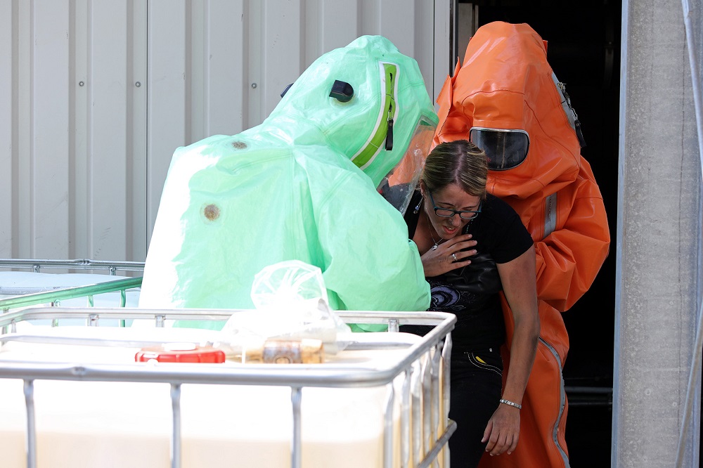 Des Weiteren werden Lagerbehälter mit Industriereinigungsmitteln (Salpetersäure und Natronlauge) beschädigt, und die Flüssigkeiten traten aus. Daher war auch der Gefahrstoffzug des Landkreises Neunkirchen, unter der Führung des stellvertretenden Einheitenführers des „ABC – Zuges“ und Löschbezirksführer des LBZ Bubach – Calmesweiler, Andreas Groß, gefordert.