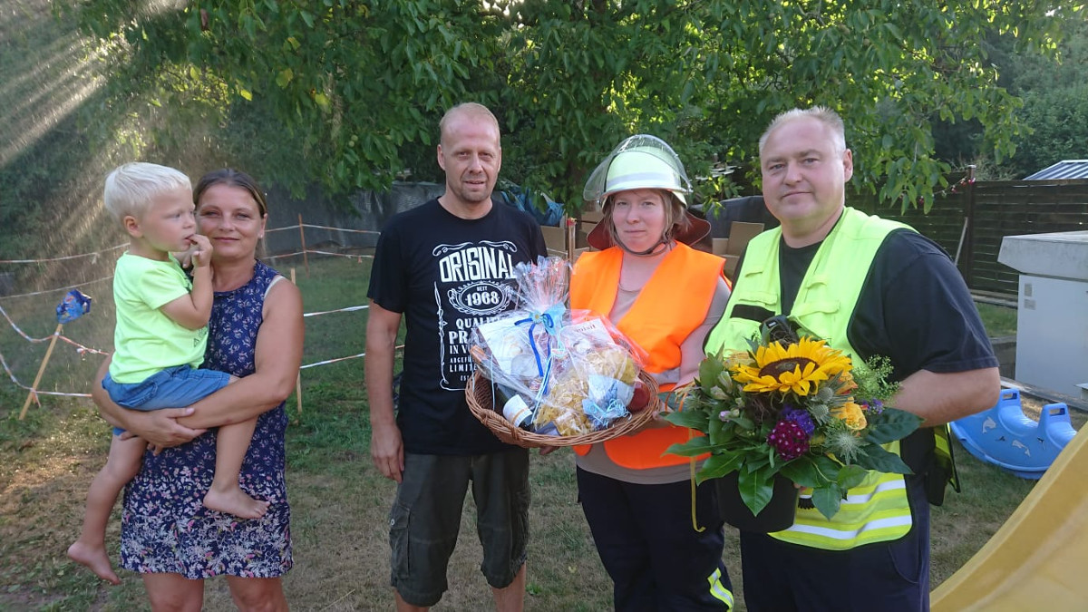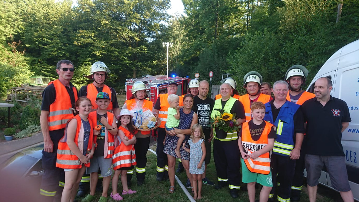Im Anschluss an die Übung überreichte der stellv. Löschbezirksführer Heino Molter und Feuerwehrfrau Marina Haupenthal ein Geburtstagsgeschenk an Kamerad Andreas. Seine Frau Esther erhielt einen Blumenstrauß. Hauptfeuerwehrmann Andreas Bodo freute sich sehr und es gab auch sogleich zahlreiche Leckereien für Gaumen und Magen. Bei herrlichem, abendlichen Wetter wurde noch zwei bis drei Stunden gemütlich zusammen gesessen, bevor sich die Mannschaft wieder in Richtung Gerätehaus zurück bewegte.
