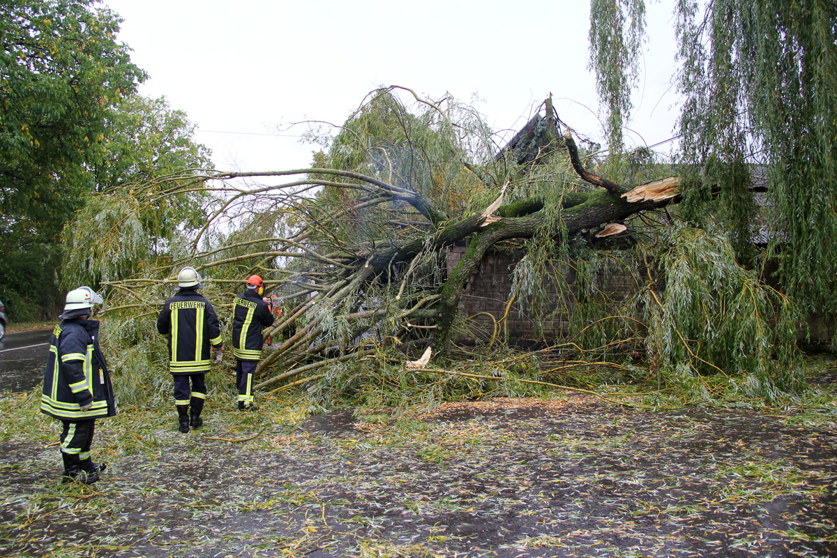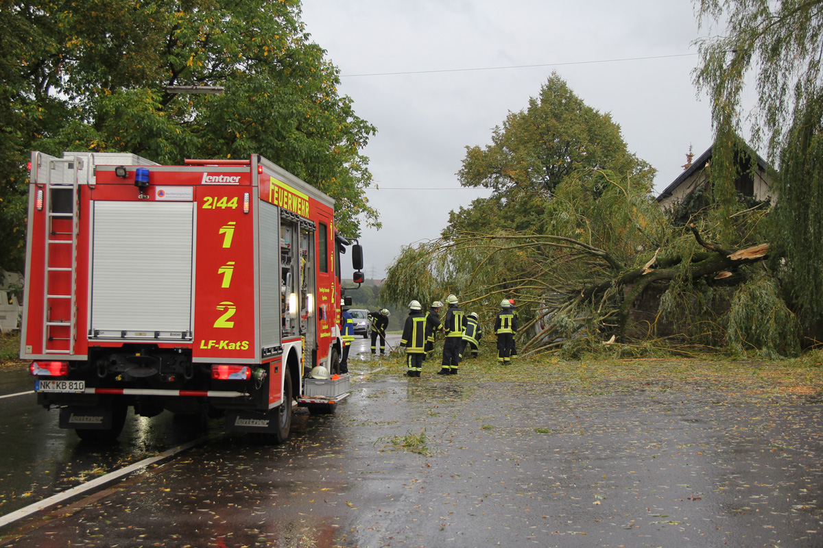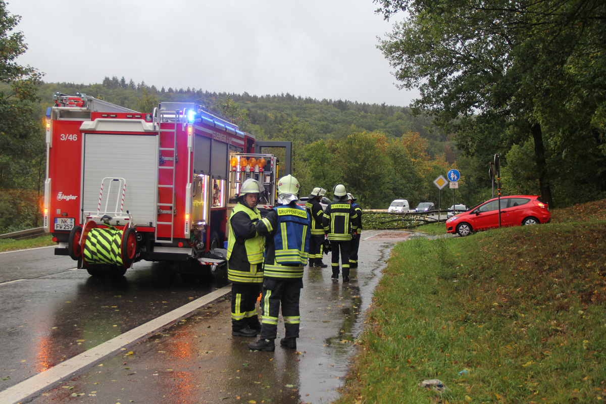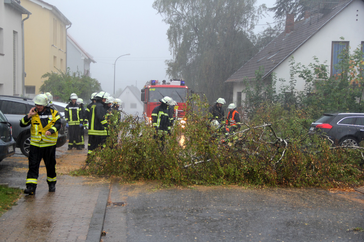 Mehr als 10 Einsätze mussten die Einsatzkräfte aus fast allen Löschbezirken der Gemeinde am vergangenen Sonntag abarbeiten, als das Sturmtief "Fabienne" über das Gemeindegebiet zog. Starkregen und starke Orkanböen ließen Bäume umstürzen und überfluteten Straßen. Umgestürzte Bäume, die die Fahrbahn versperrten, wurden mit Motorsägen zerkleinert und die Fahrbahn wieder freigeräumt. Zu Schäden an Gebäuden kam es hierbei nicht, Sachschäden entstanden außer an den umgestürzten Bäumen keine. Am Bolzenberg stürzte die Krone eine großen Baumes auf zwei geparkte Fahrzeuge und verursachte Sachschäden. Personen waren hier zum Glück aber nicht betroffen. Auch hier wurden Äste zersägt und die Einsatzstelle freigeräumt. An den überfluteten Stellen mussten die Kanaleinlaufschächte geöffnet und gereinigt werden. Große Mengen mitgerissenes Laub hatten diese verstopft und das Wasser angestaut. So konnte schnell auf eine Entspannung der Lage gesorgt werden. Zu Wassereinbrüchen in Gebäuden kam es zum Glück dieses Mal fast gar nicht. An den wenigen Einsatzstellen, zu denen die Feuerwehr gerufen wurde, waren die Wassermengen so gering, dass ein Eingreifen der Feuerwehr weder notwendig noch möglich war. Bis zum Abklingen des Unwetters blieben die Einsatzkräfte noch in den Gerätehäusern in Bereitschaft, zu weiteren Einsätzen kam es aber nicht mehr.