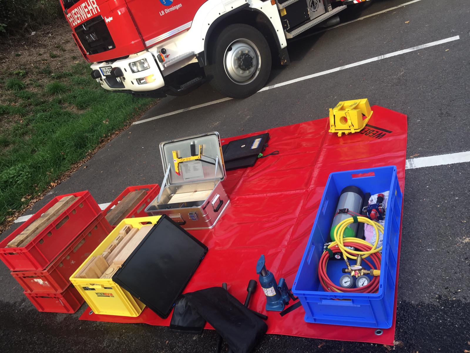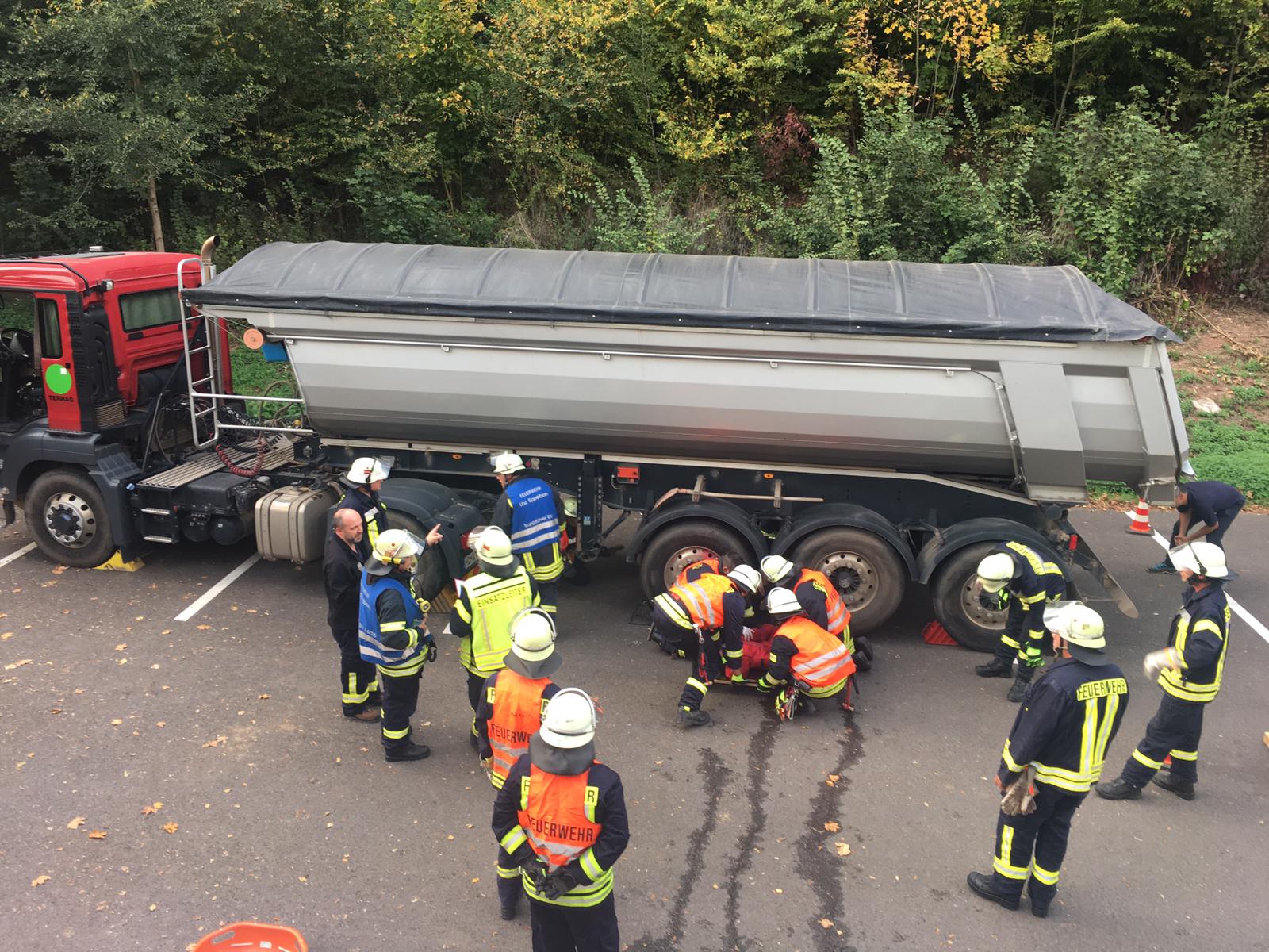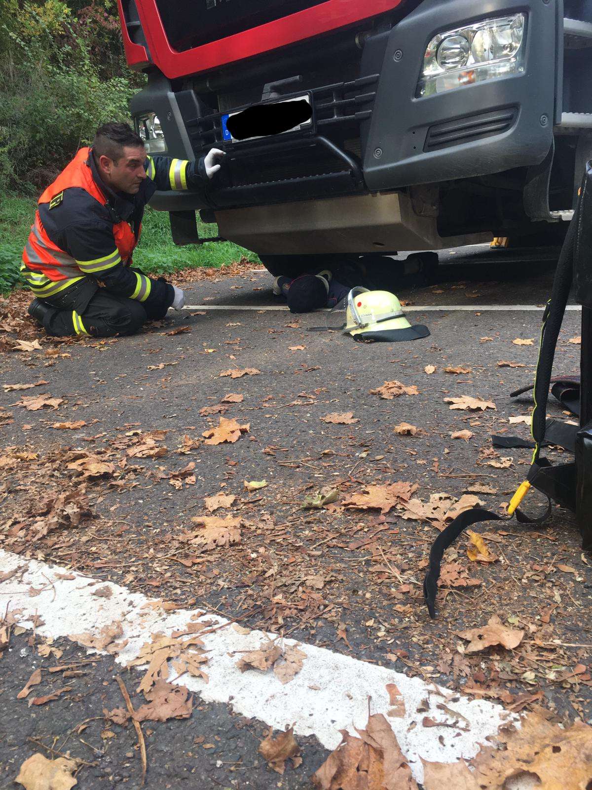 Bei dieser Schadenslage, die viele Kräfte bindet, war der Einsatzleiter froh, als die Kameraden aus Eppelborn in kürzester Zeit an der Unfallstelle ankamen. Die Gruppenführer des TLF, Christian Holz und des RW, Werner Ruschel, meldeten sich umgehend bei der Einsatzleitung. Sie wurden in die kritische Lage eingewiesen und bekamen die Aufgabe, zusammen mit den Kräften aus Dirmingen, die Technische Rettung durchzuführen. In Zusammenarbeit mit Notarzt und Rettungssanitätern wurden die eingeklemmten Wanderer von der Last des Muldenkippers in einem Zeitrahmen von etwa 35 Minuten befreit.