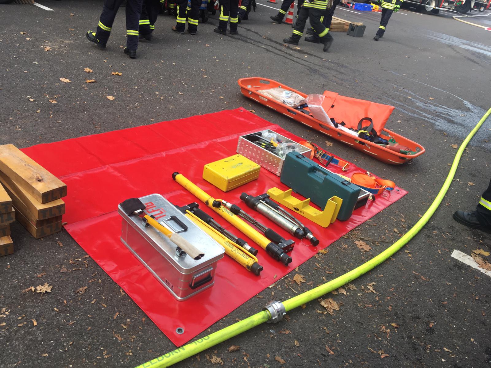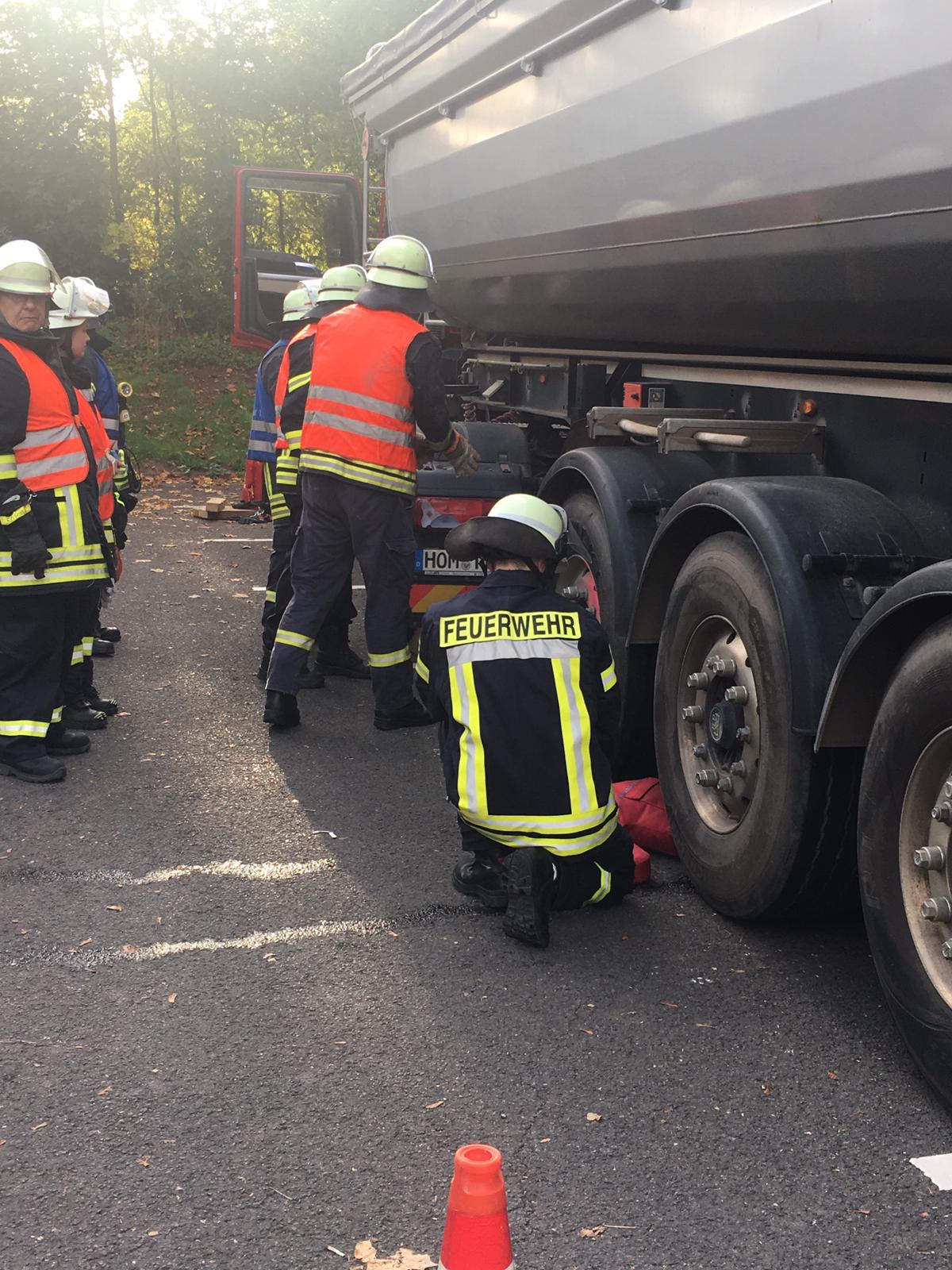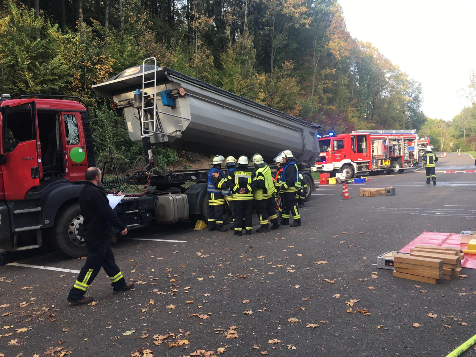 Bei dieser Schadenslage, die viele Kräfte bindet, war der Einsatzleiter froh, als die Kameraden aus Eppelborn in kürzester Zeit an der Unfallstelle ankamen. Die Gruppenführer des TLF, Christian Holz und des RW, Werner Ruschel, meldeten sich umgehend bei der Einsatzleitung. Sie wurden in die kritische Lage eingewiesen und bekamen die Aufgabe, zusammen mit den Kräften aus Dirmingen, die Technische Rettung durchzuführen. In Zusammenarbeit mit Notarzt und Rettungssanitätern wurden die eingeklemmten Wanderer von der Last des Muldenkippers in einem Zeitrahmen von etwa 35 Minuten befreit.