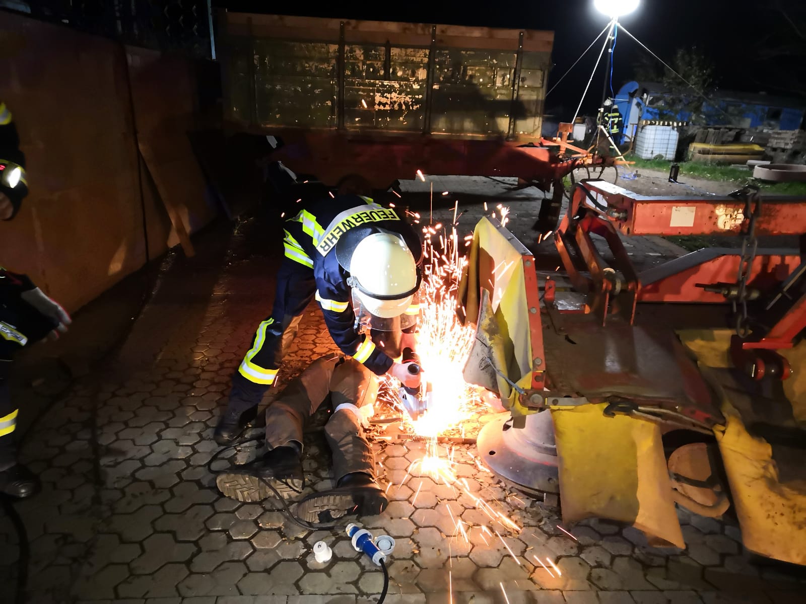 Die Kameraden aus Wiesbach mussten eine Person unter einem Viehhänger mittels Hebekissen befreien.