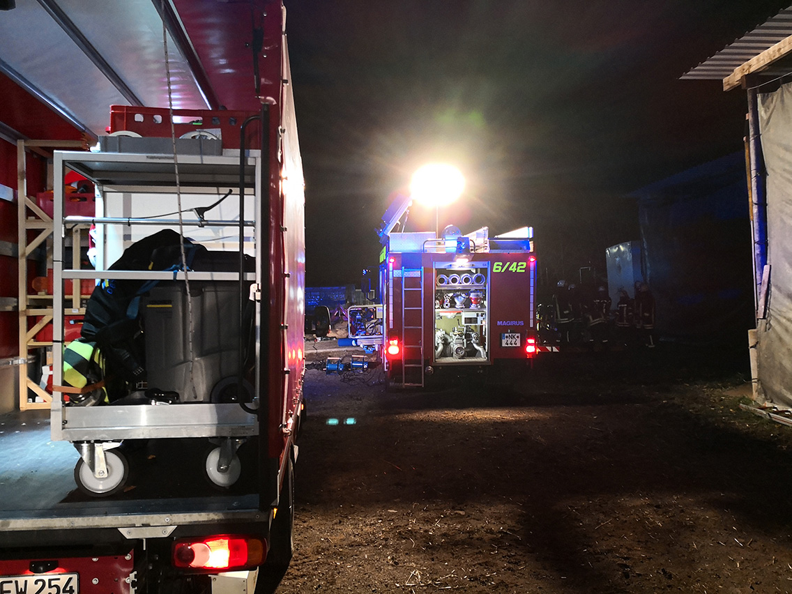 Die Lage war zunächst unklar. Bekannt war nur, dass vier Personen, die zuvor auf dem Hof gearbeitet haben, vermisst sind. Der Löschbezirk Humes war als erster vor Ort und übernahm das Ausleuchten der Einsatzstelle und begann mit der Erkundung, wobei sie von den nachrückenden Kollegen aus Hierscheid unterstützt wurden.