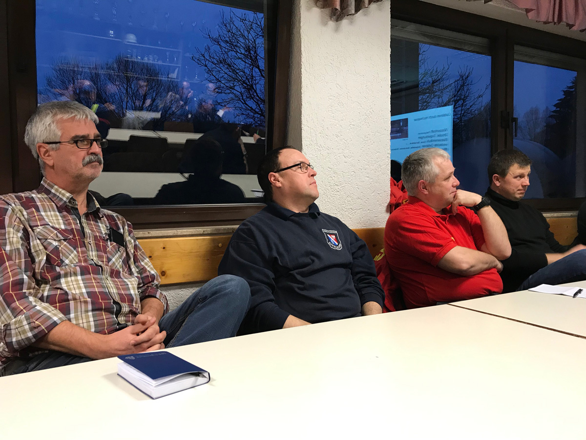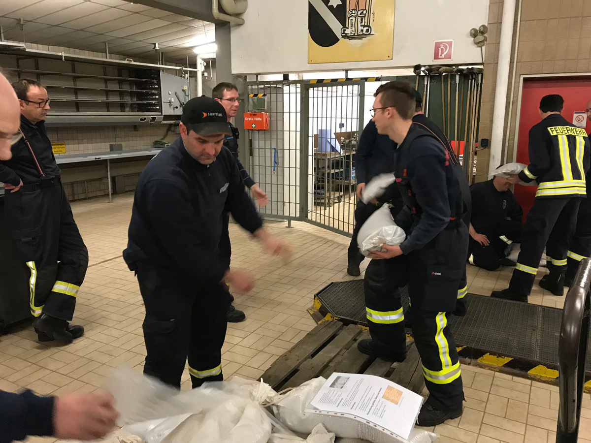 Ausbilder Christian Holz hatte dazu zahlreiche Informationen zusammengetragen. Im theoretischen Teil erklärte er, mit welchen Gefahren bei einem Hochwassereinsatz zu rechnen ist und wie man diesen durch geeignete Maßnahmen begegnen kann. Dabei konnten auch die Gäste Markus Baus von der DLRG, Sascha Pittner vom Gemeindebauhof und Peter Lutz vom Tiefbauamt der Gemeinde Eppelborn wichtige Informationen beisteuern. Die Möglichkeiten eines korrekten Sandsackverbaus wurden ebenso vorgestellt wie die Methode, möglichst viele gefüllte Sandsäcke auf Paletten sicher zu stapeln.