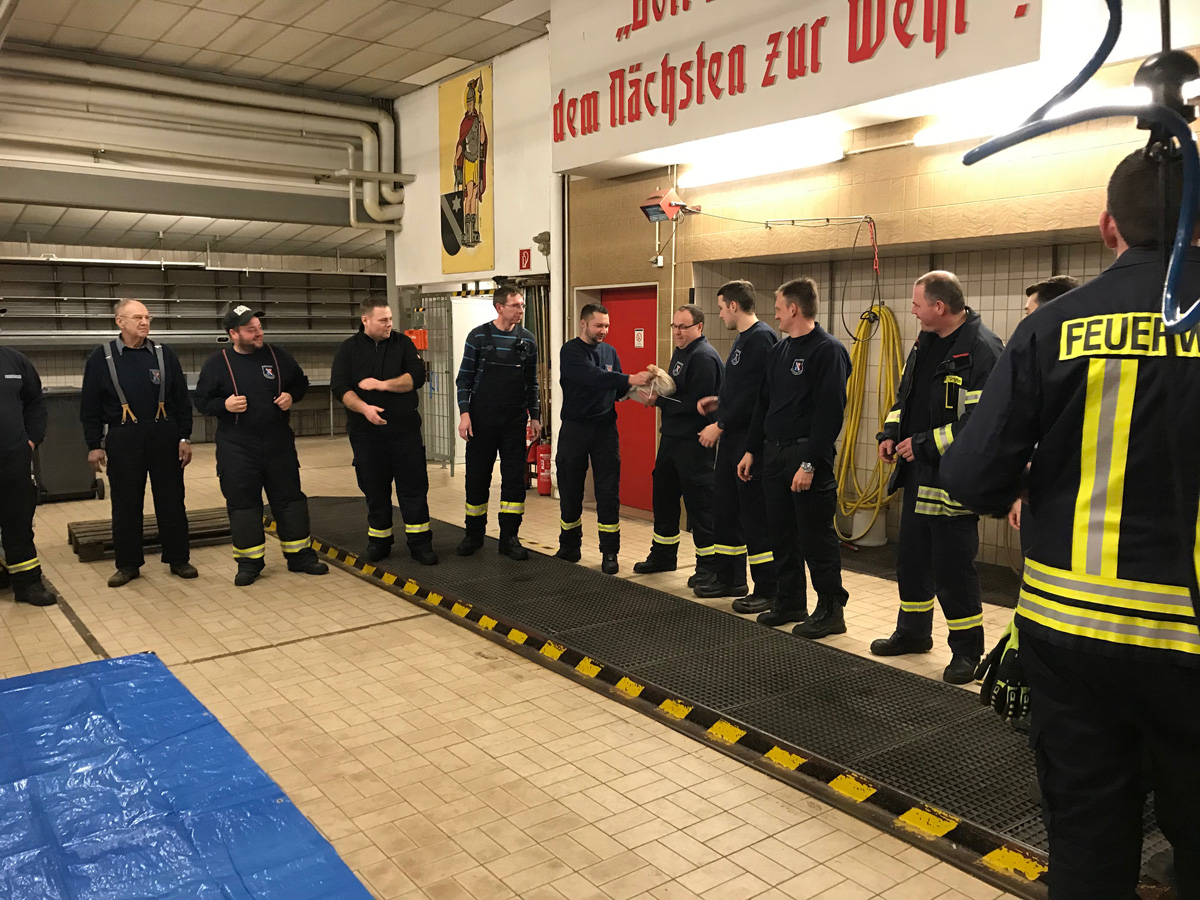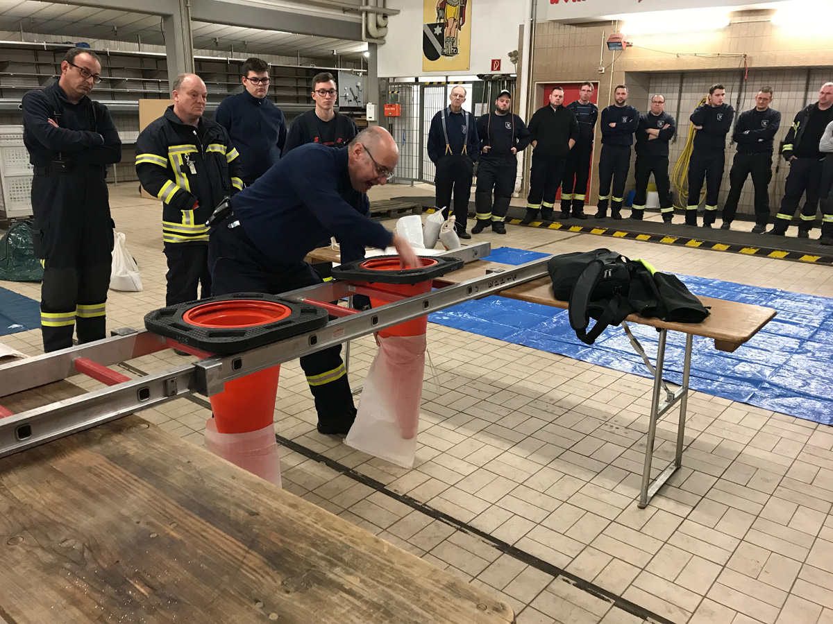 Beim praktischen Teil in der Fahrzeughalle wurde geprobt, wie man Sandsäcke in einer Kette schnell weiterreichen kann. Auch wurden Hilfsmittel vorgestellt, mit denen die Säcke schnell gefüllt werden können.