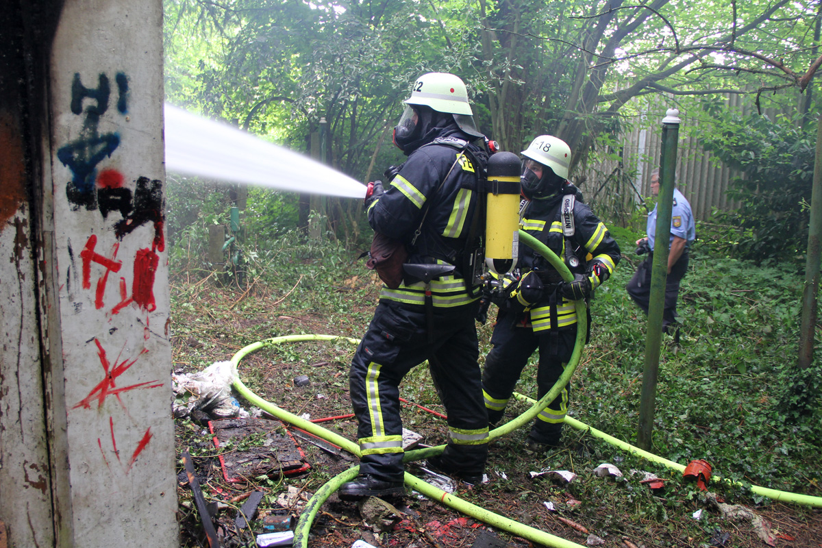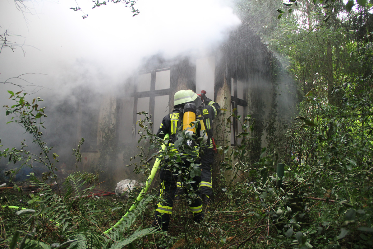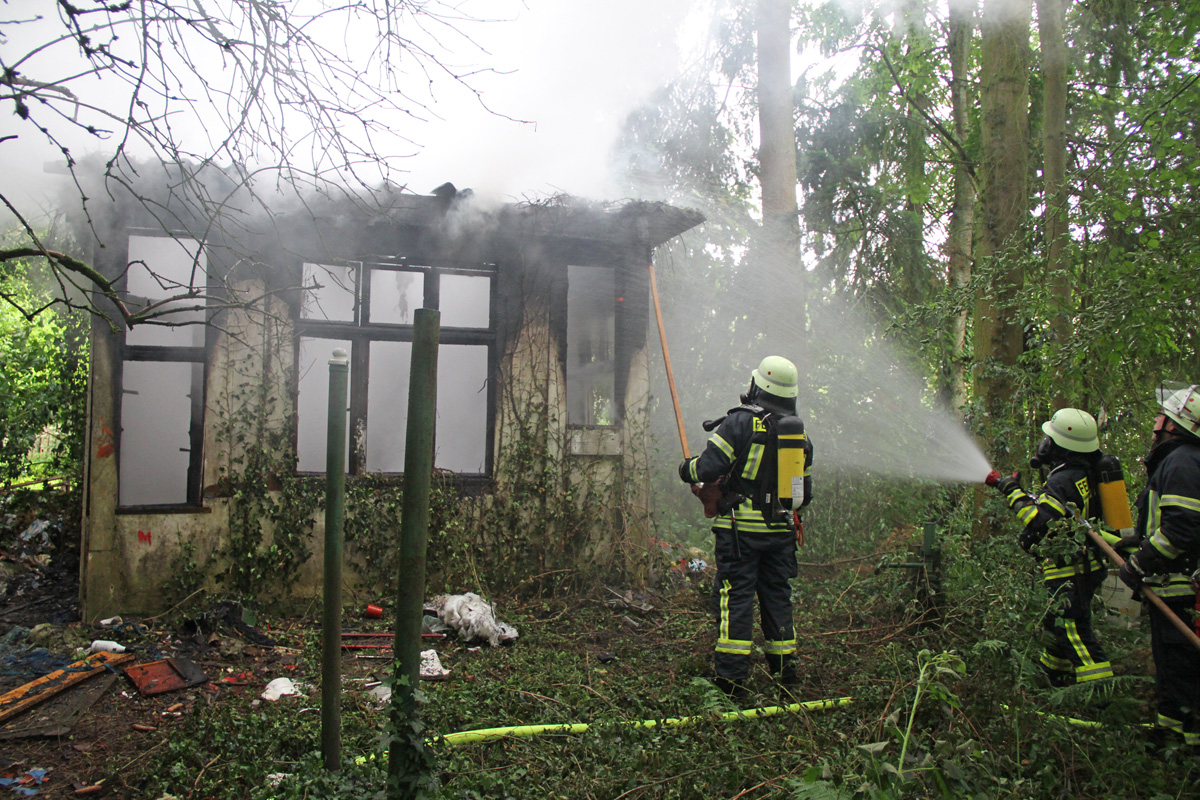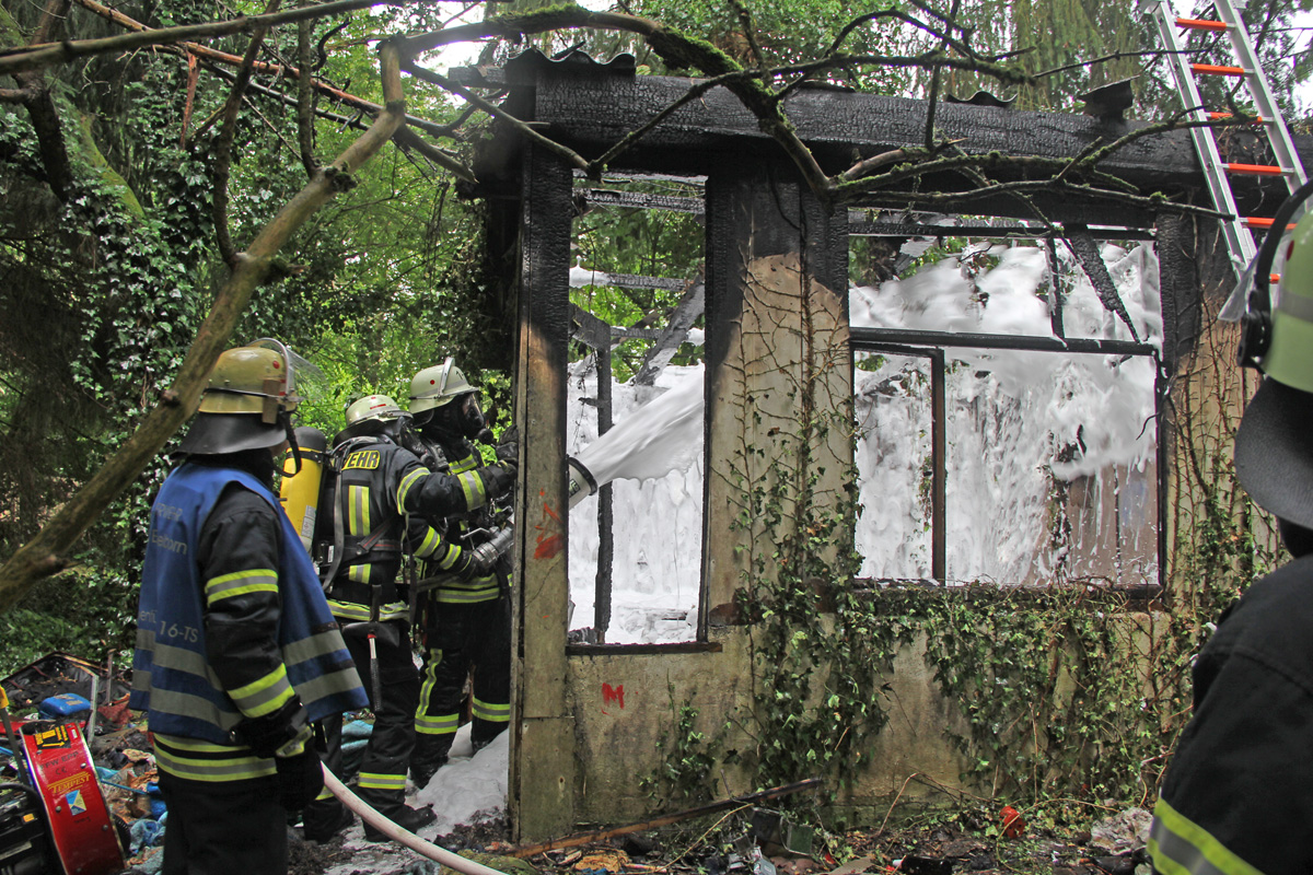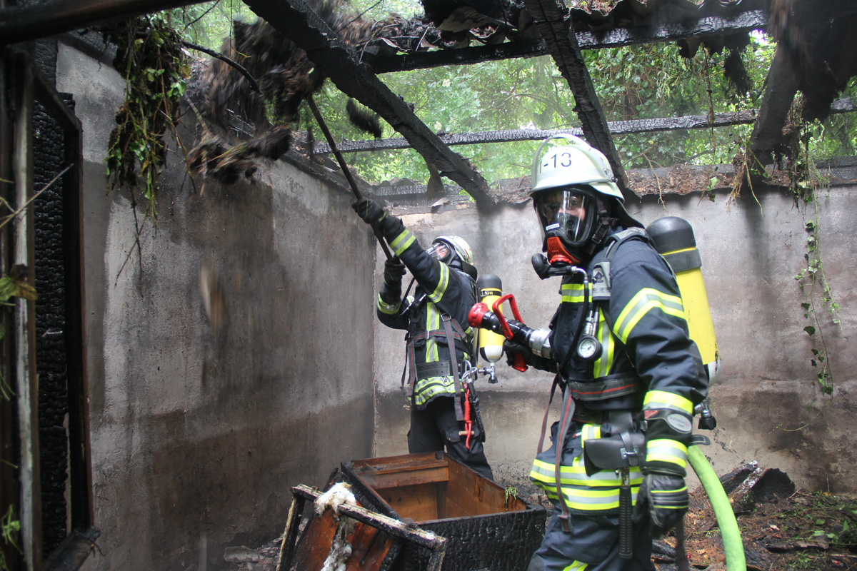 Unter Atemschutz konnte ein Trupp den Brand mit einem C-Rohr schnell löschen. Teile der Konstruktion mussten mit Einreißhaken niedergerissen werden, da immer wieder Flammen aus der Dachkonstruktion aufloderten. Um sicherzugehen, dass sich zum Brandzeitpunkt keine Personen in dem Gebäude aufgehalten hatten, wurde der dichte Brandrauch mit einem Drucklüfter weggeblasen.