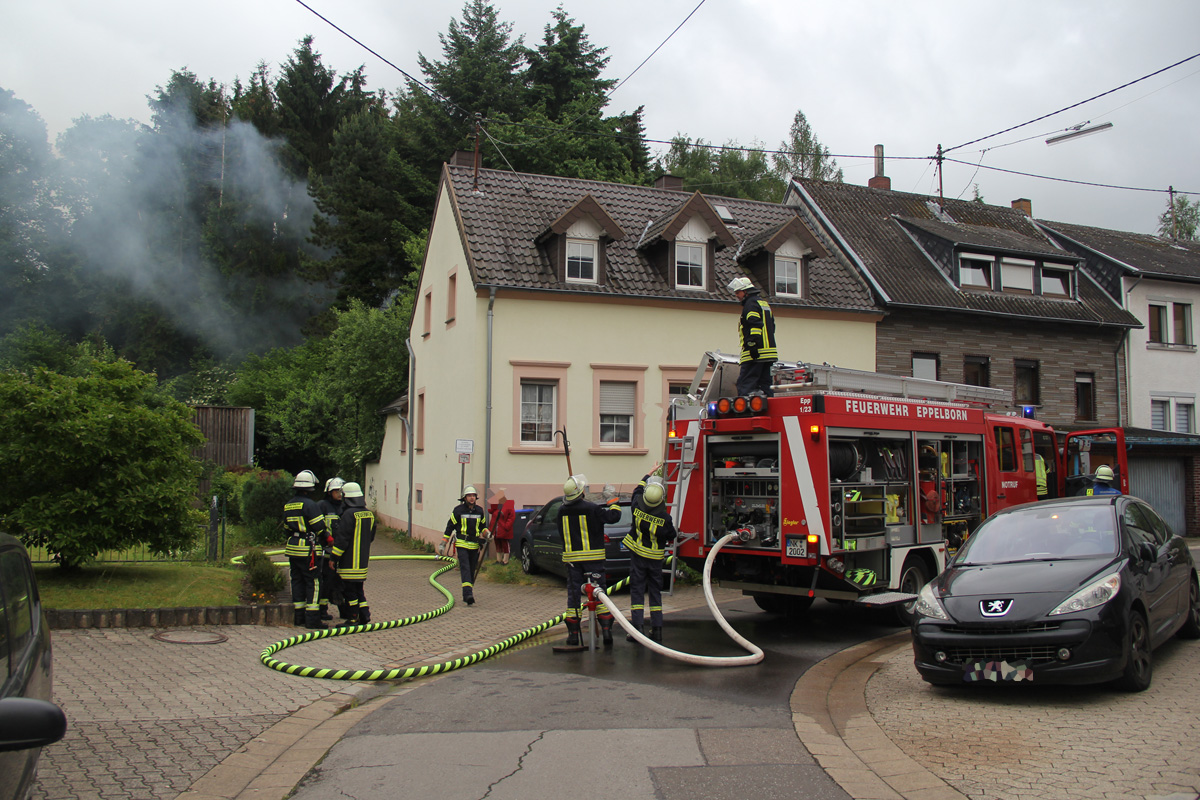 In der Schloßstraße in Eppelborn ist am Morgen des 15. Juni 2019 ein Gartenhaus hinter einem Anwesen komplett niedergebrannt. Das aus Holz errichtete und seit längerem schon nicht mehr genutzte Haus stand beim Eintreffen der Feuerwehr bereits im Vollbrand, eine dichte Rauchwolke stand schon von Weitem erkennbar über der Einsatzstelle.