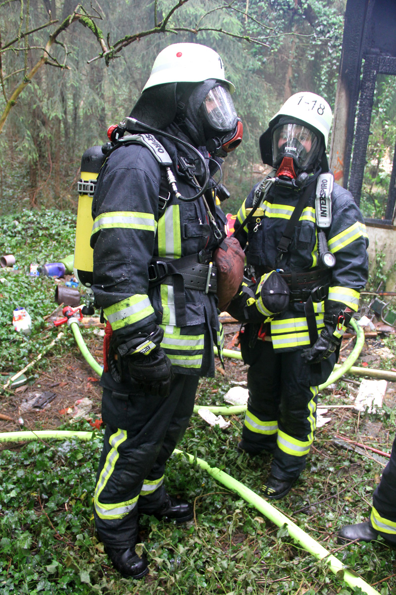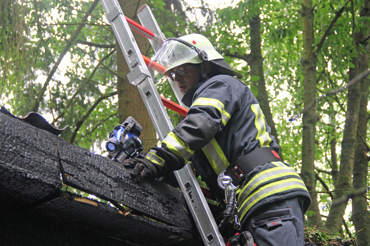 Mit einer Wärmebildkamera wurden die verkohlten Reste mehrfach kontrolliert, damit keine Brandnester übersehen wurden. Da der versiegelte Boden der Hütte einen Übertritt ins Erdreich verhinderte, konnte Löschschaum eingesetzt werden, um ein Wiederaufflammen zu verhindern.