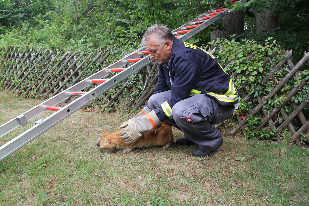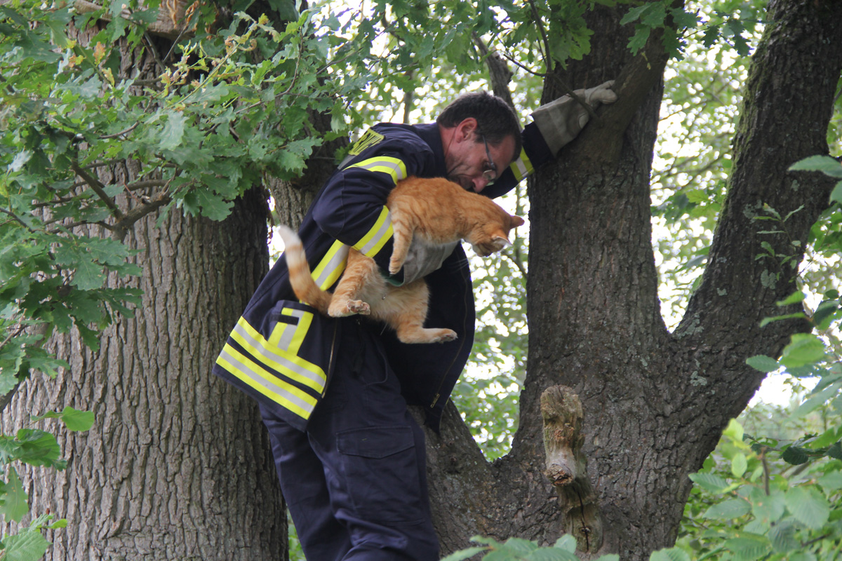 Mit einer Steckleiter wurde zuerst versucht, dem Fellnase eine Möglichkeit zu bieten, aus eigener Kraft wieder auf sicheren Boden zu kommen. Doch die Katze war zu verängstigt und traute sich nicht herunter. Schließlich stieg ein Feuerwehrmann zu dem Tier in den Baum und schnappte es mit einem beherzten Griff.