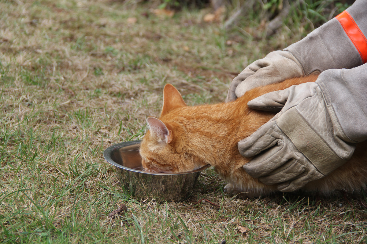 Nachbarn hatten bereits eine Schale mit Katzenfutter bereitgestellt, an der sich das entkräftete Tier erstmal stärken konnte. Ohne sich weiter um seine Retter zu kümmern rannte sie schließlich davon und nutze ihre wiedergewonnene Freiheit.