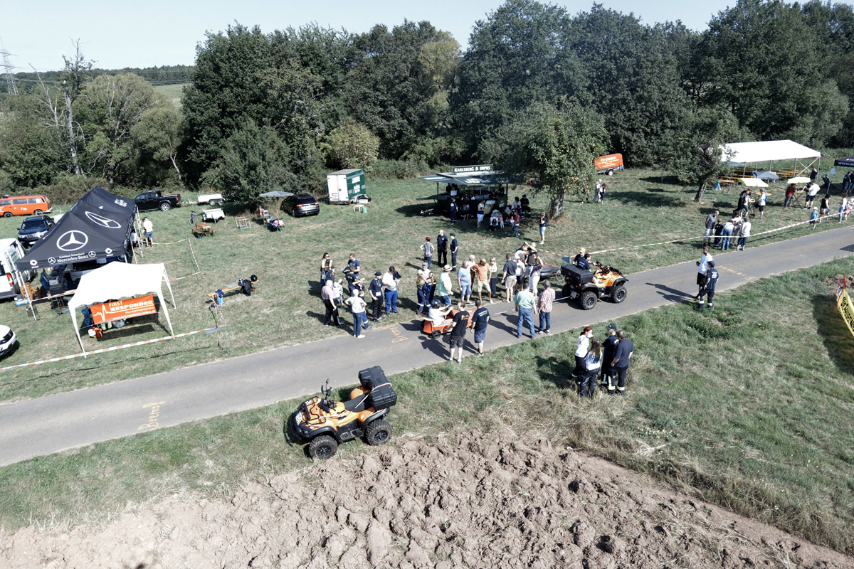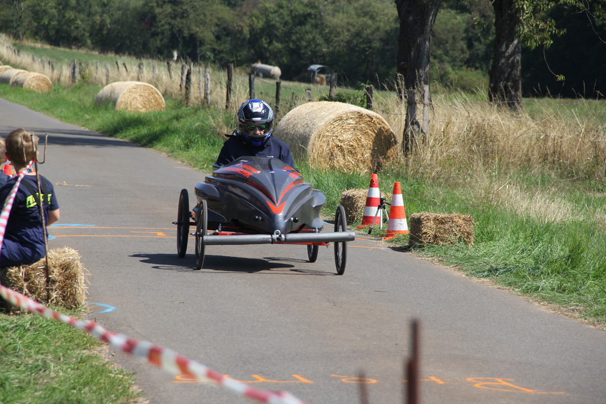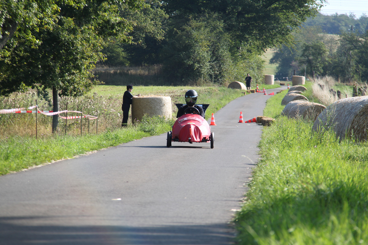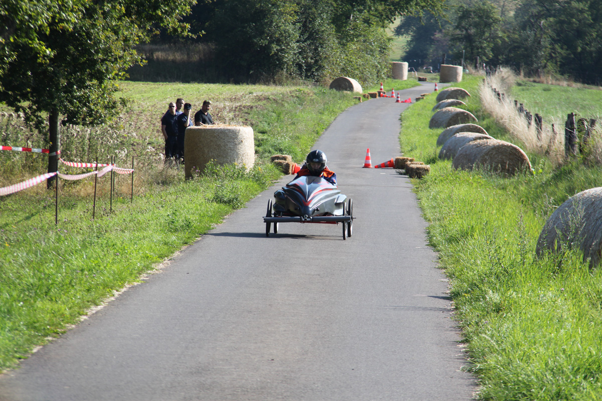 Für die rund 500m lange Rennstrecke wurde ein Feldweg in der Verlängerung der Wendelinusstraße abgesperrt. Bis zum höchsten Punkt ließen sich die Pilotinnen und Piloten mit Quads ziehen und erreichten bei der anschließenden Abfahrt Spitzengeschwindigkeiten von bis zu 60km/h.