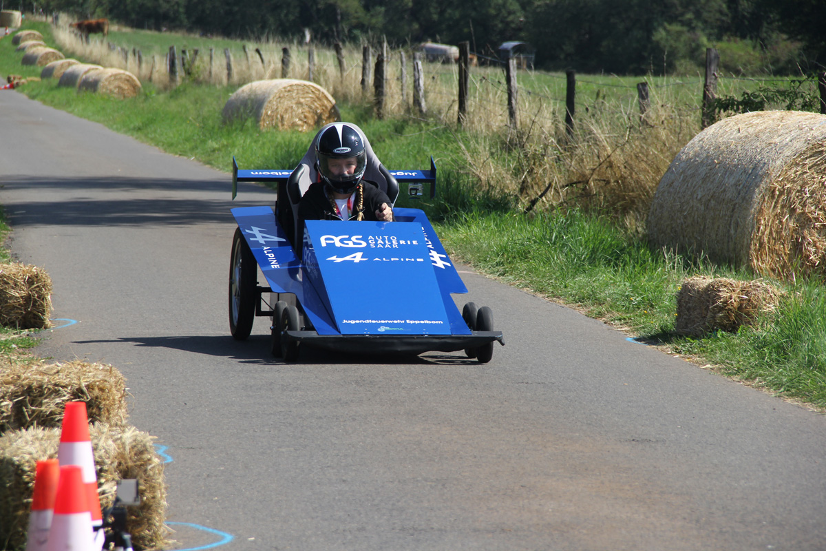 43 Jugendfeuerwehrleute und Aktive Kameraden teilten sich vier Fahrzeuge, zwischen 29 und 50 Sekunden dauerte die Abfahrt vorbei an jubelnden, anfeuernden Kameraden, Eltern und Freunden. Gestartet wurde dabei in drei Altersklassen, um auch den Jüngsten eine faire Chance zu bieten. Abgesichert wurde das Rennen von einem Team der First Responder Humes.