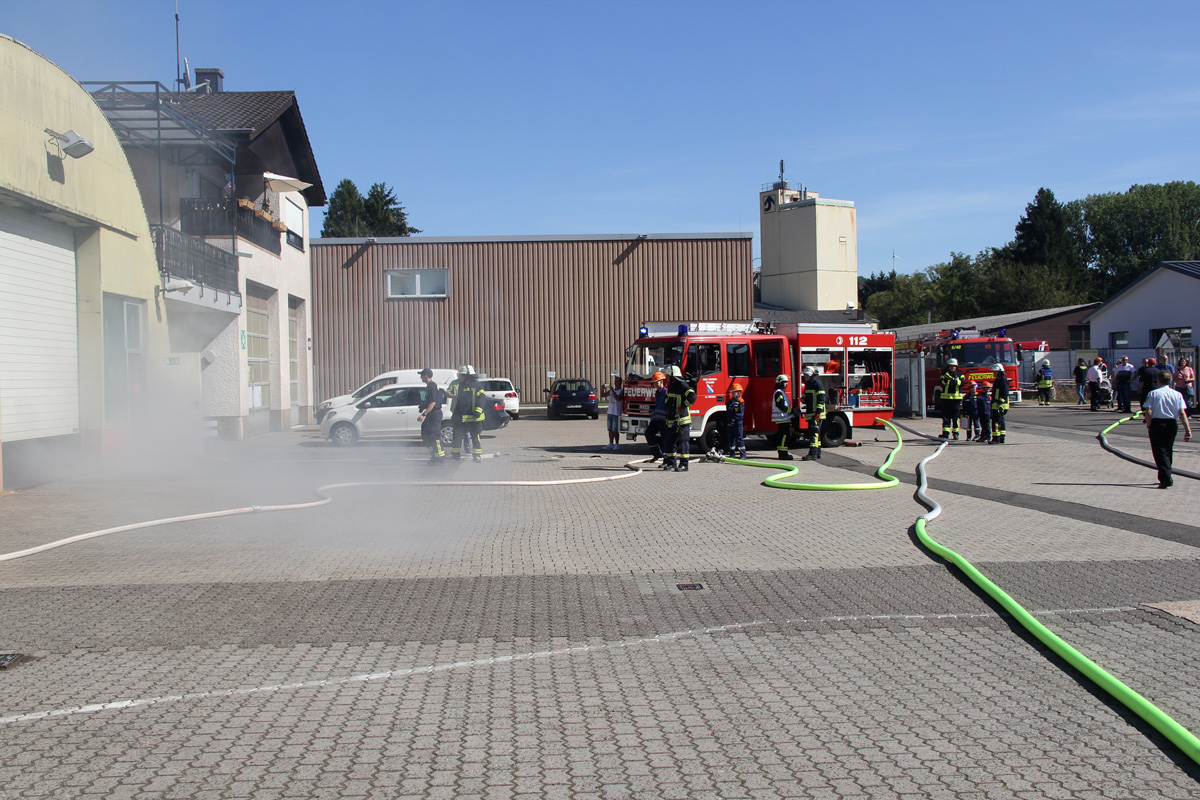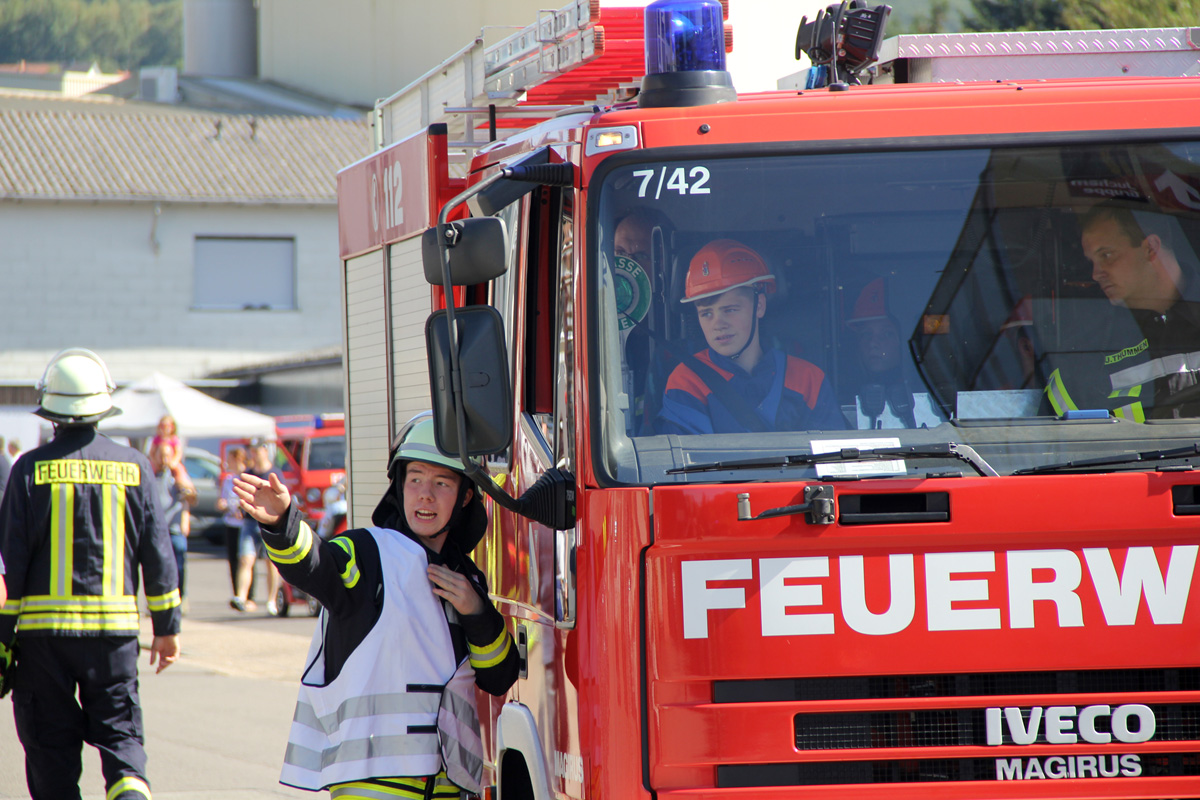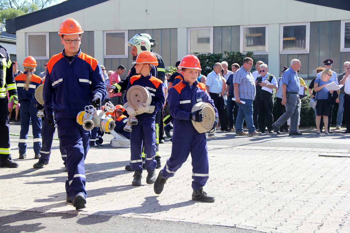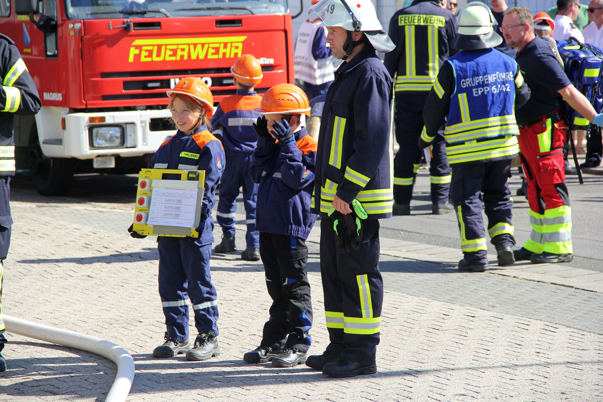 Gegen 14:00 Uhr begann die Übung für die rund 80 Jugendlichen im Alter zwischen 8 und 16 Jahren mit einem Sirenenalarm. Kurz darauf rückten sie dann mit Blaulicht und Martinshorn am Einsatzort im Eppelborner Industriegelände an. Zahlreiche Eltern und Verwandte sowie interessierte Bürgerinnen und Bürger warteten dort bereits gespannt.