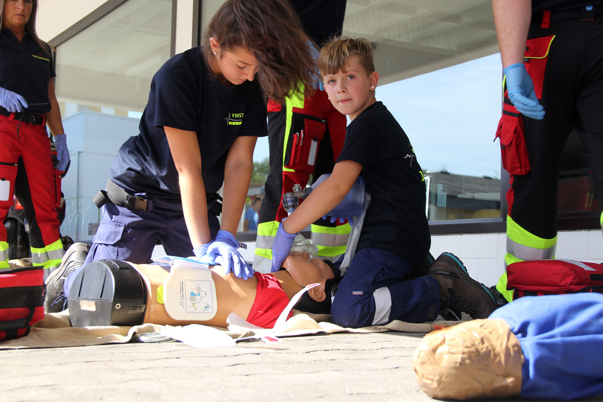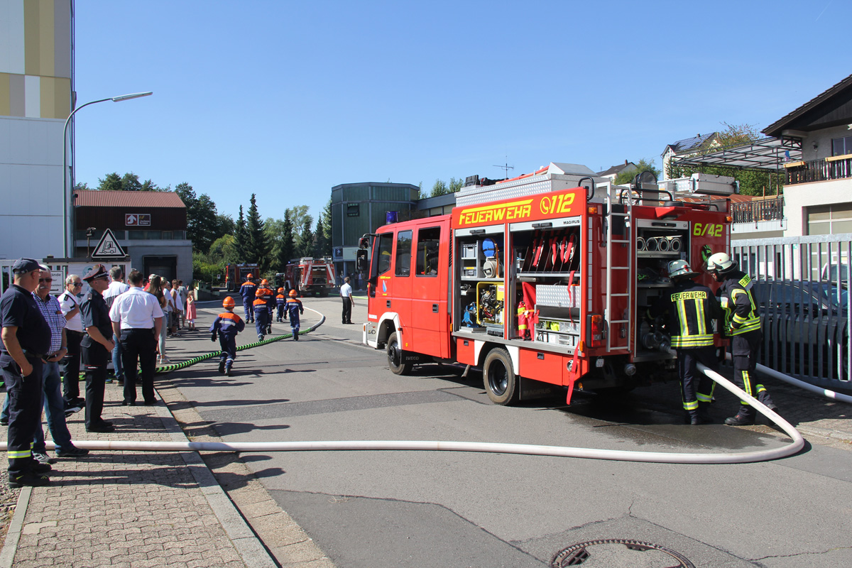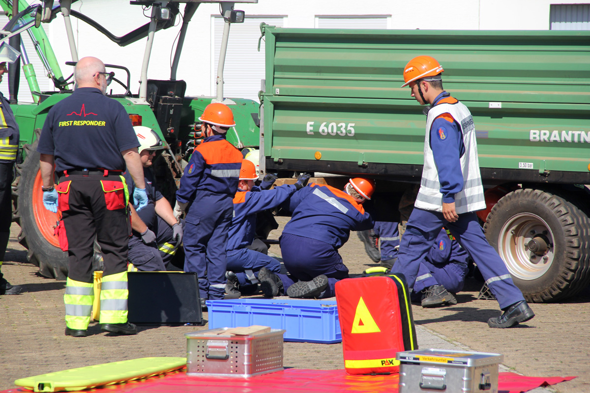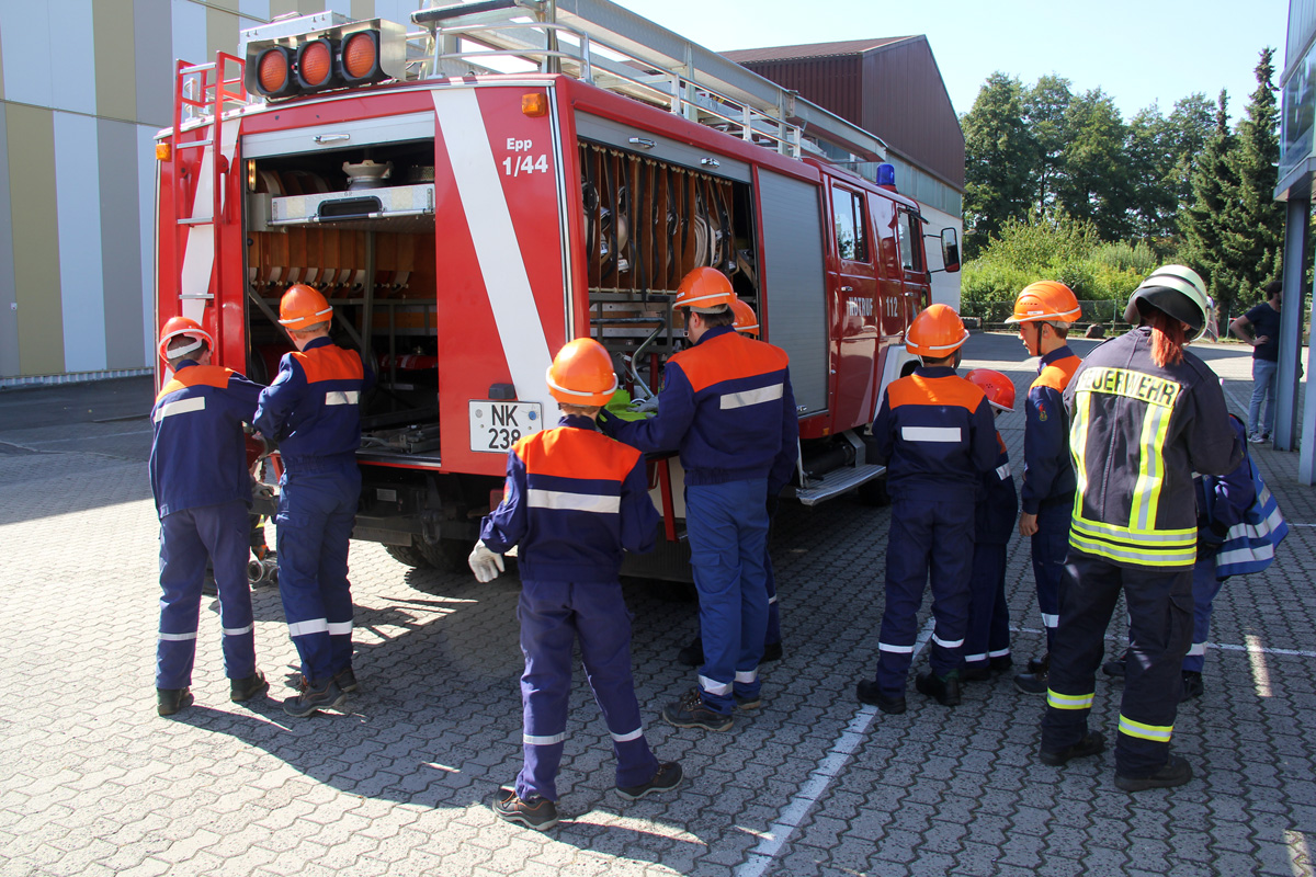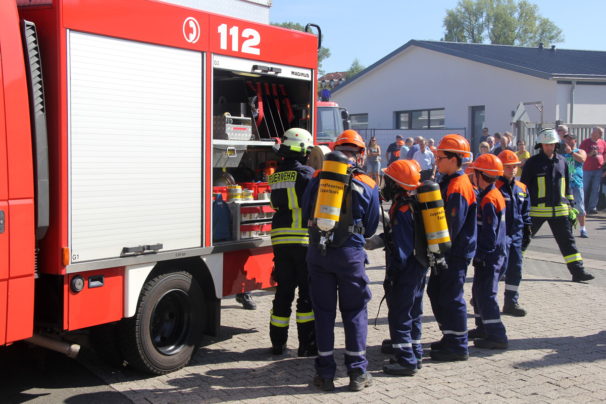 Gegen 14:00 Uhr begann die Übung für die rund 80 Jugendlichen im Alter zwischen 8 und 16 Jahren mit einem Sirenenalarm. Kurz darauf rückten sie dann mit Blaulicht und Martinshorn am Einsatzort im Eppelborner Industriegelände an. Zahlreiche Eltern und Verwandte sowie interessierte Bürgerinnen und Bürger warteten dort bereits gespannt.