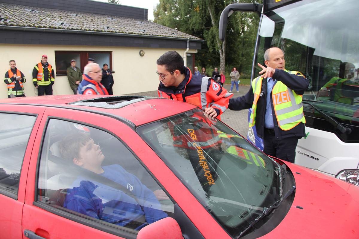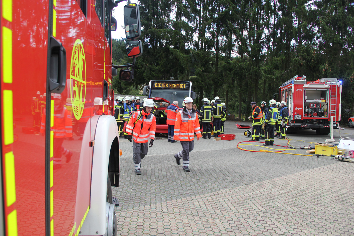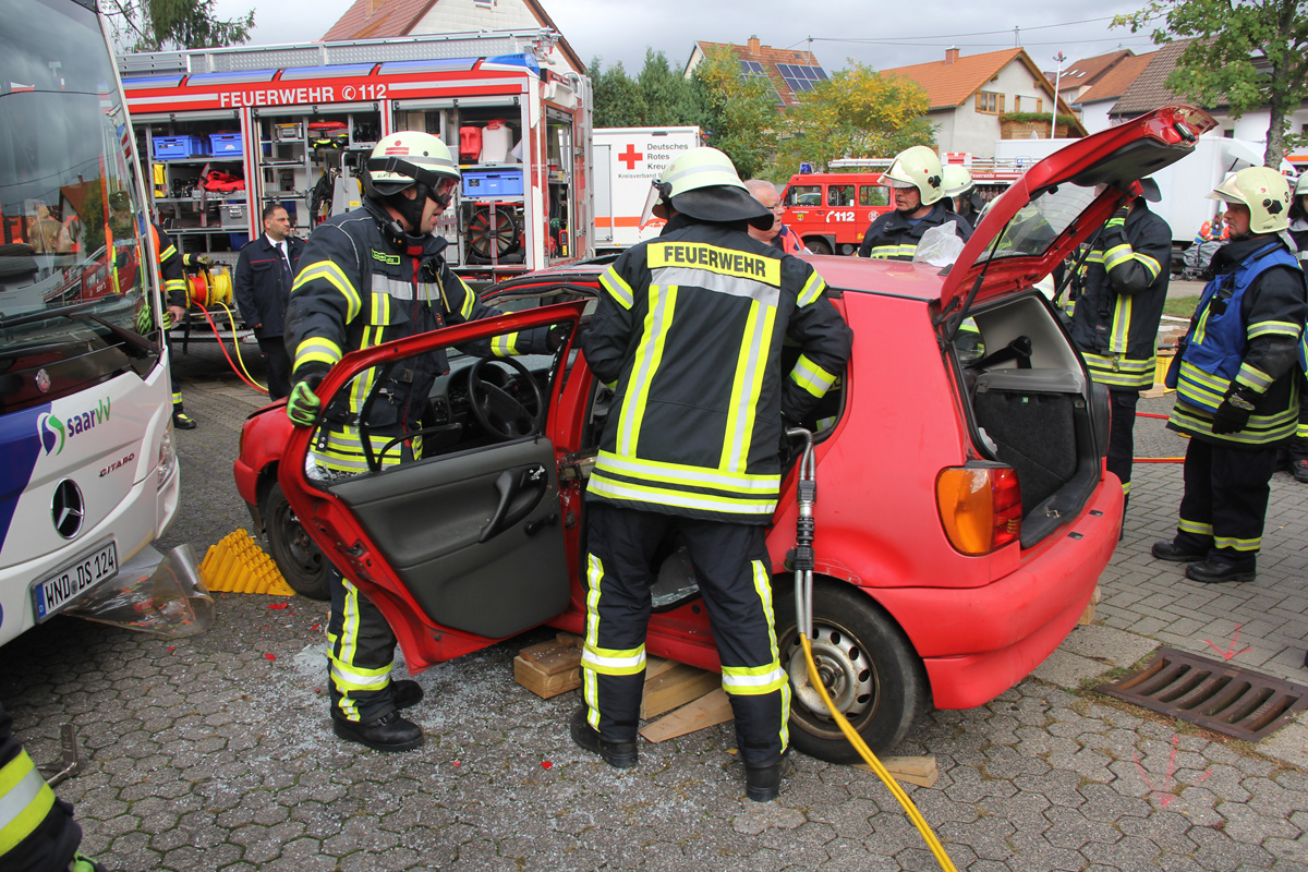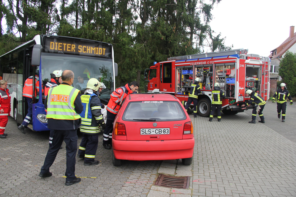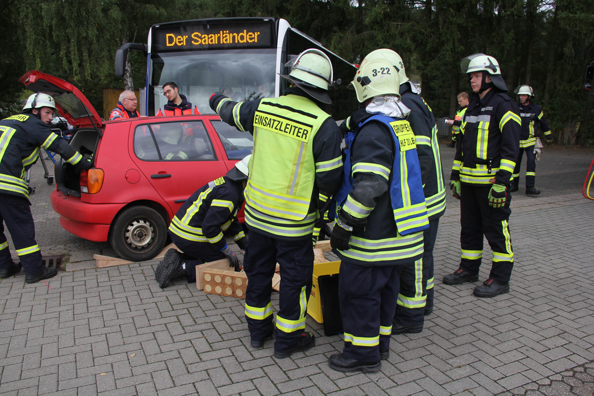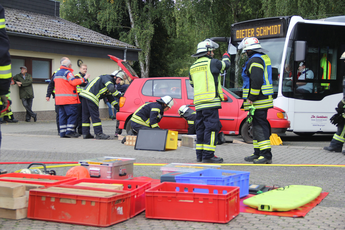 Mehrere Verletzte nach einem Unfall zwischen einem Pkw und einem Linienbus war die Ausgangslage zu einer großen Übung im Ortsteil Dirmingen am 28. September 2019. Ein mit 12 Kindern besetzter Bus war mit einem Pkw kollidiert, in dem 2 Personen unterwegs waren. Der Busfahrer sowie die Kinder im Bus waren bei dem Unfall zum Teil schwer verletzt worden, die beiden Pkw-Insassen waren in ihrem Fahrzeug eingeklemmt.