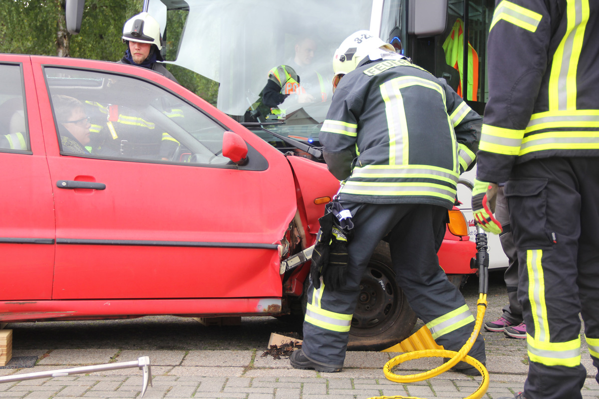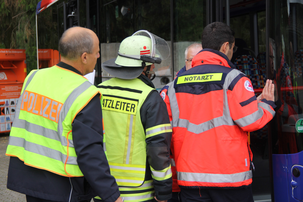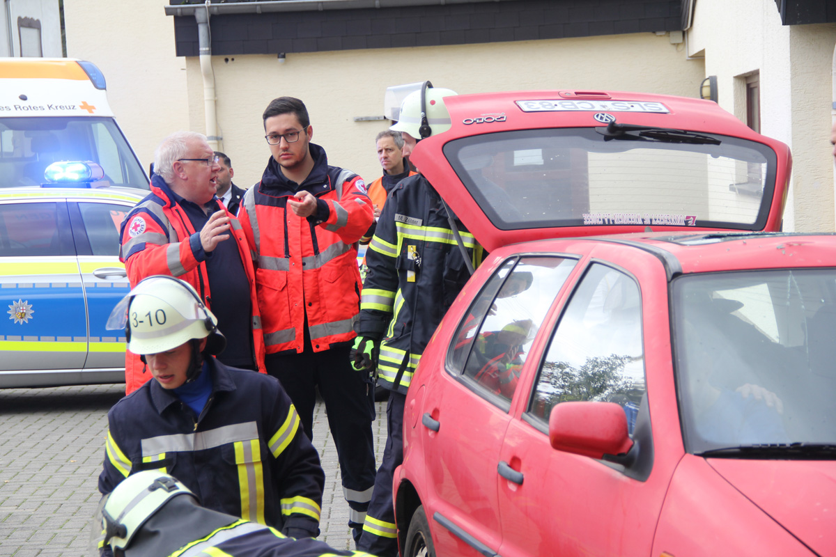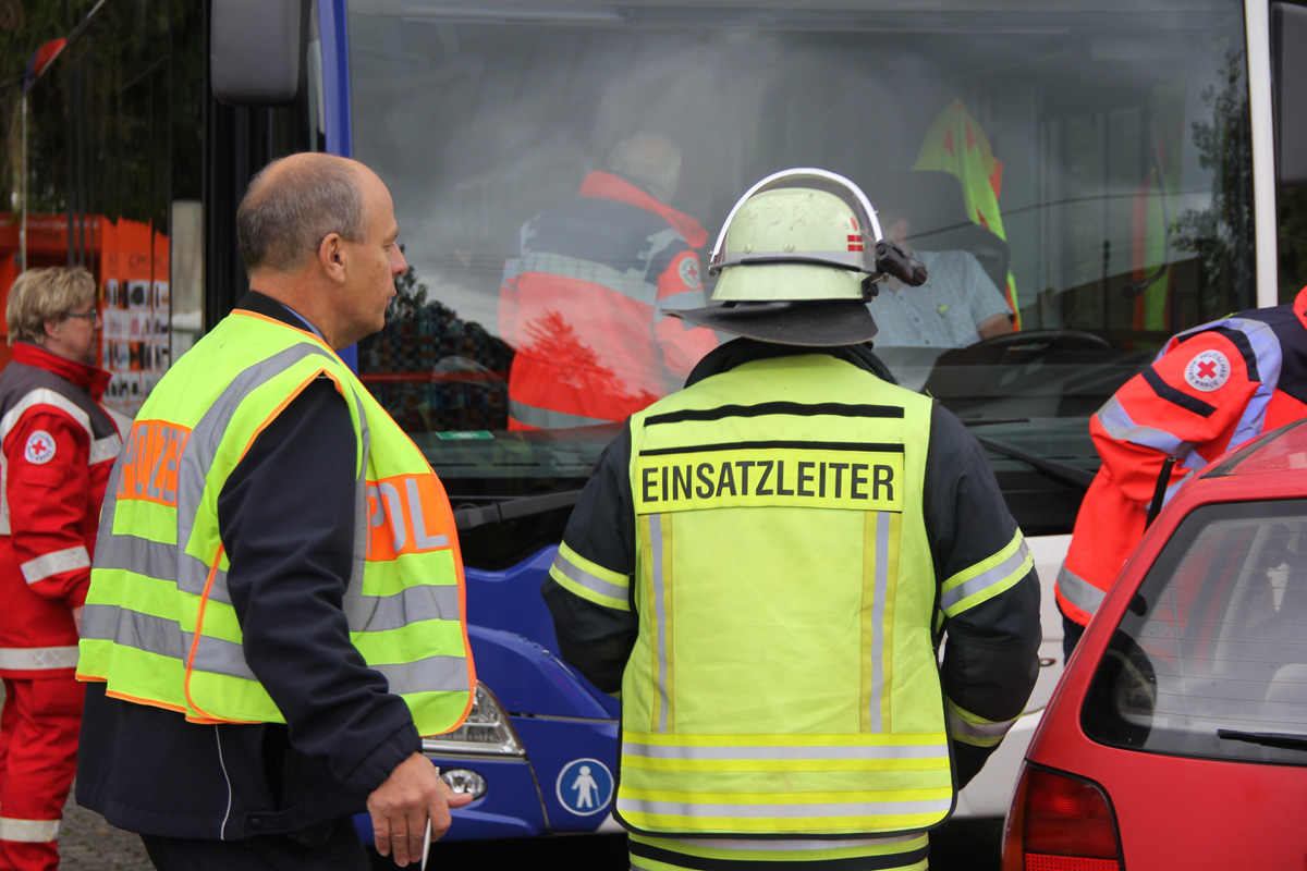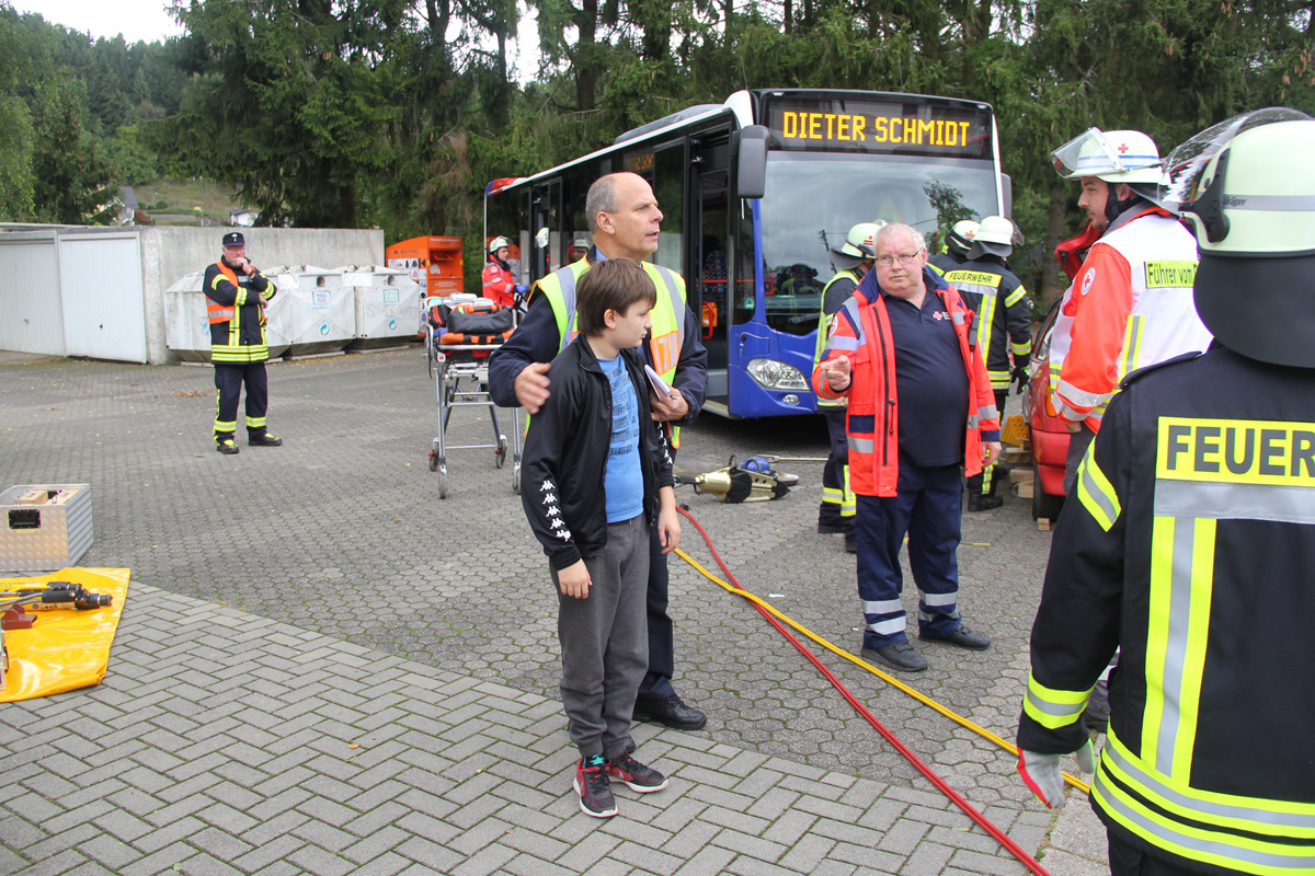 Mehrere Verletzte nach einem Unfall zwischen einem Pkw und einem Linienbus war die Ausgangslage zu einer großen Übung im Ortsteil Dirmingen am 28. September 2019. Ein mit 12 Kindern besetzter Bus war mit einem Pkw kollidiert, in dem 2 Personen unterwegs waren. Der Busfahrer sowie die Kinder im Bus waren bei dem Unfall zum Teil schwer verletzt worden, die beiden Pkw-Insassen waren in ihrem Fahrzeug eingeklemmt.