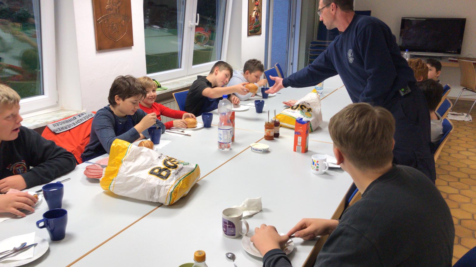 Fabian Schorr war derweil damit beschäftigt ein Essen für die Kinder zu kochen. Es gab hier Nudeln mit Hackfleischsoße. Ein Mannschaftsteil deckte die Tische ein, der andere Mannschaftsteil war nach dem Essen mit Spüldienst dran.