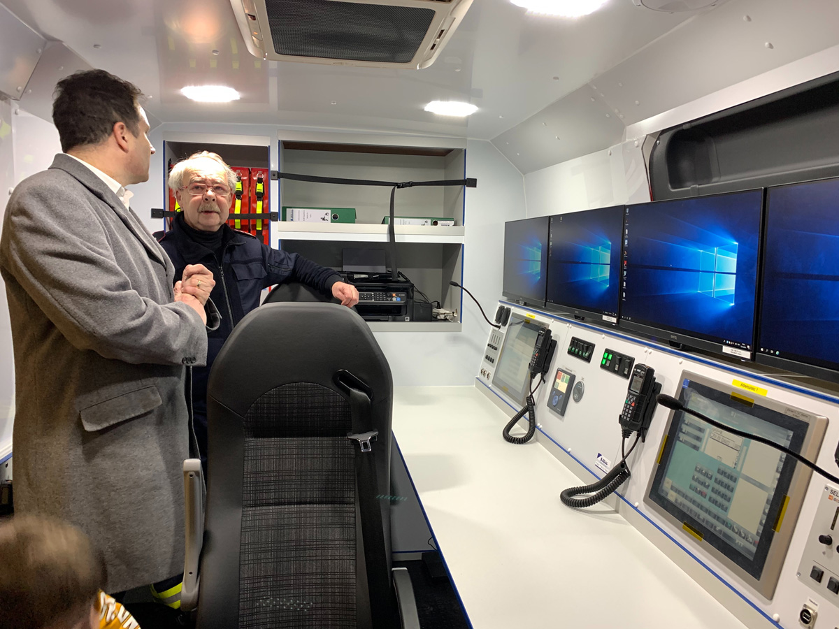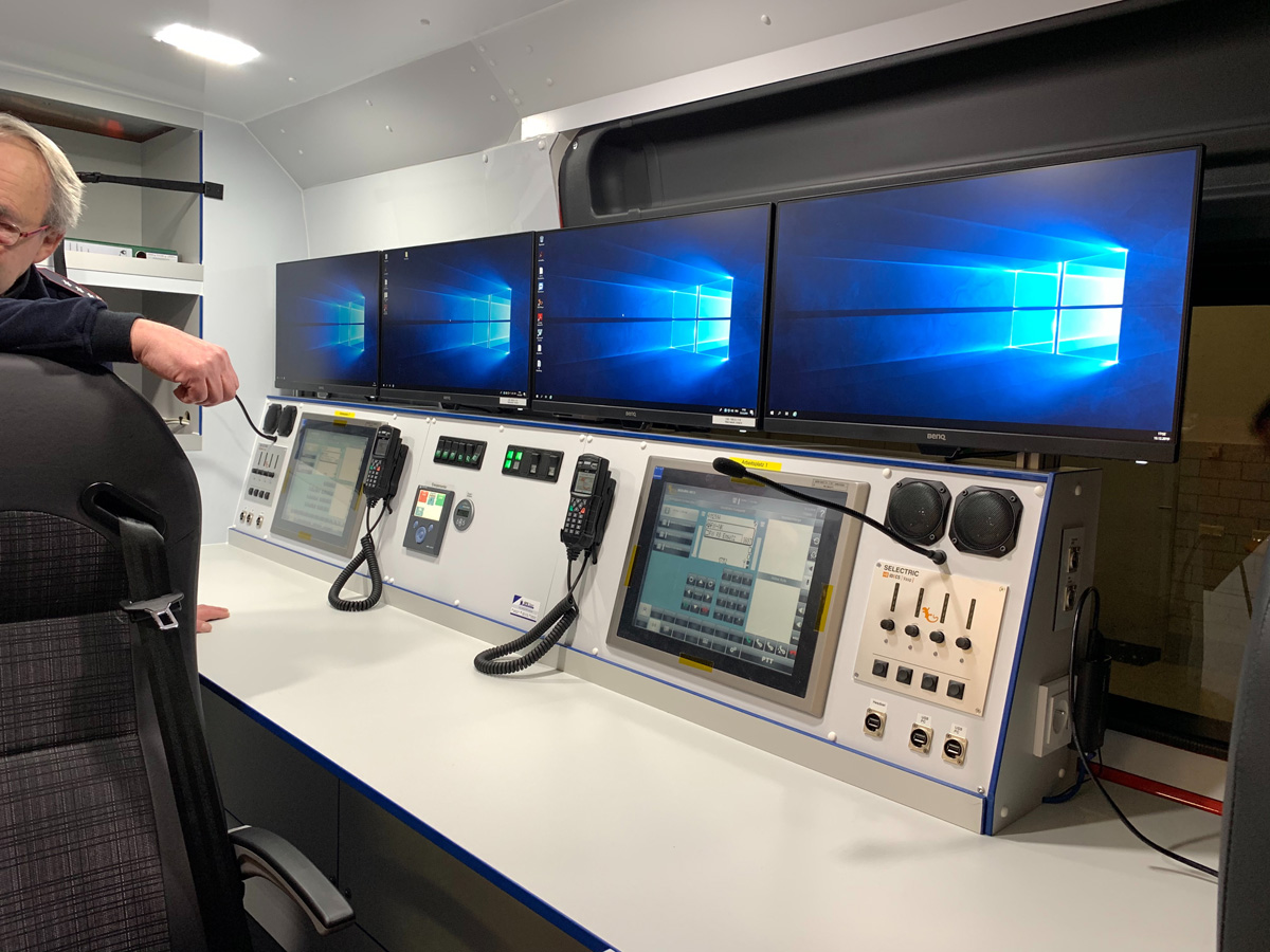 Der neue Einsatzleitwagen bietet zwei mit moderner Technik ausgerüstete Arbeitsplätze. Die Hauptaufgabe dieses Fahrzeugs im Einsatzgeschehen ist die Unterstützung des Einsatzleiters mit Technik und Personal zur Kommunikation und Dokumentation, Informationsbeschaffung und Koordination der Einsatzkräfte.