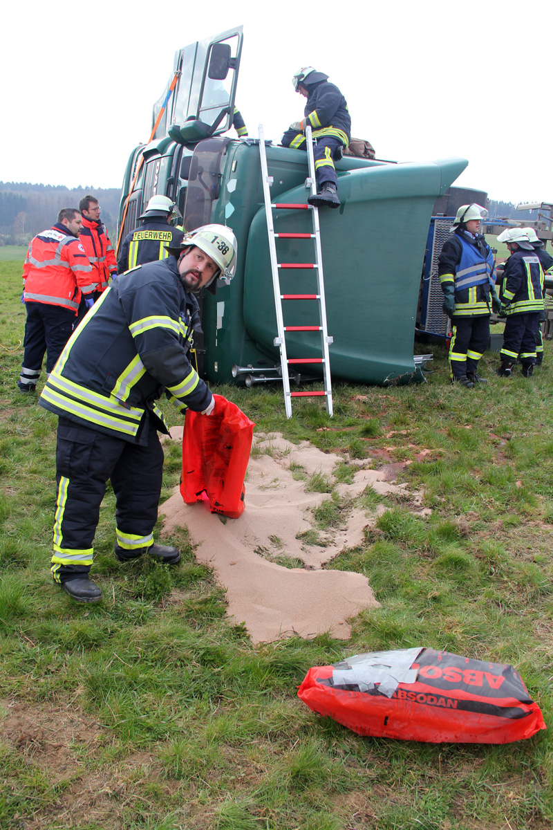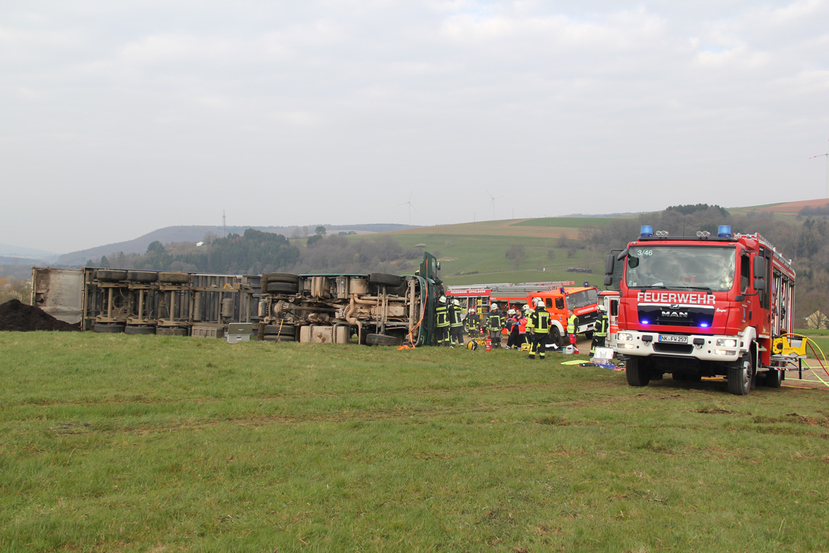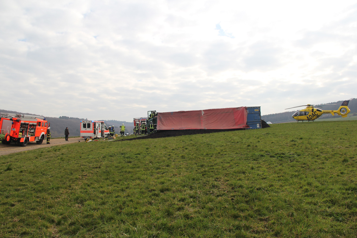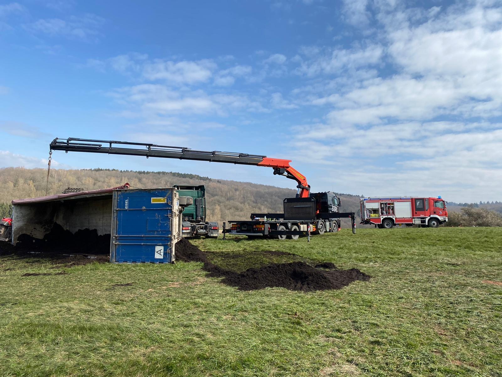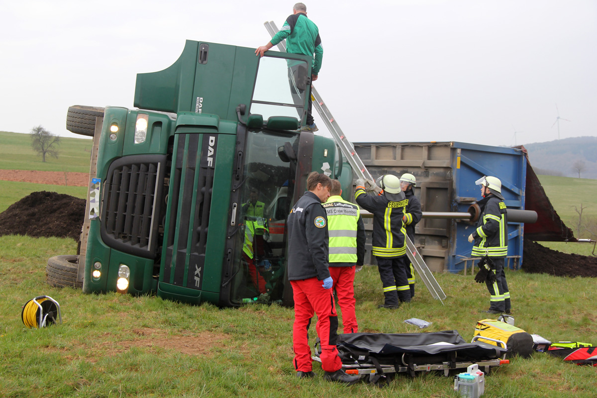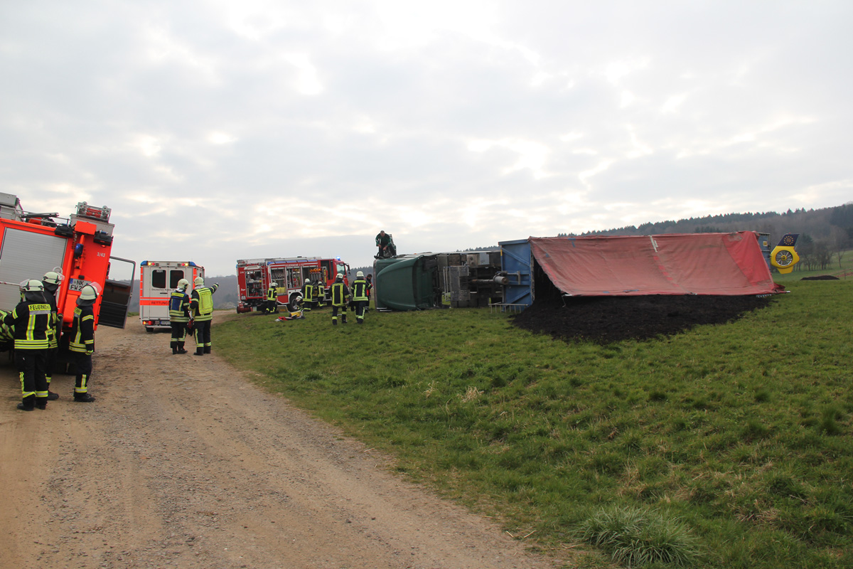 Beim Abladen von Mutterboden kippte am Morgen des 03. April 2020 ein Sattelschlepper auf schrägen Wiesengrund zur Seite. Dabei wurde der Fahrer verletzt und im Führerhaus eingeschlossen. Spaziergängen, die Zeuge des Unfalls wurden, alarmierten umgehend Feuerwehr und Rettungsdienst.