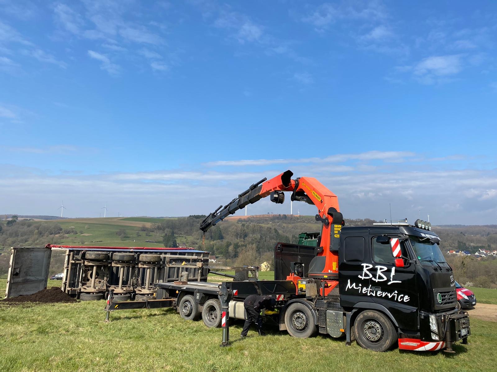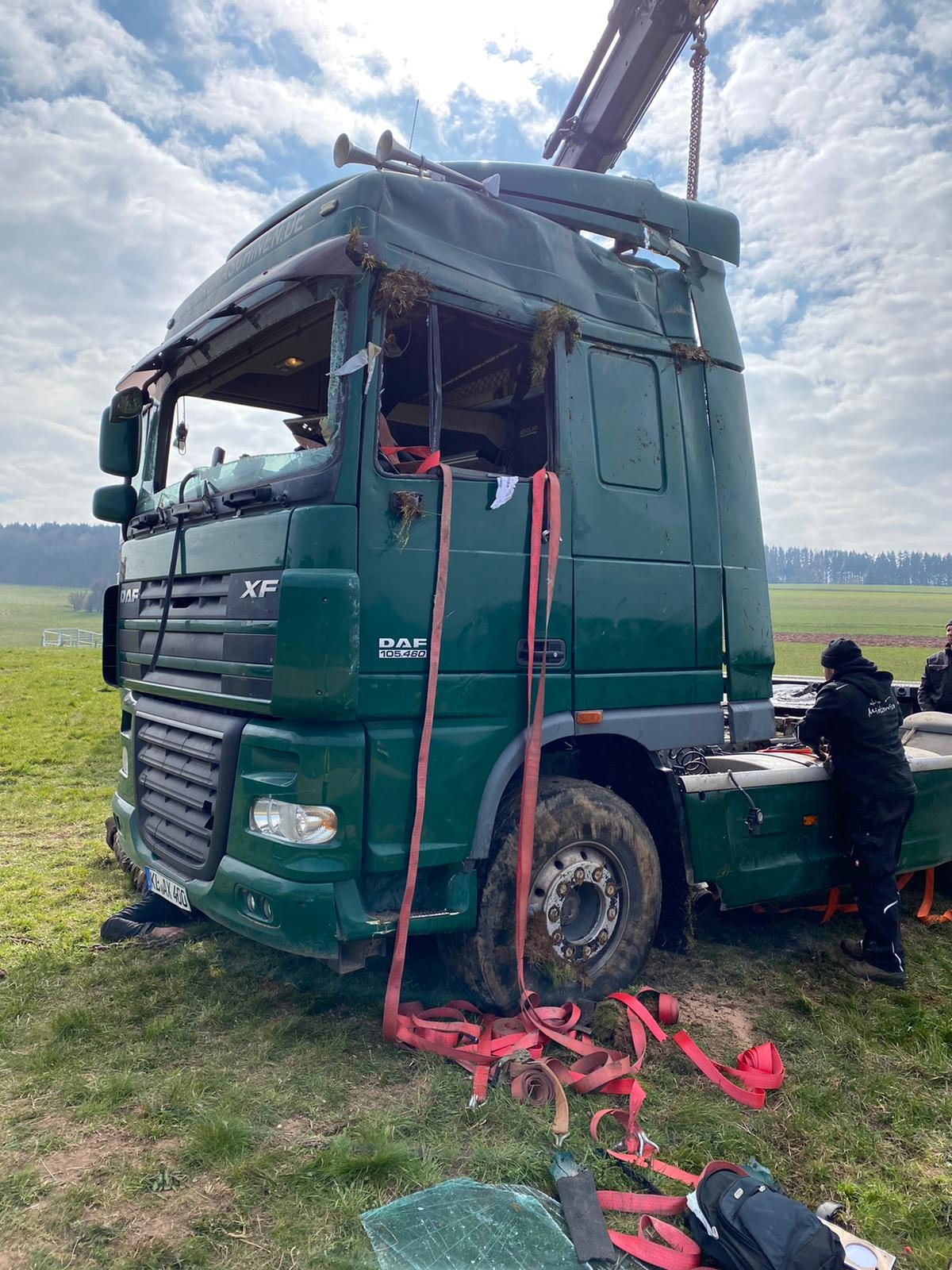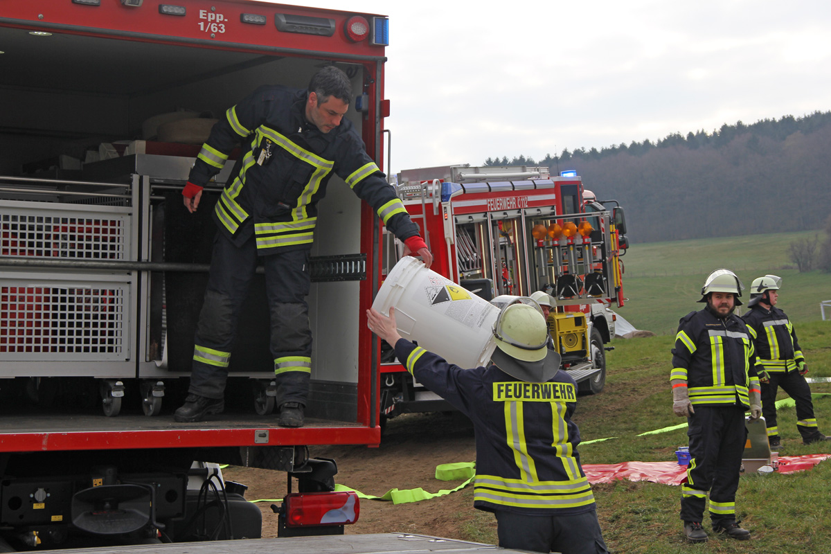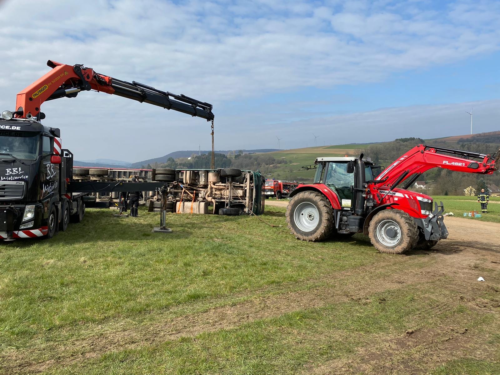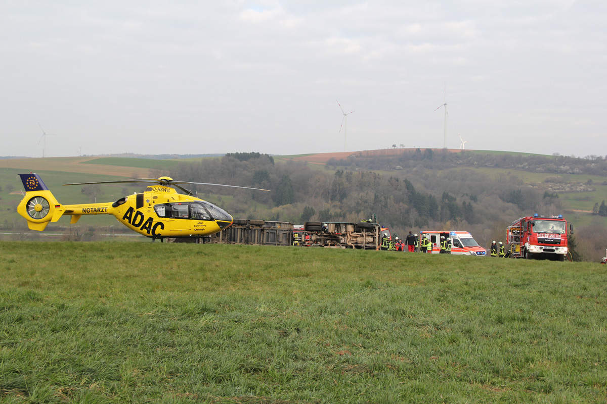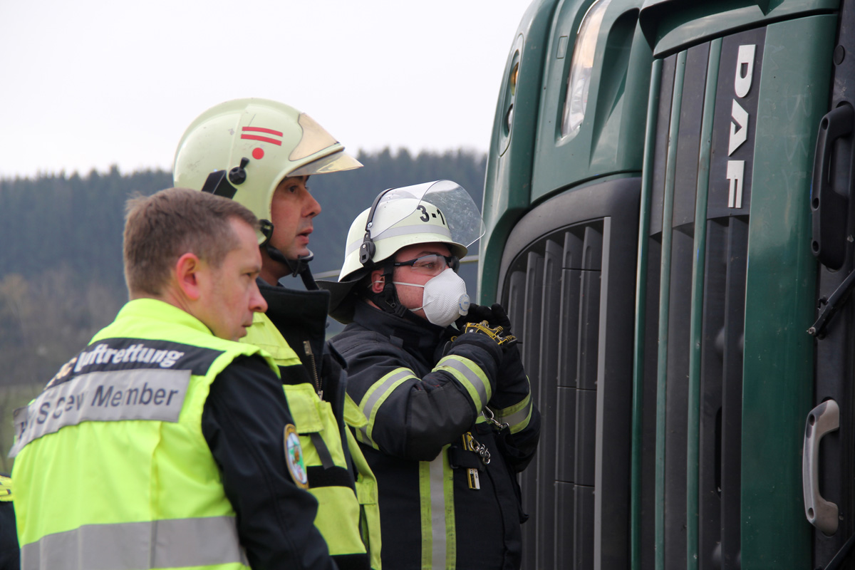 Beim Abladen von Mutterboden kippte am Morgen des 03. April 2020 ein Sattelschlepper auf schrägen Wiesengrund zur Seite. Dabei wurde der Fahrer verletzt und im Führerhaus eingeschlossen. Spaziergängen, die Zeuge des Unfalls wurden, alarmierten umgehend Feuerwehr und Rettungsdienst.