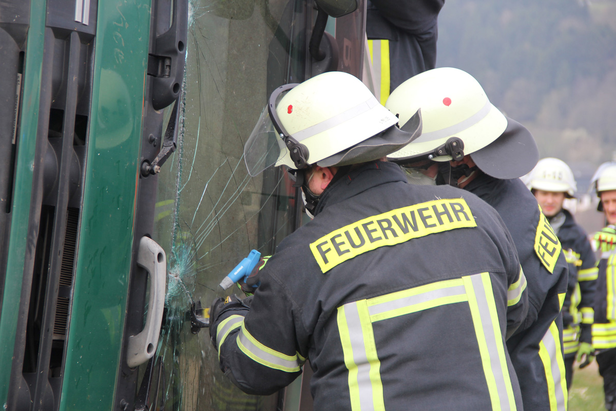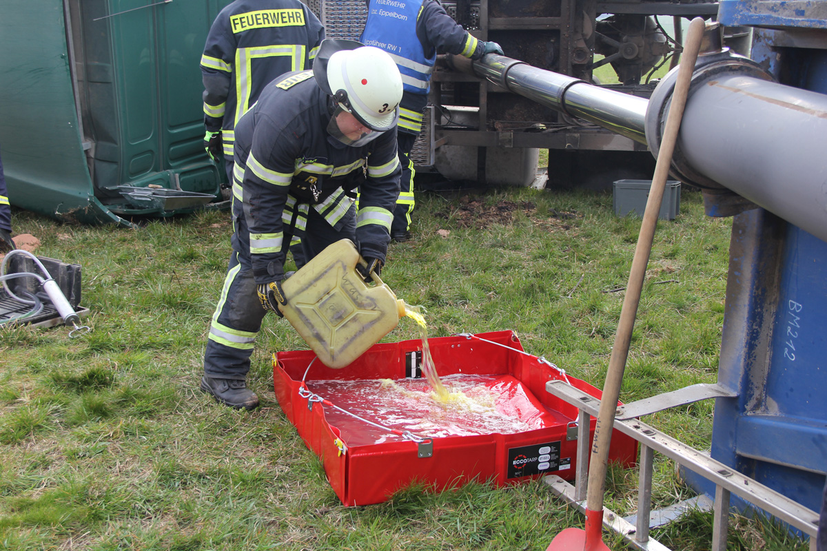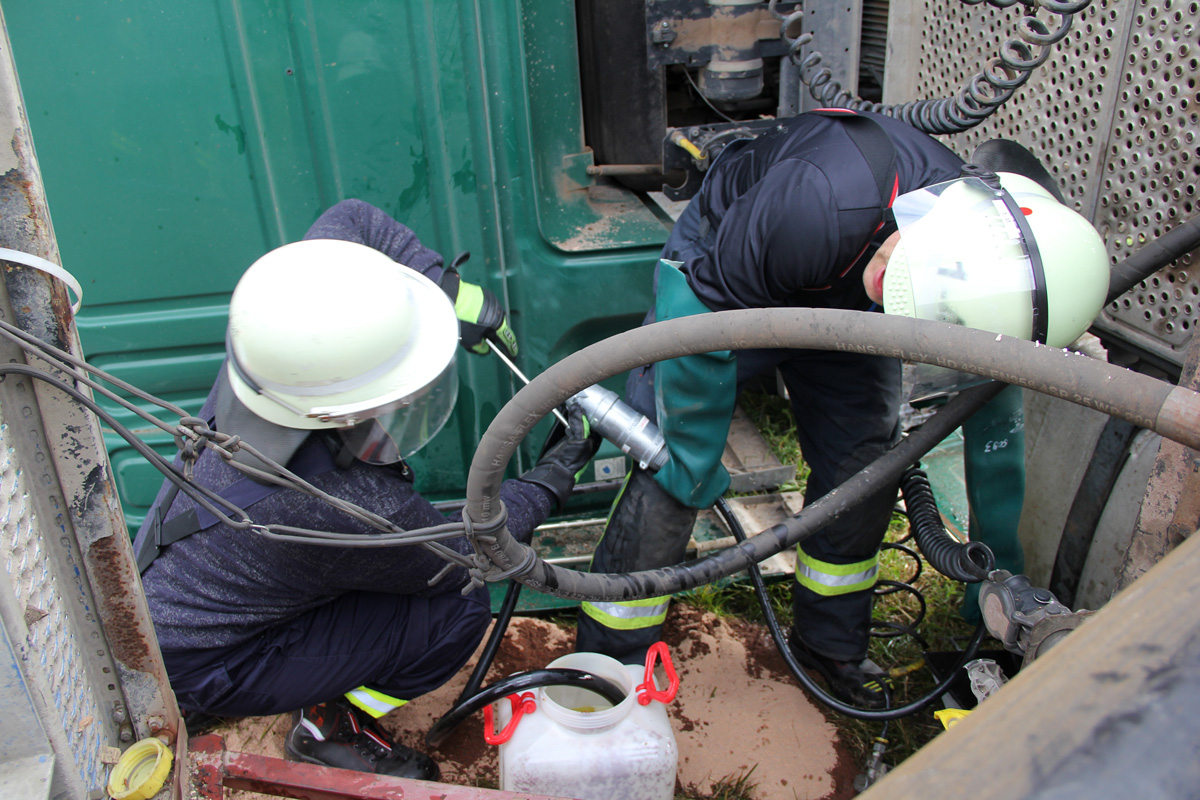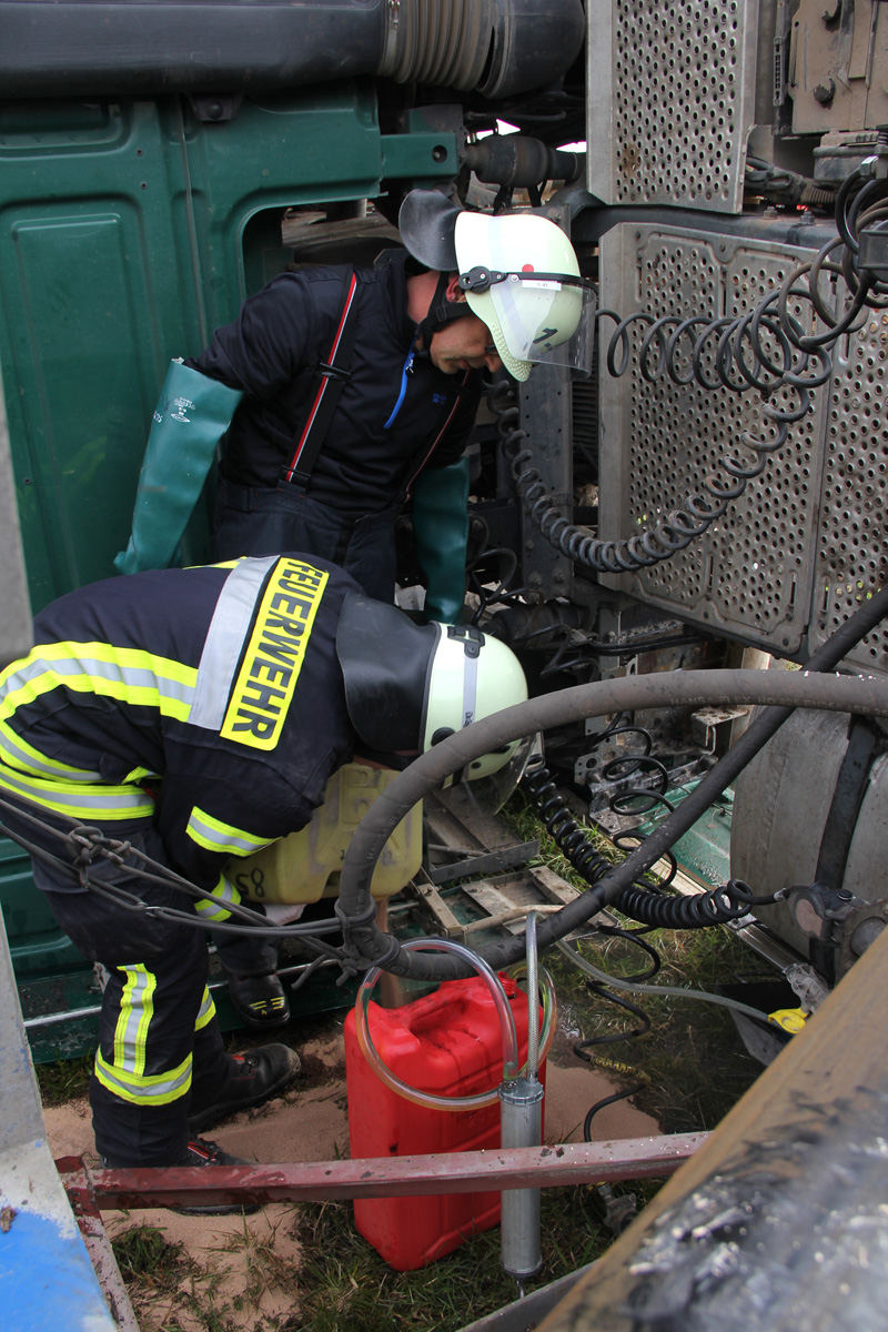 Die Einsatzkräfte der Feuerwehr sorgten mit Leitern für einen Zugang zum Patienten. Zur Befreiung musste dann die Frontscheibe herausgetrennt werden. Auslaufender Kraftstoff aus den rund 600 Liter fassenden Tanks des Fahrzeugs musste mit Wannen aufgefangen und die Reste anschließend aus den beschädigten Tanks abgepumpt werden.