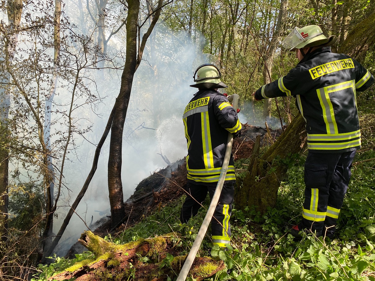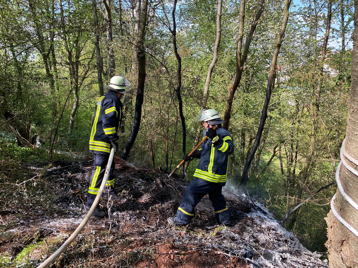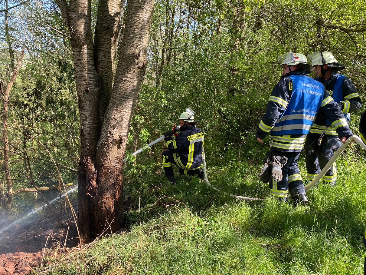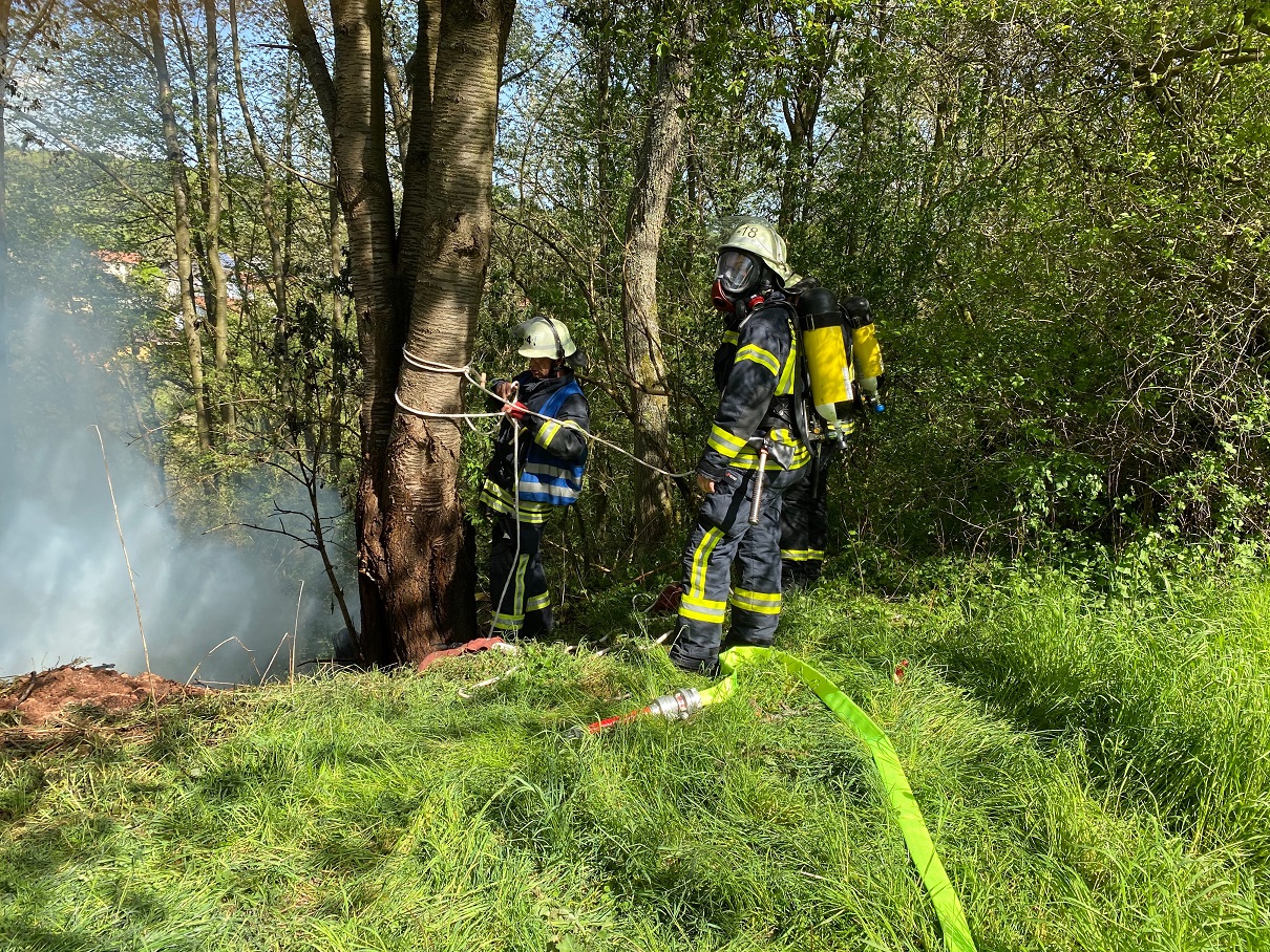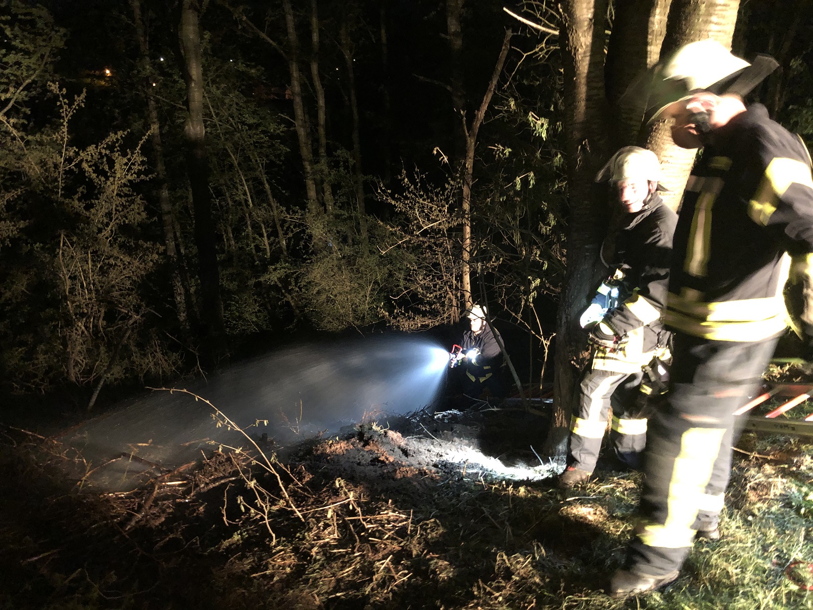 Sofort wurde der Brand unter Vornahme einer Löschangriffsleitung eingedämmt und die offenen Flammen abgelöscht, sodass sich das Feuer nicht weiter in das Waldstück ausbreiten konnte.